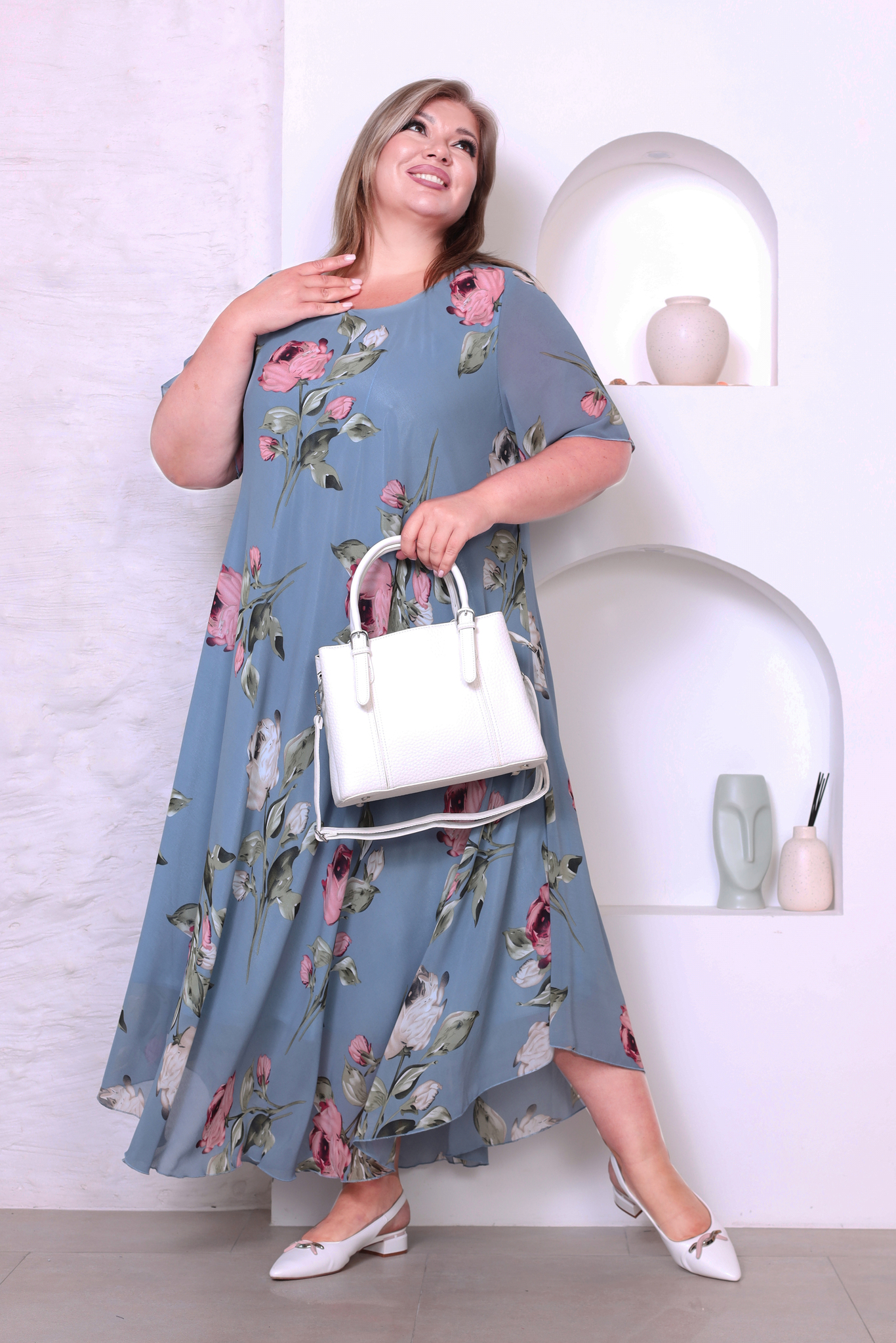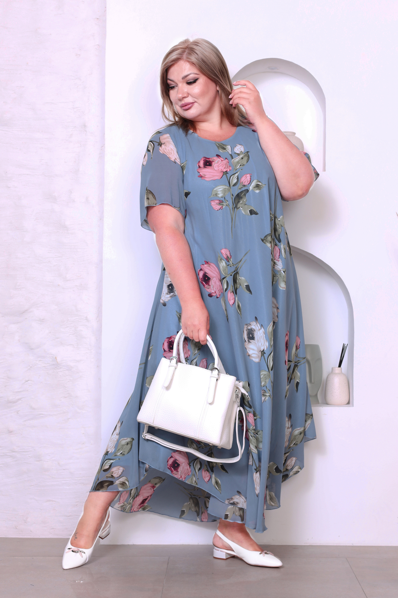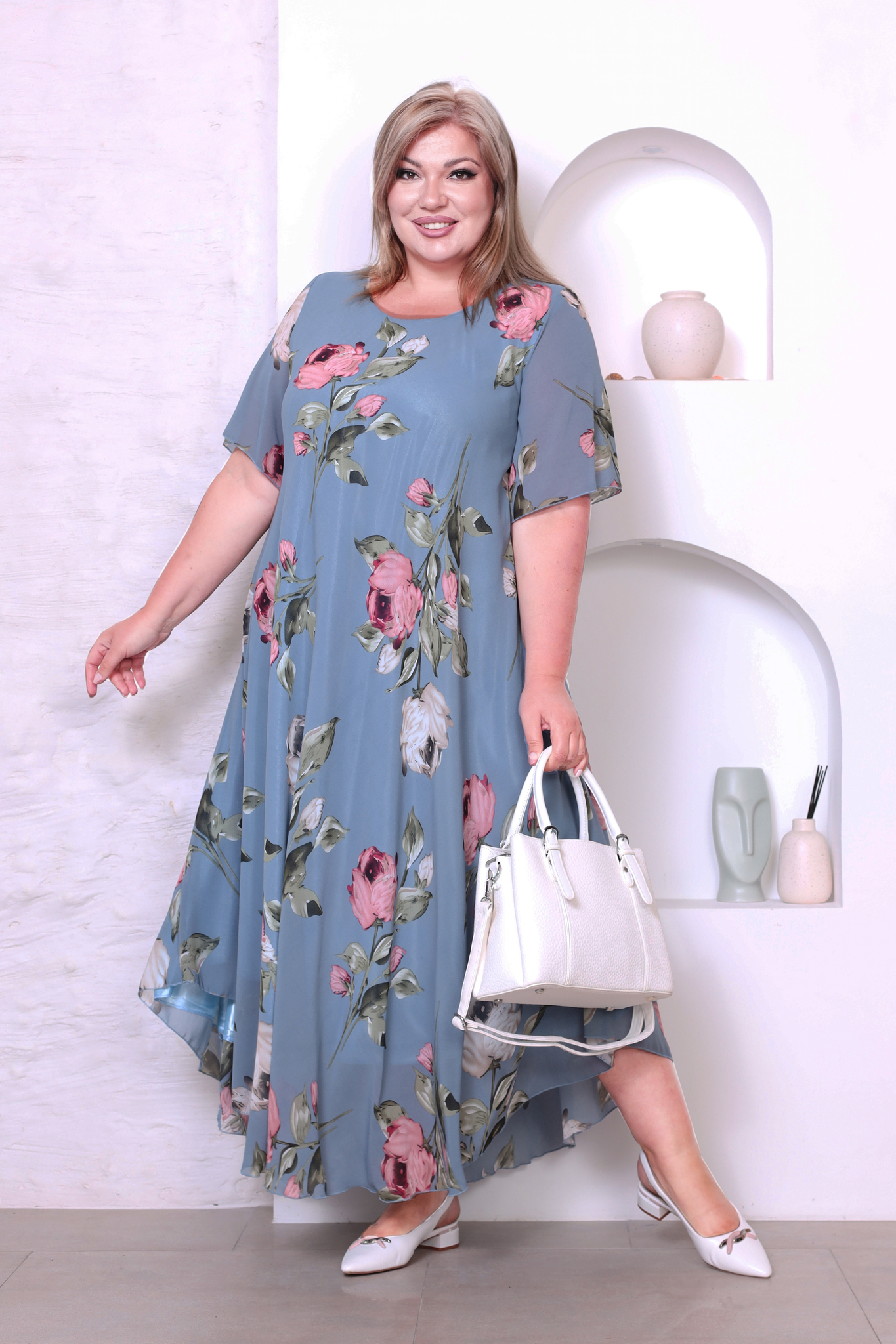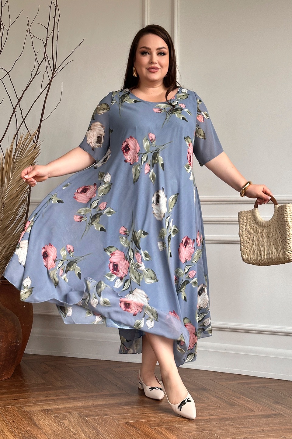 Элегантное платье миди из полупрозрачного шифона на подкладке. модель имеет широкий круглый вырез и короткие воздушные рукава. свободная юбка с асимметричными краями искусно обыгрывает фигуру и подчеркивает женственность образа. яркий цветочный принт добавляет нежности и романтичности.