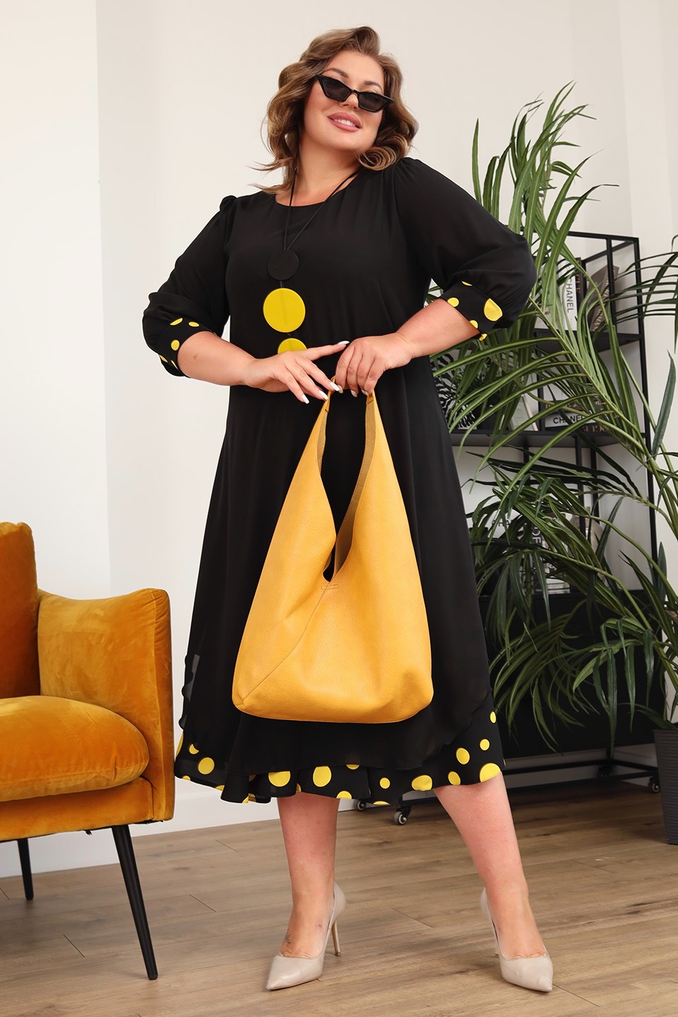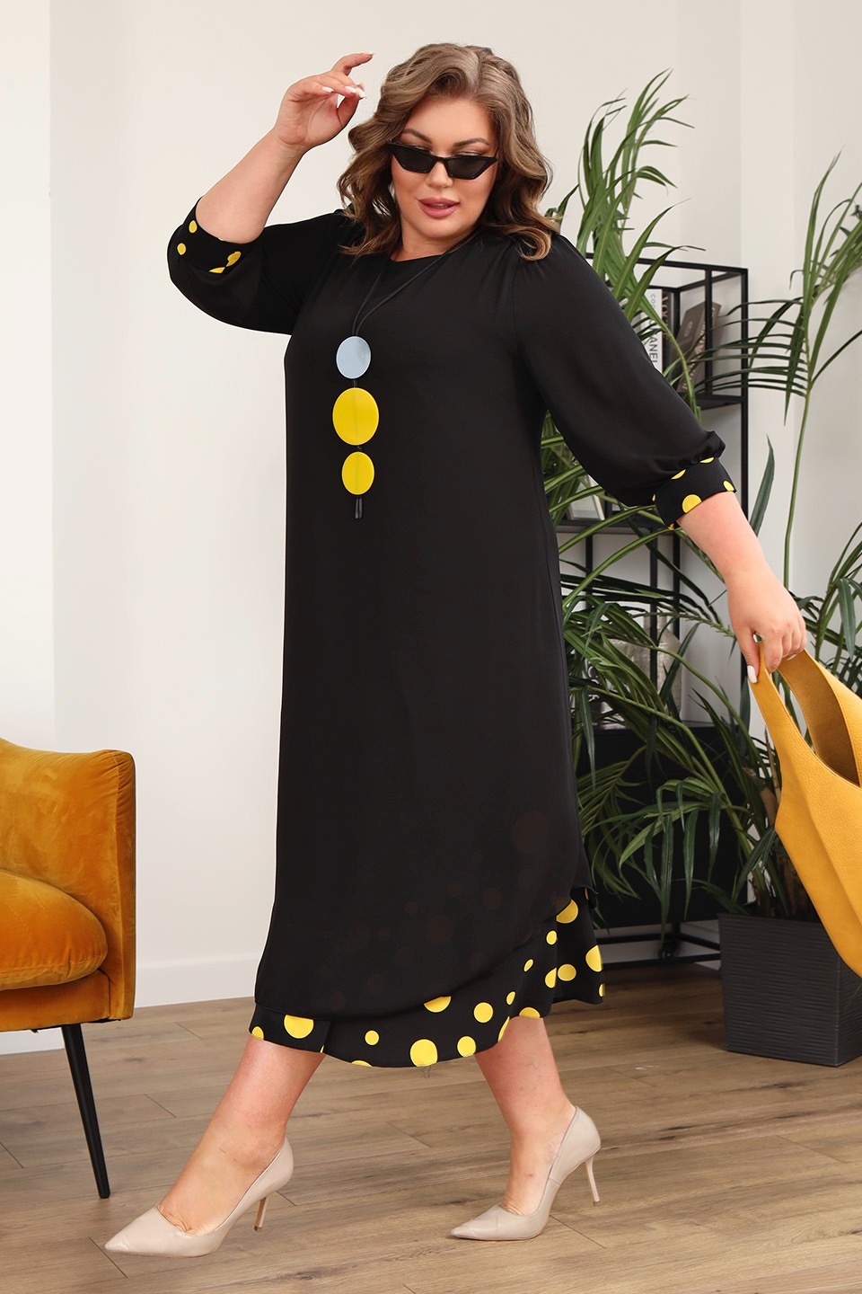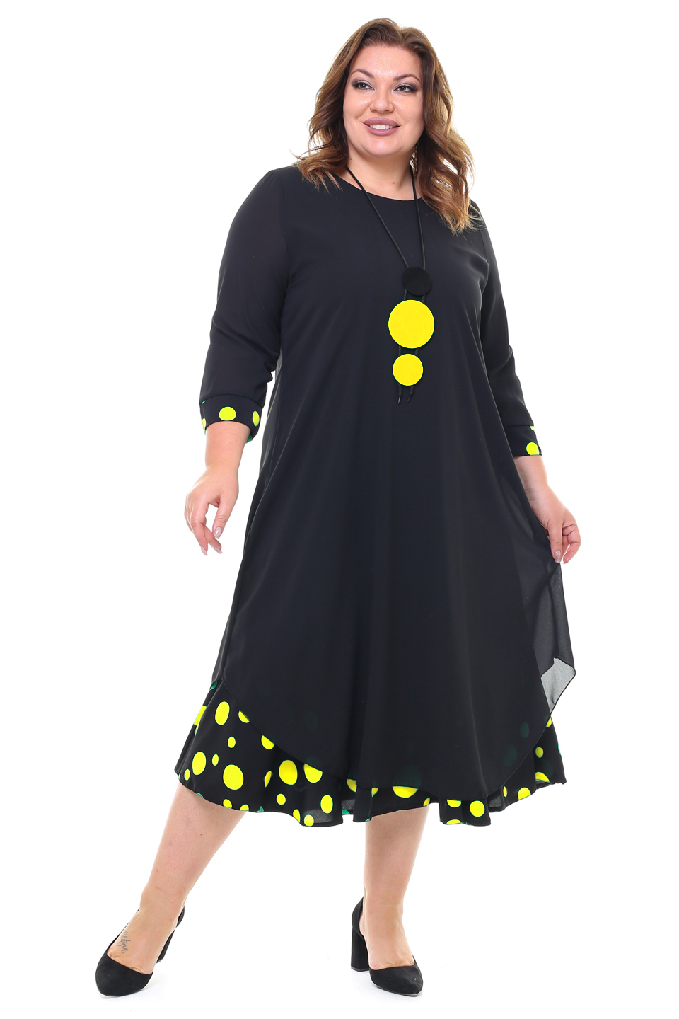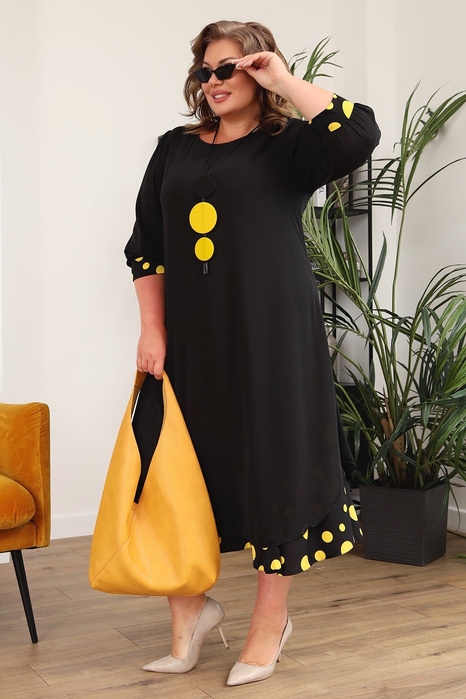 Элегантное платье мягкого материала на подкладке. модель имеет круглый вырез и рукава длиной 3/4, оформленные контрастным кантом по низу. свободная юбка верха с асимметричными краями искусно обыгрывает фигуру и подчеркивает женственность образа. подол нижней юбки с гороховым принтом придает модели женственности и романтизма. полуприлегающий силуэт искусно обыгрывает фигуру и визуально стройнит. нарядности добавляет оригинальное ожерелье. платье станет идеальным нарядом для любого повода. стильный клатч и туфли на каблуках станут идеальным дополнением к нарядному образу.