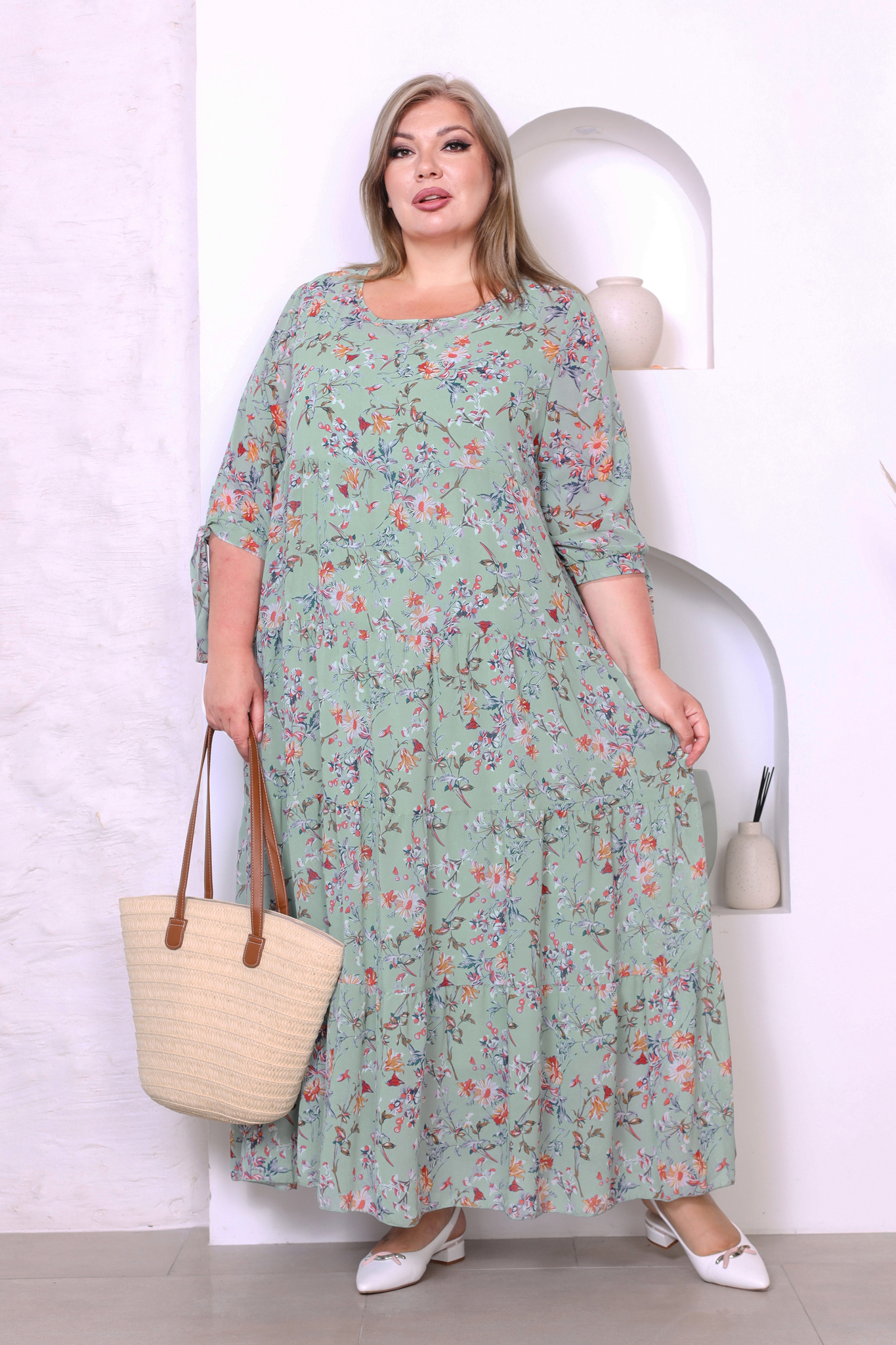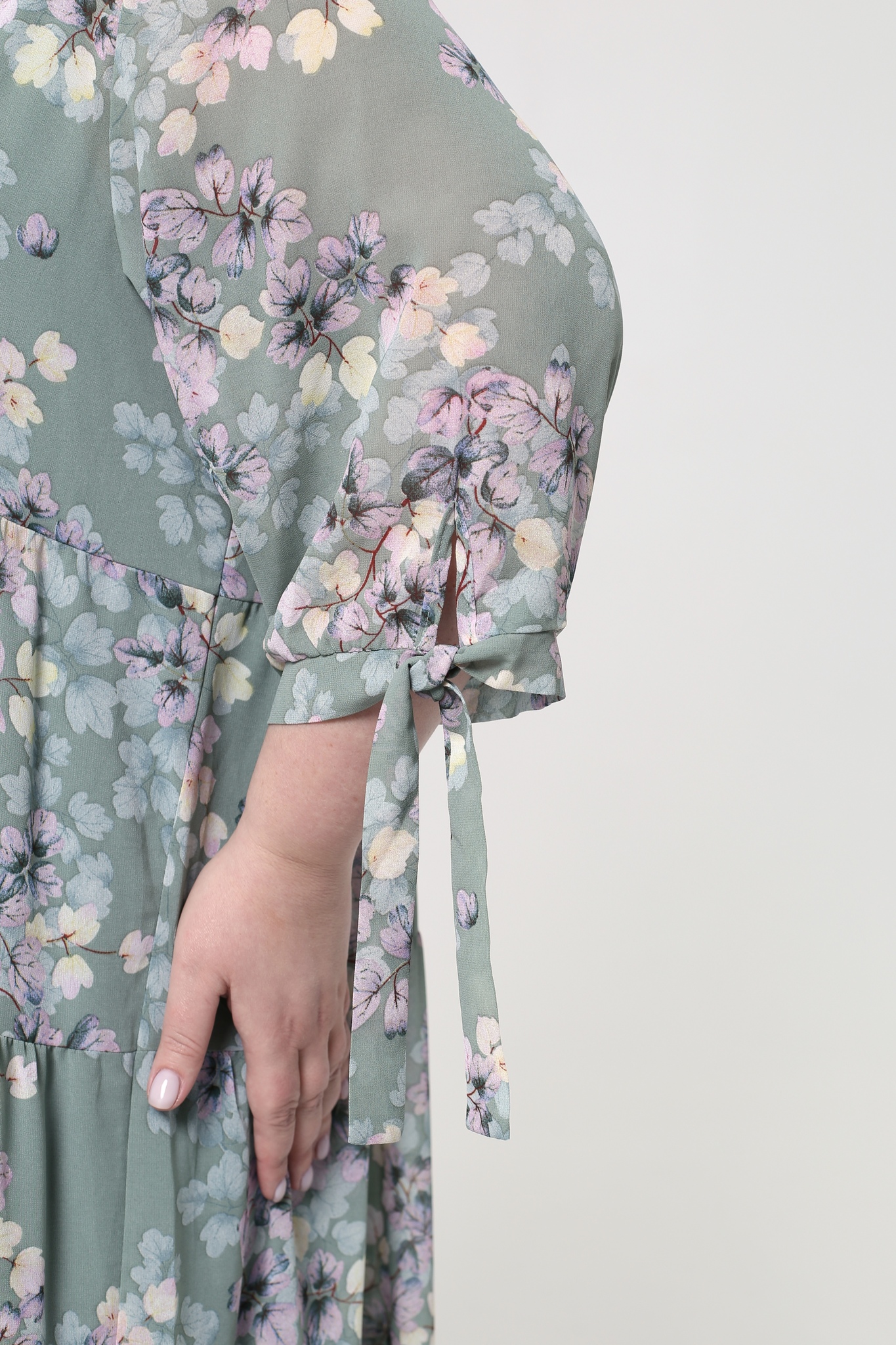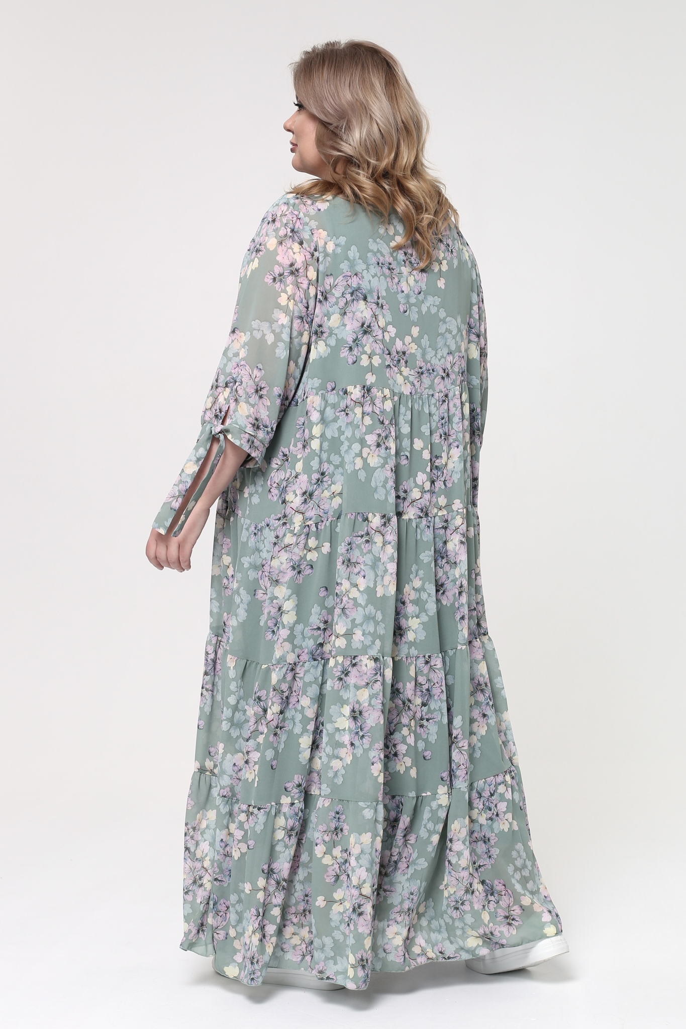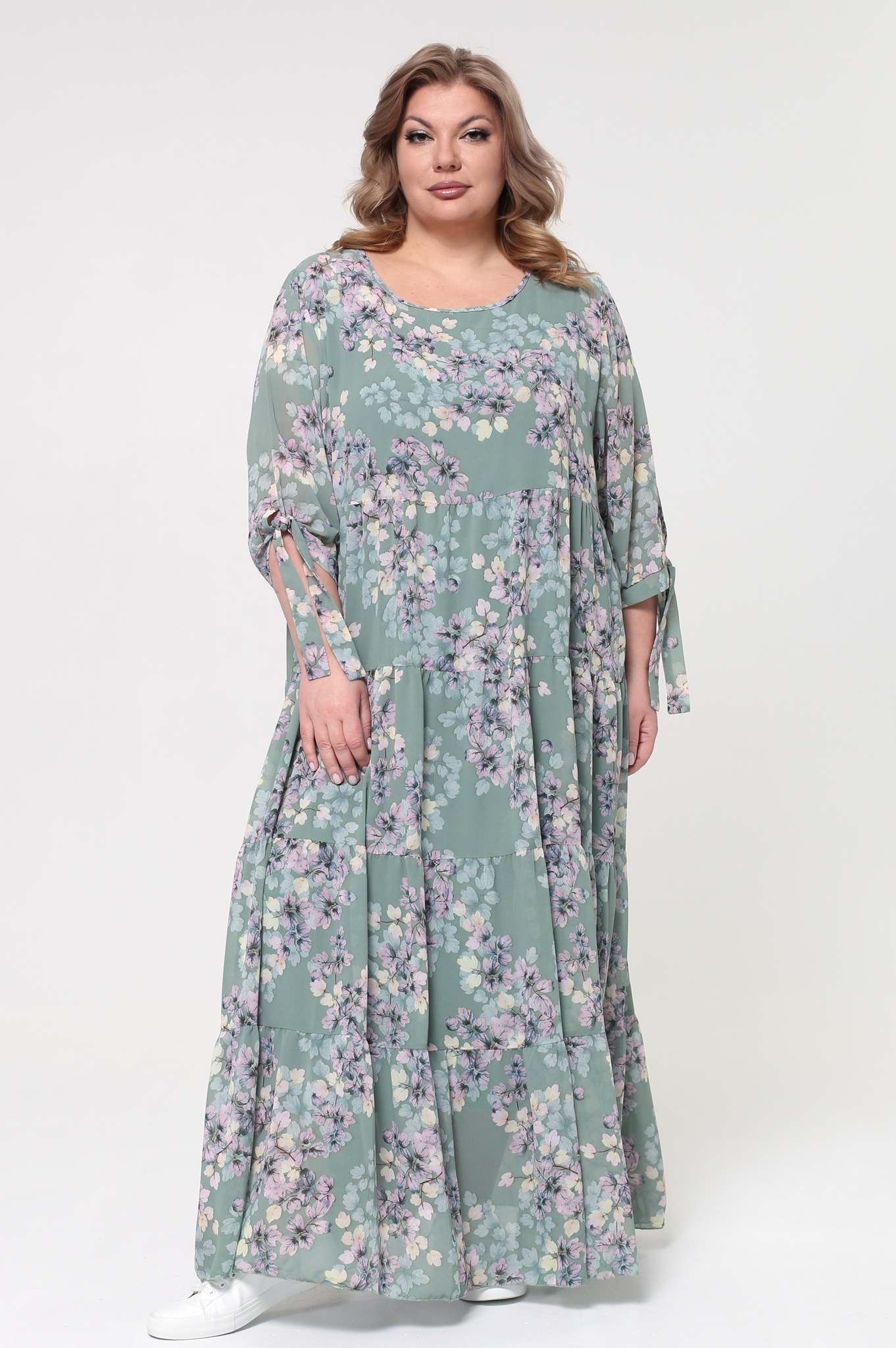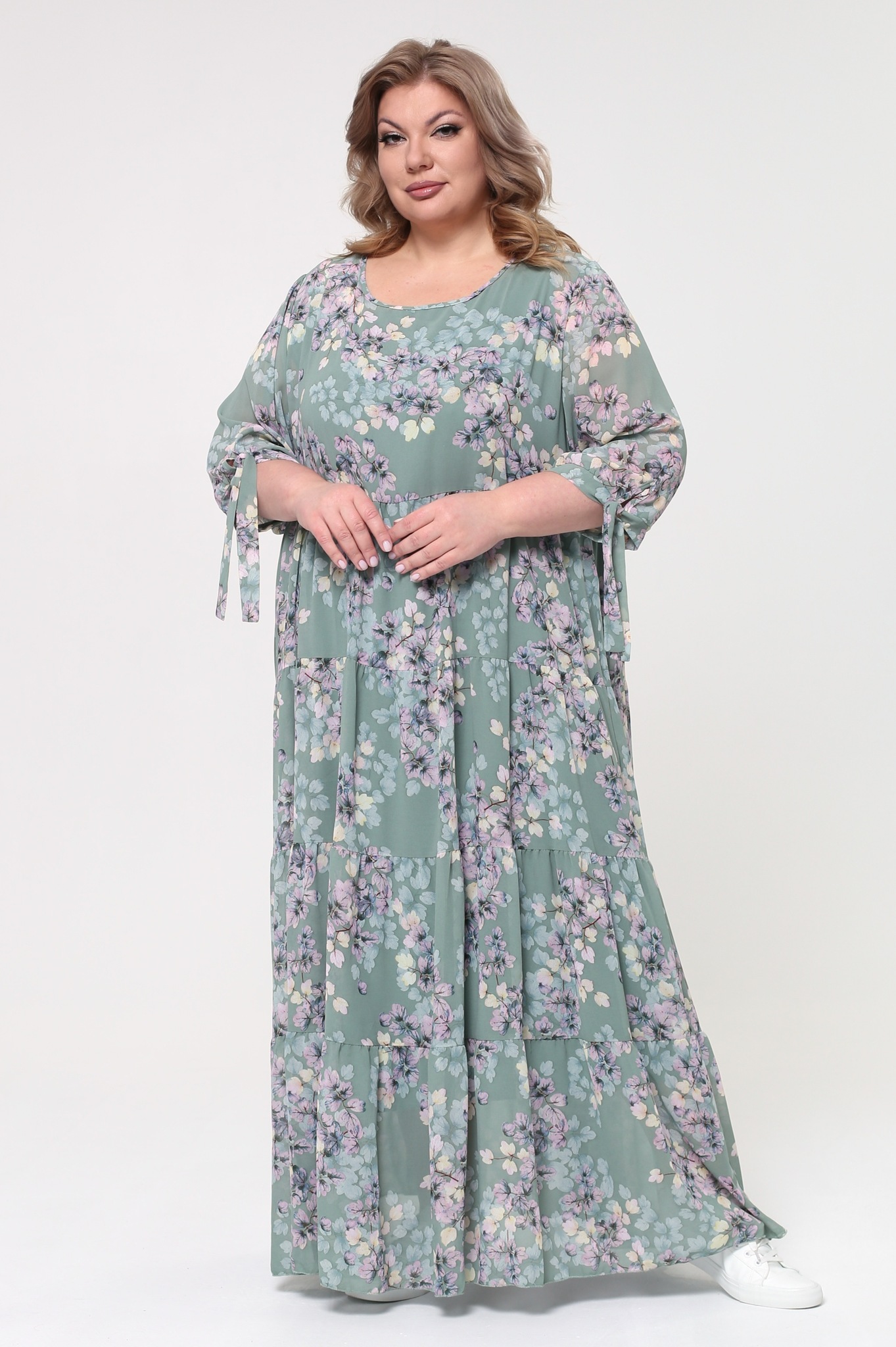 Легкое шифоновое платье "макси" свободного силуэта на съемной подкладе. имеет круглый вырез и рукава с манжетами на завязках. платье отрезное по линии груди с многоярусной расклешенной юбкой. свободный крой не сковывает движений и скрывает несовершенства фигуры. модель приятна телу, хорошо сидит и красиво обыгрывает фигуру. нежный принт по всему изделию добавляет образу динамичности. стильное платье в пол идеально подойдет для торжественных мероприятий разного характера и для летних прогулок. подчеркните лаконичность образа длинными серьгами и туфлями на высоких каблуках.
