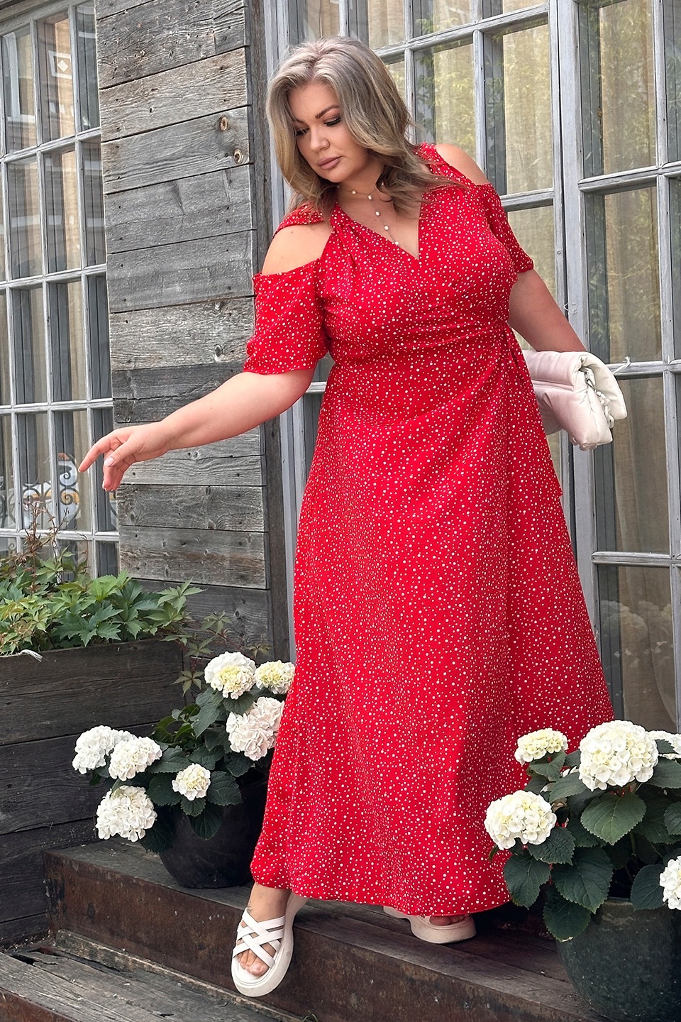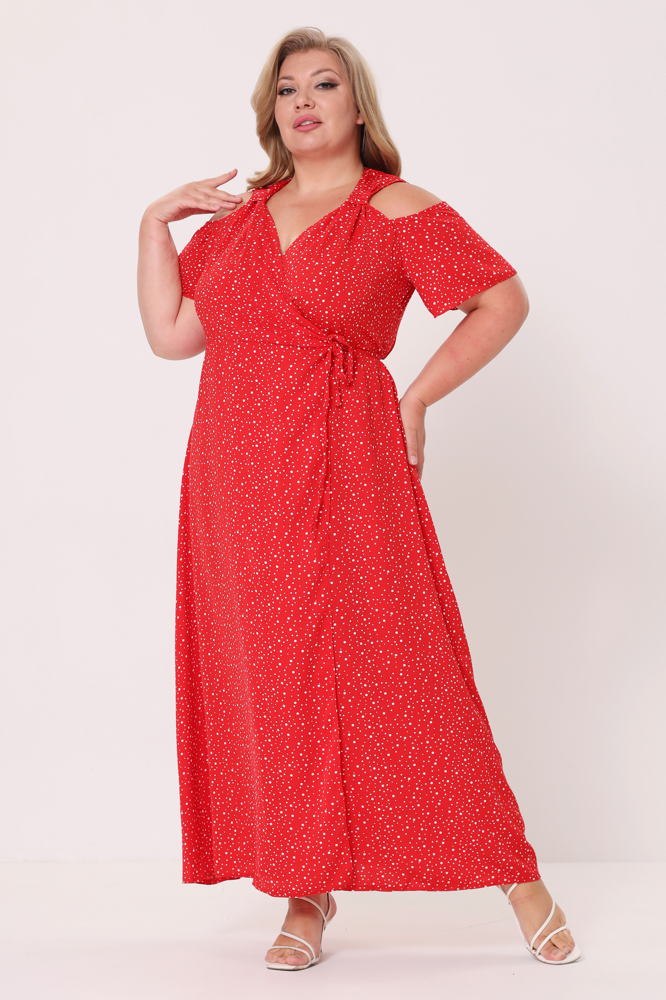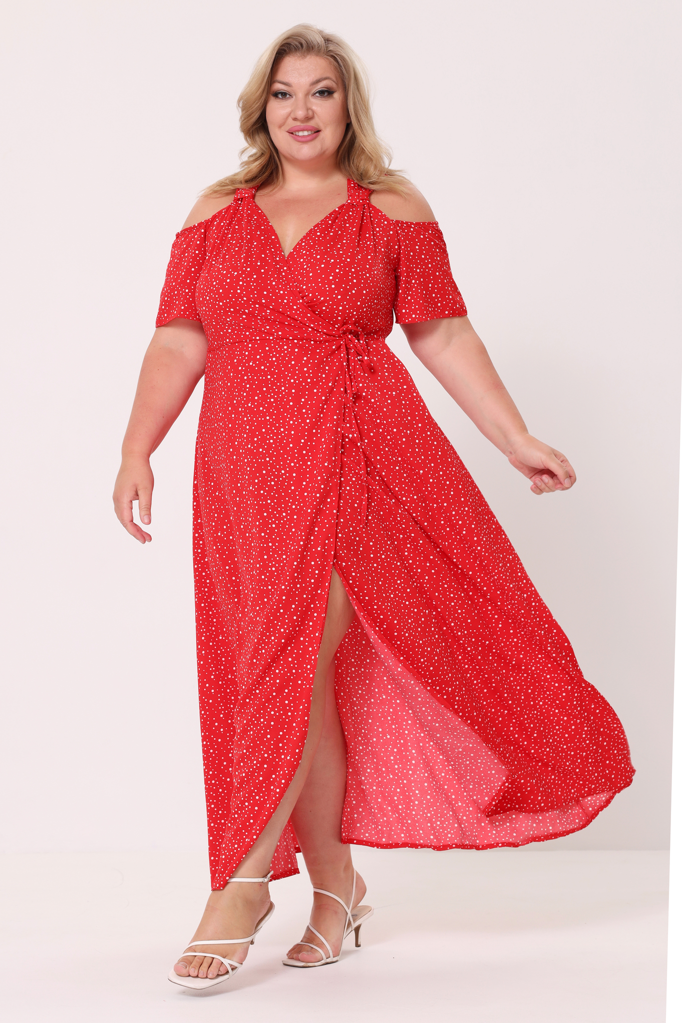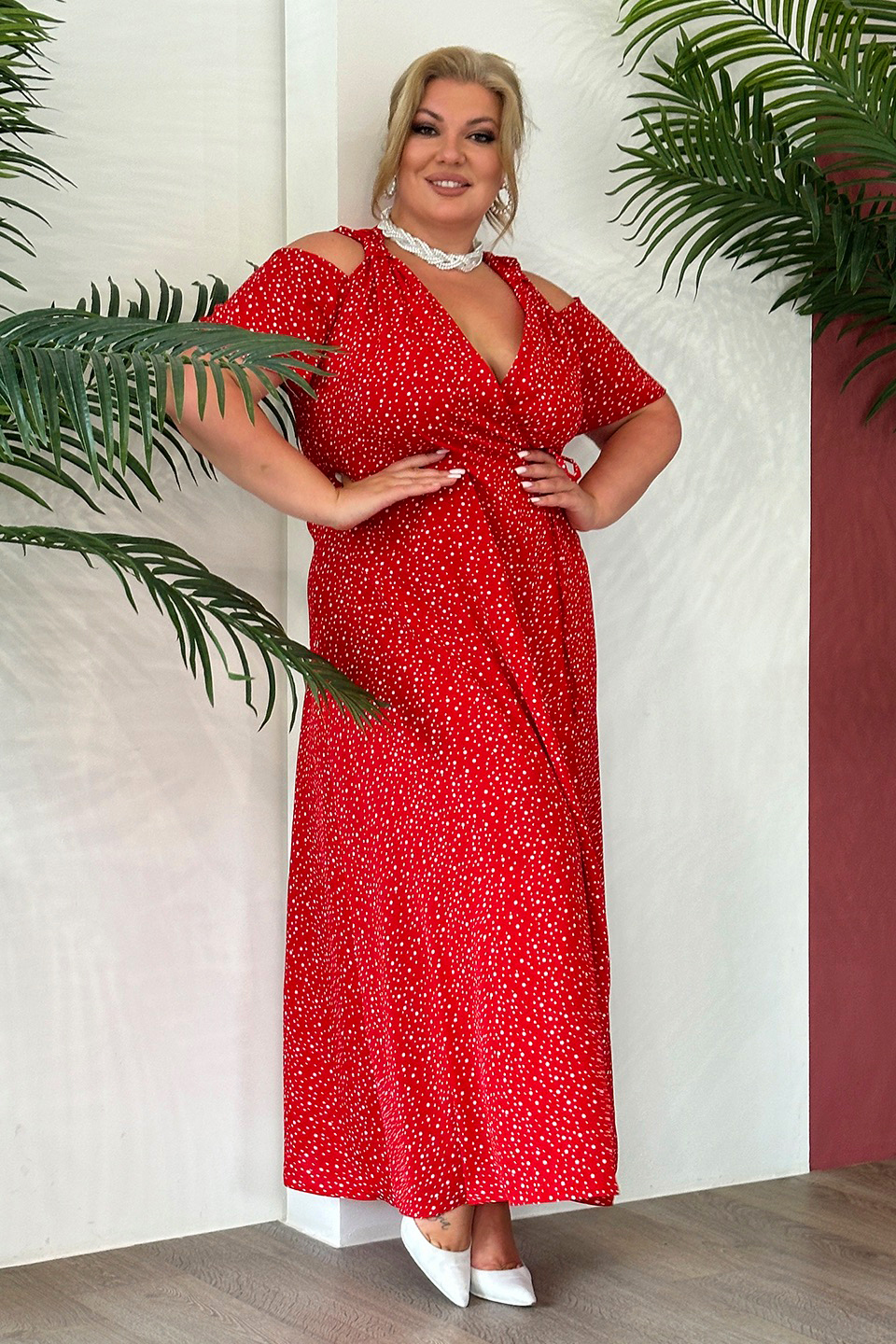 Платье длинное с запахом с вырезом на плечах "горошек" красное