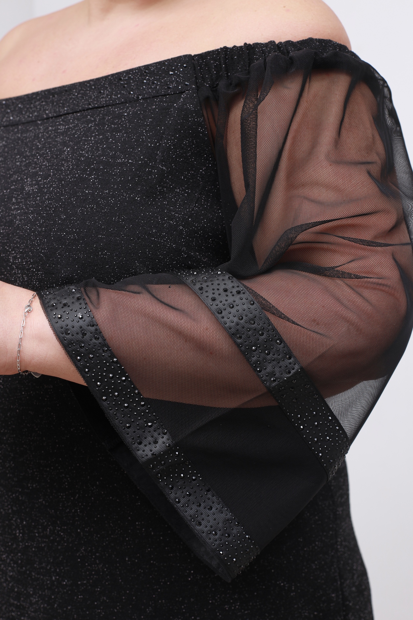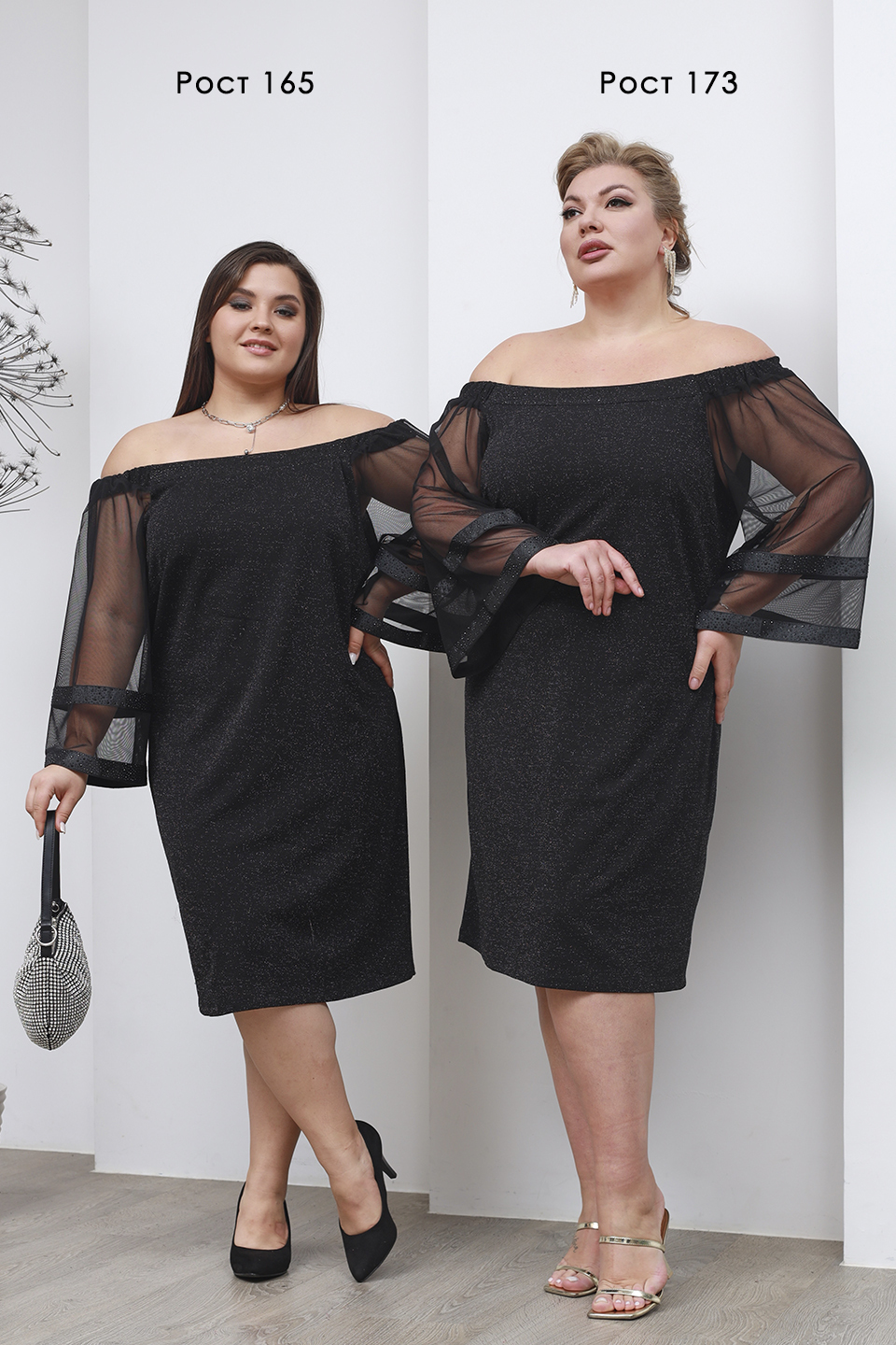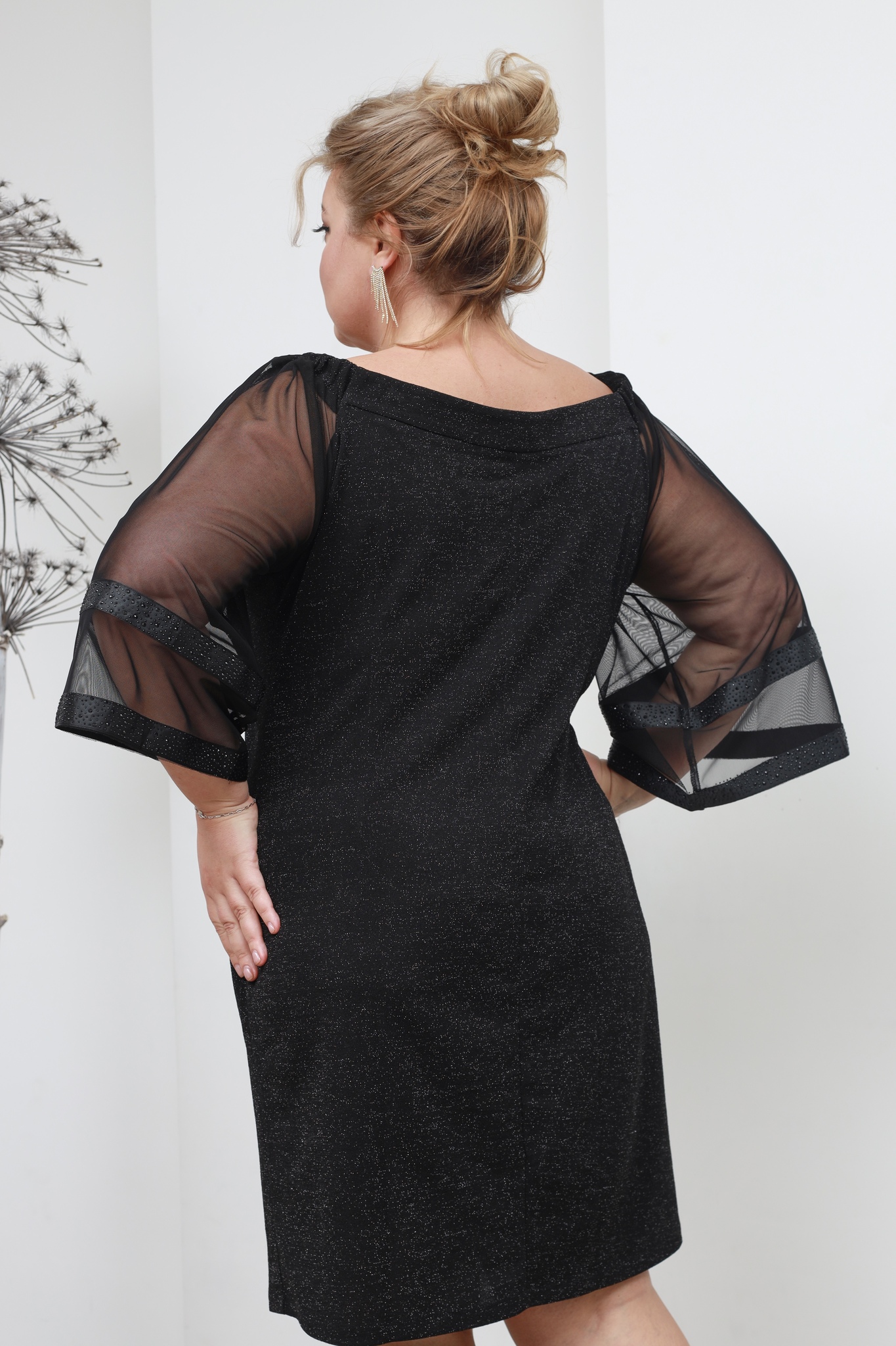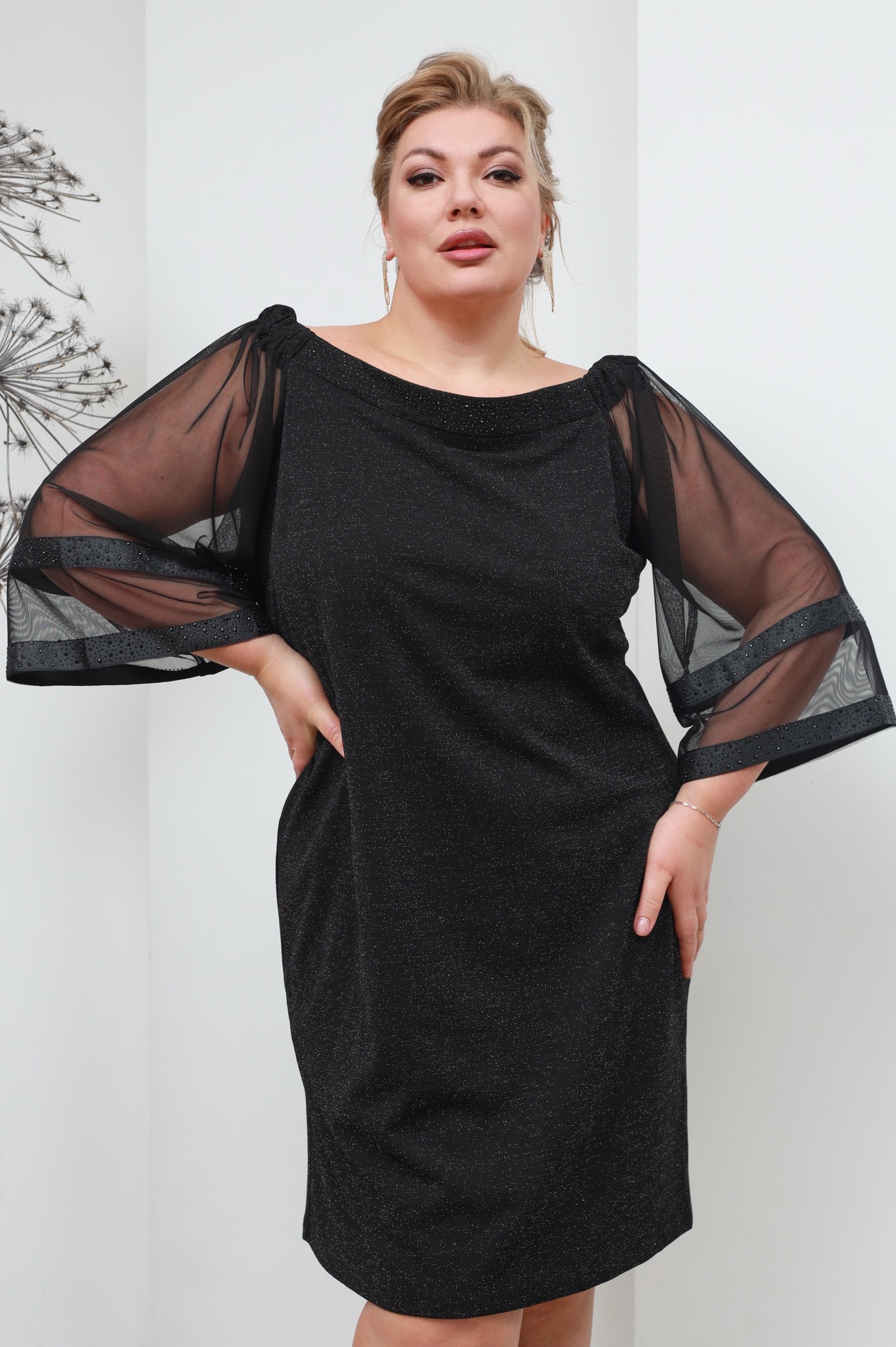 Стильное женское платье футляр из мягкого эластичного материала с добавлением нитей люрекса. круглый вырез по бокам декорирован широкой резинкой, который при желании можно припустить на плечи. изюминкой платья являются широкие прозрачные рукава длиной 3/4, декорированные атласной полоской с камнями, что добавляет модели нарядности. центральный шов по спинке способствует оптимальной посадке по фигуре. лаконичное платье отлично подойдет как для повседневной но ски, так и для праздничного торжества. яркий клатч и туфли на каблуках станут идеальным дополнением к стильному образу.