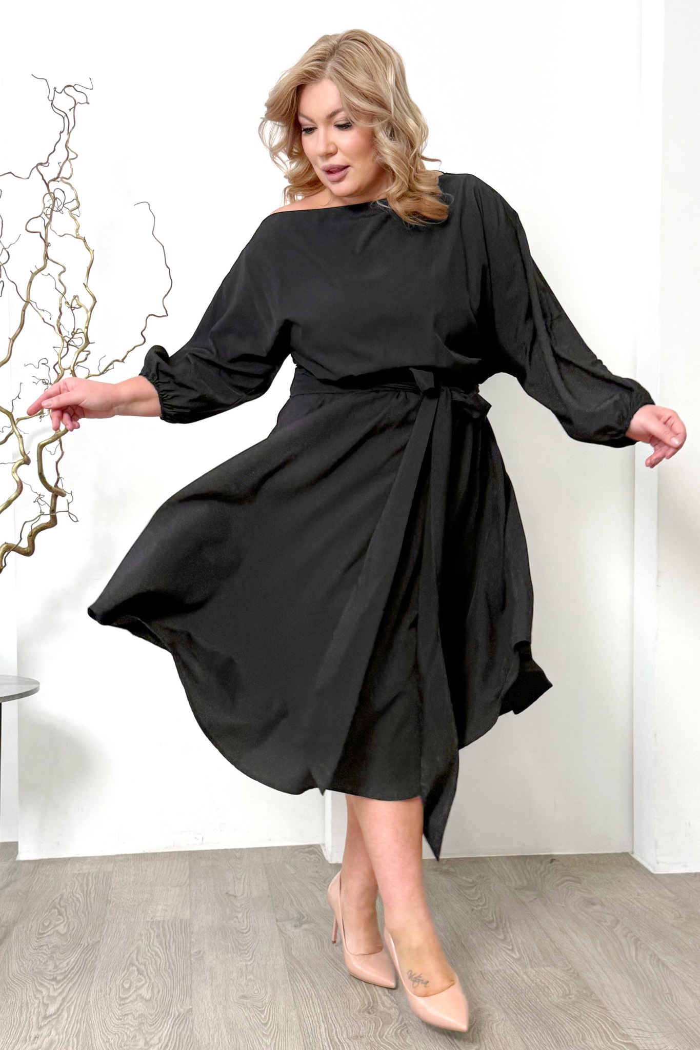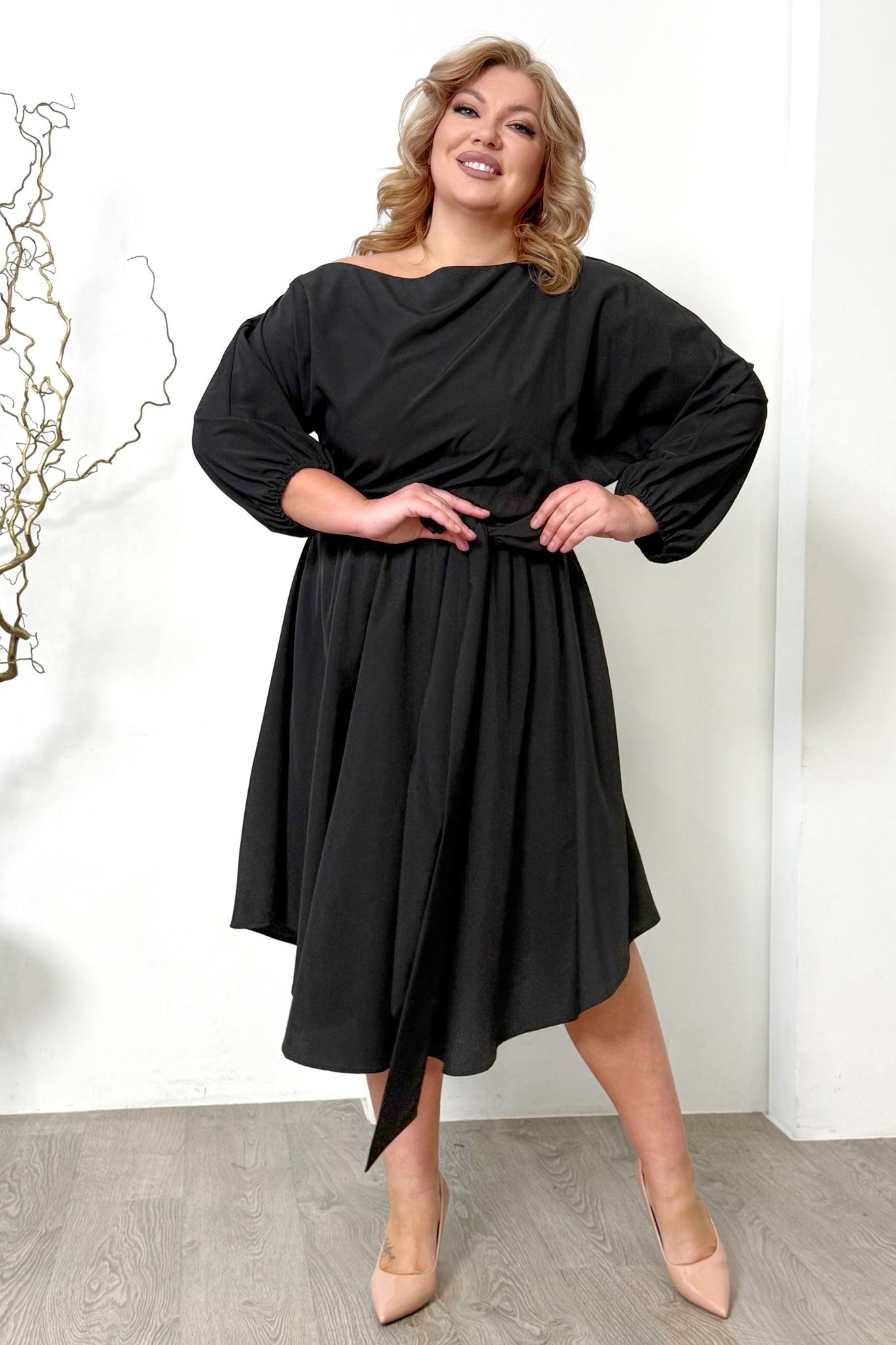 Платье расклешенное с поясом черное