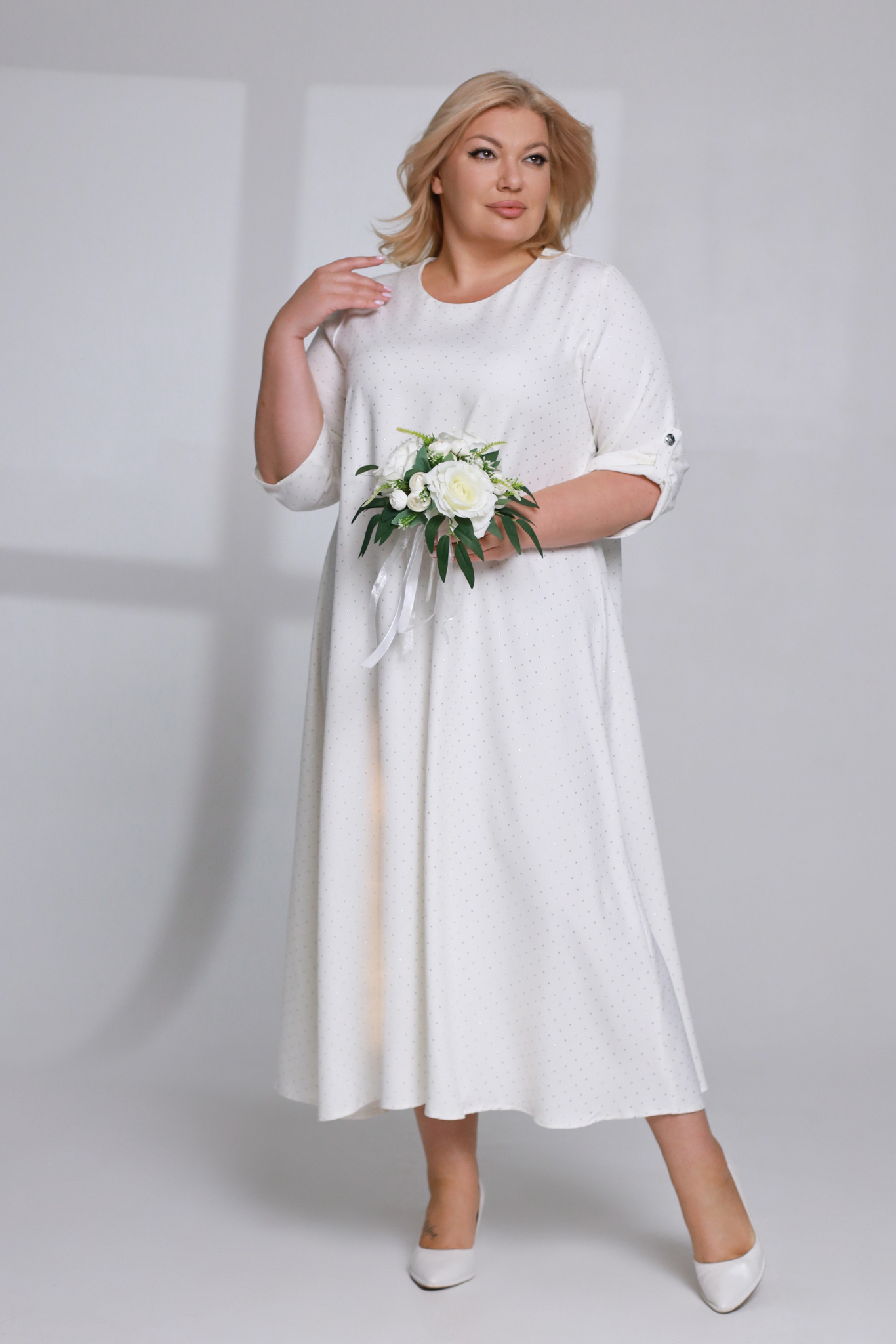Платье Стильное платье из мягкого материала. модель имеет u-образный вырез. рукава длиной 3/4 можно присобрать, при желании, хлястиком. небольшие стразы по всему платью добавляют наряду блеск и изящество. свободный силуэт и мягкий материал искусно обыгрывают фигуру и дарят комфорт в течение всего дня. платье создано для того, чтобы подчеркивать достоинства и скрывать недостатки. стильный клатч и туфли на каблуках станут идеальным дополнением к нарядному образу. Параметры модели: Рост 173 см, Размер 54
