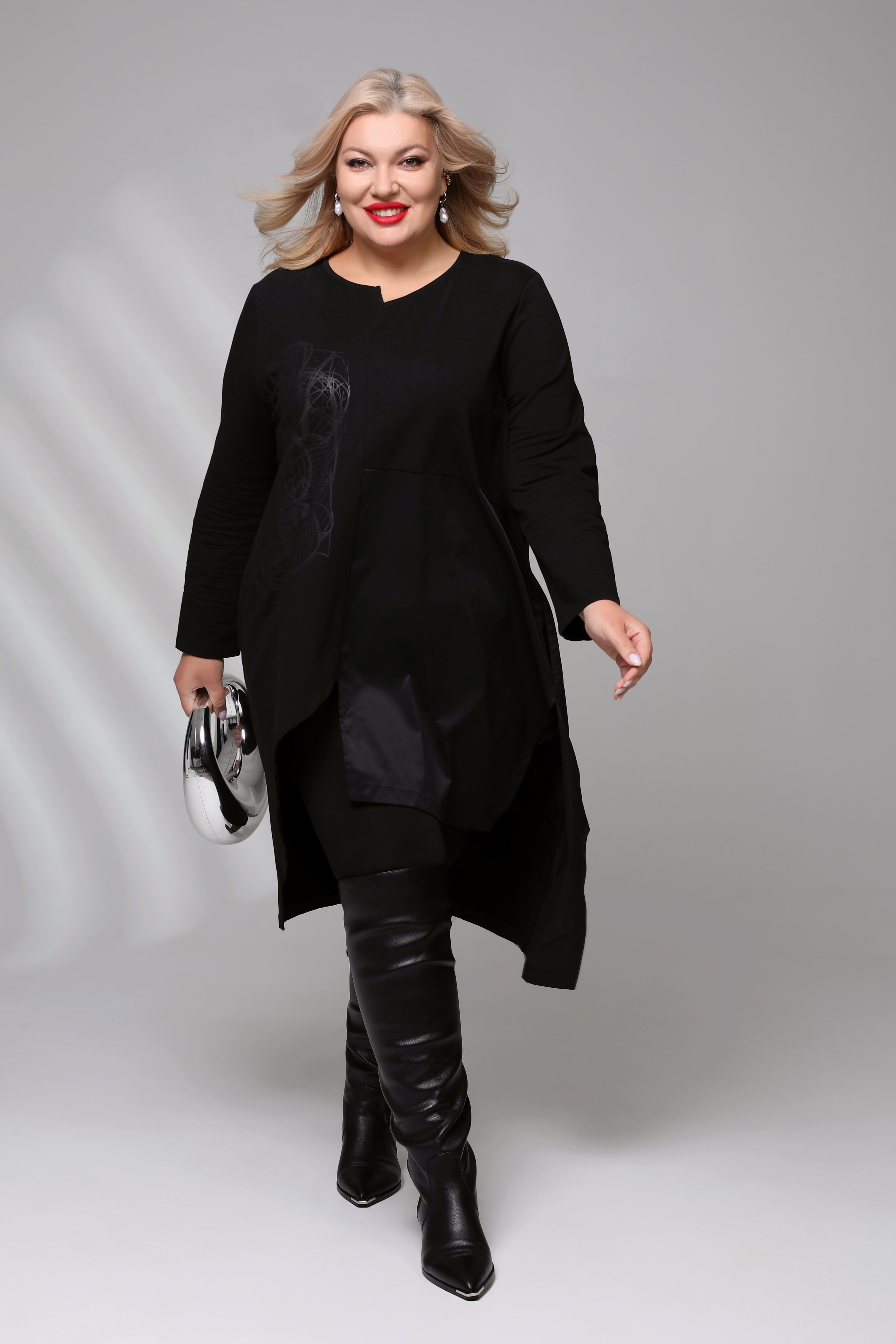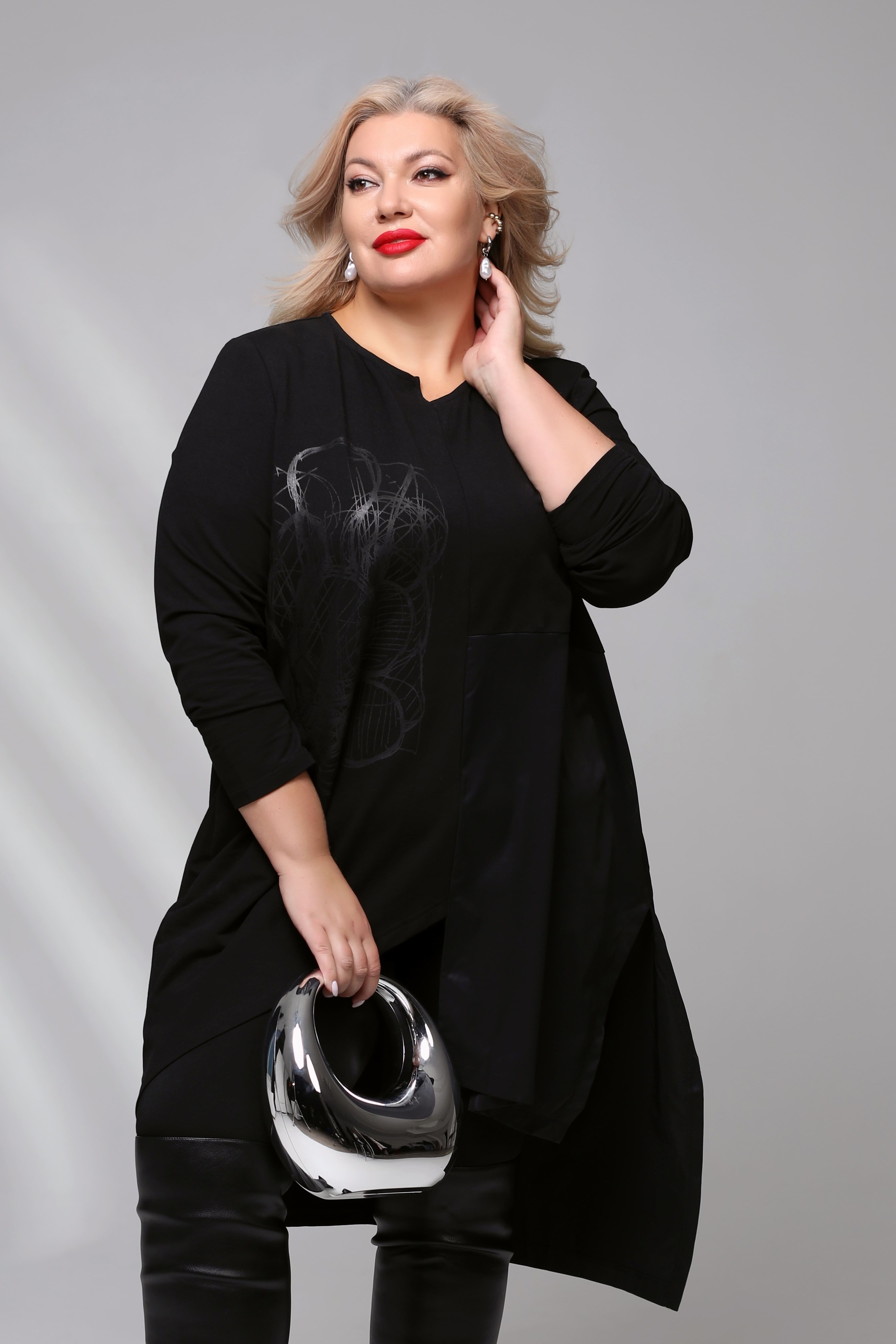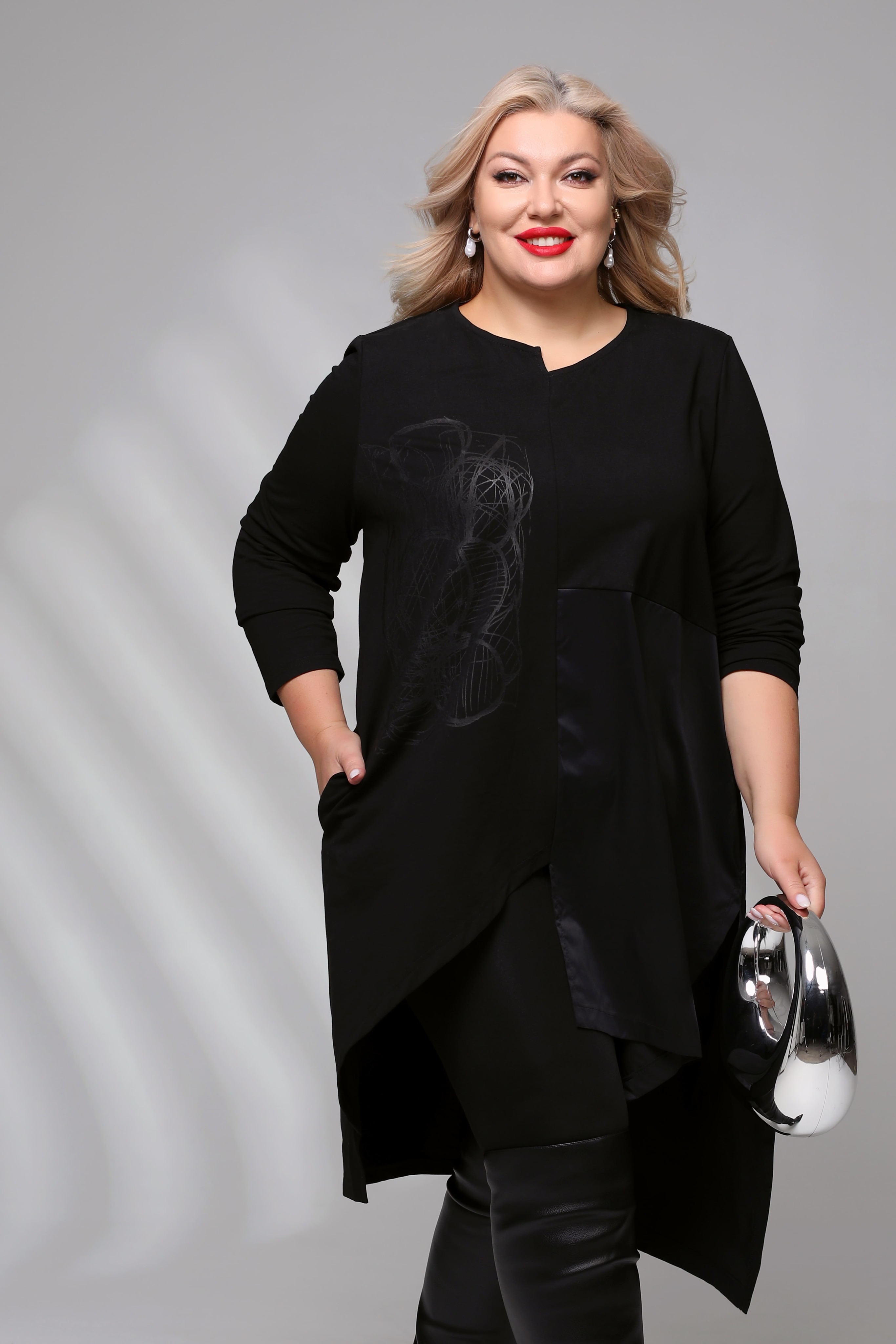 Платье-туника асимметрия с рисунком сбоку черное Параметры модели: Рост 173 см, Размер 54