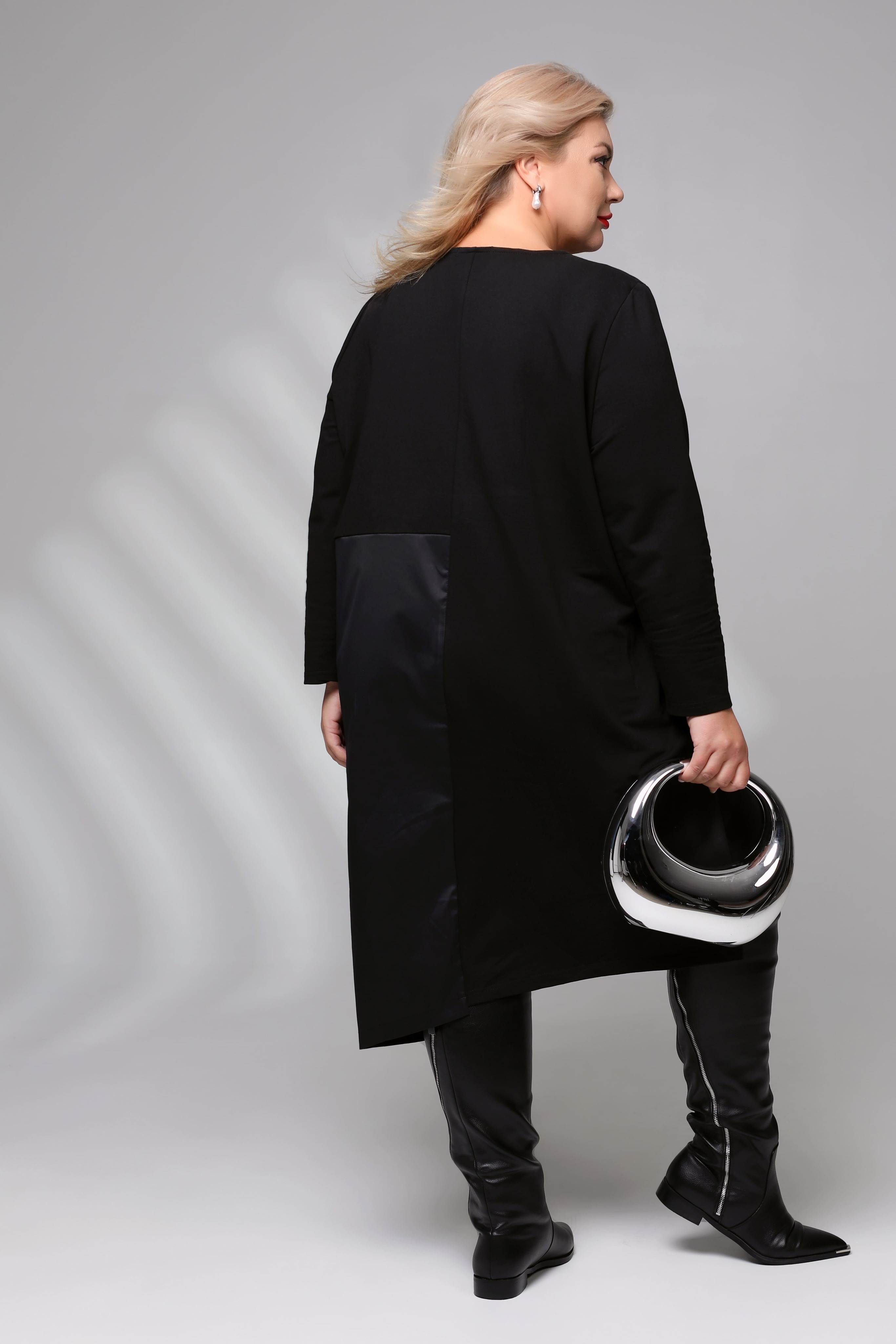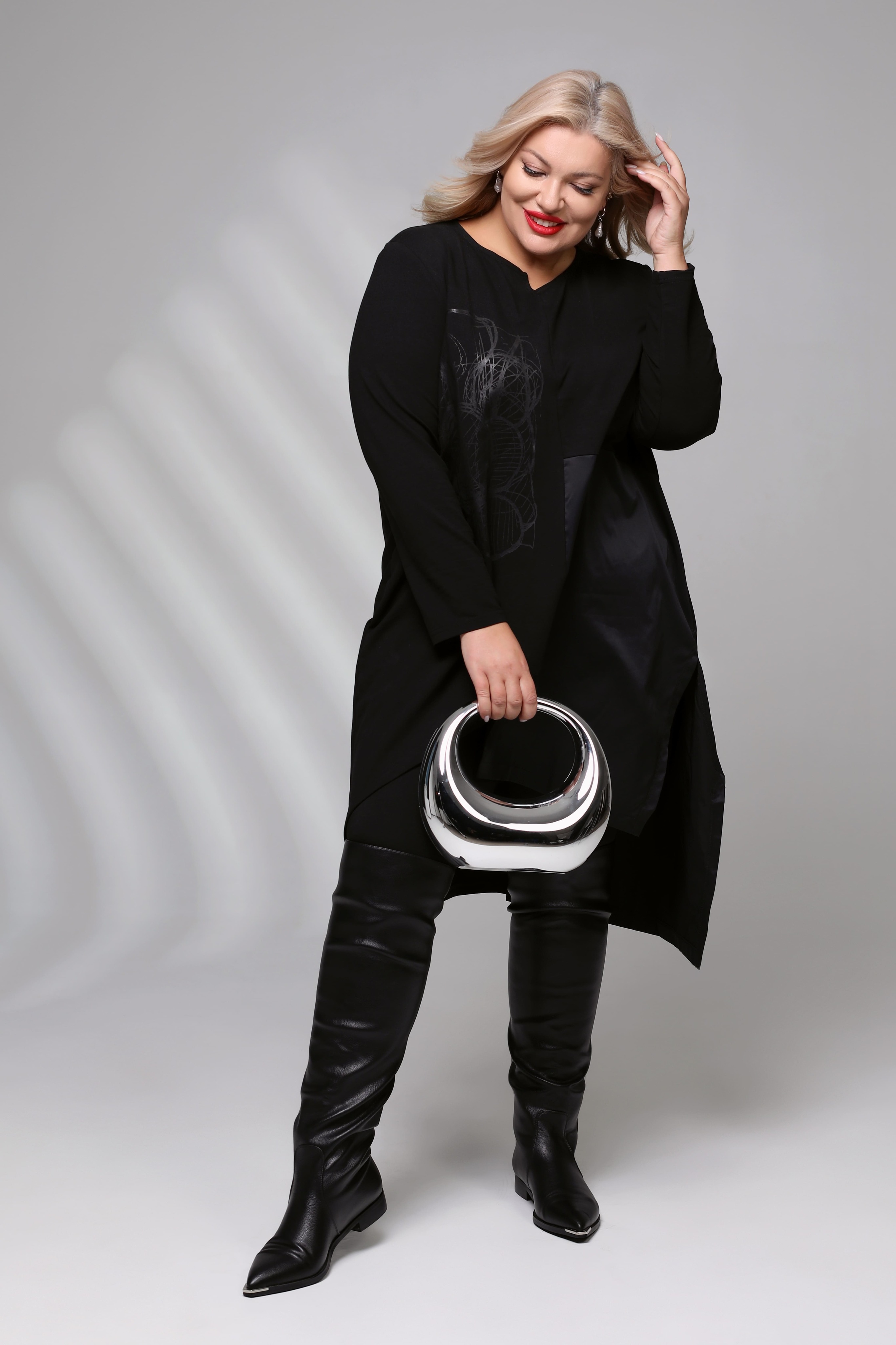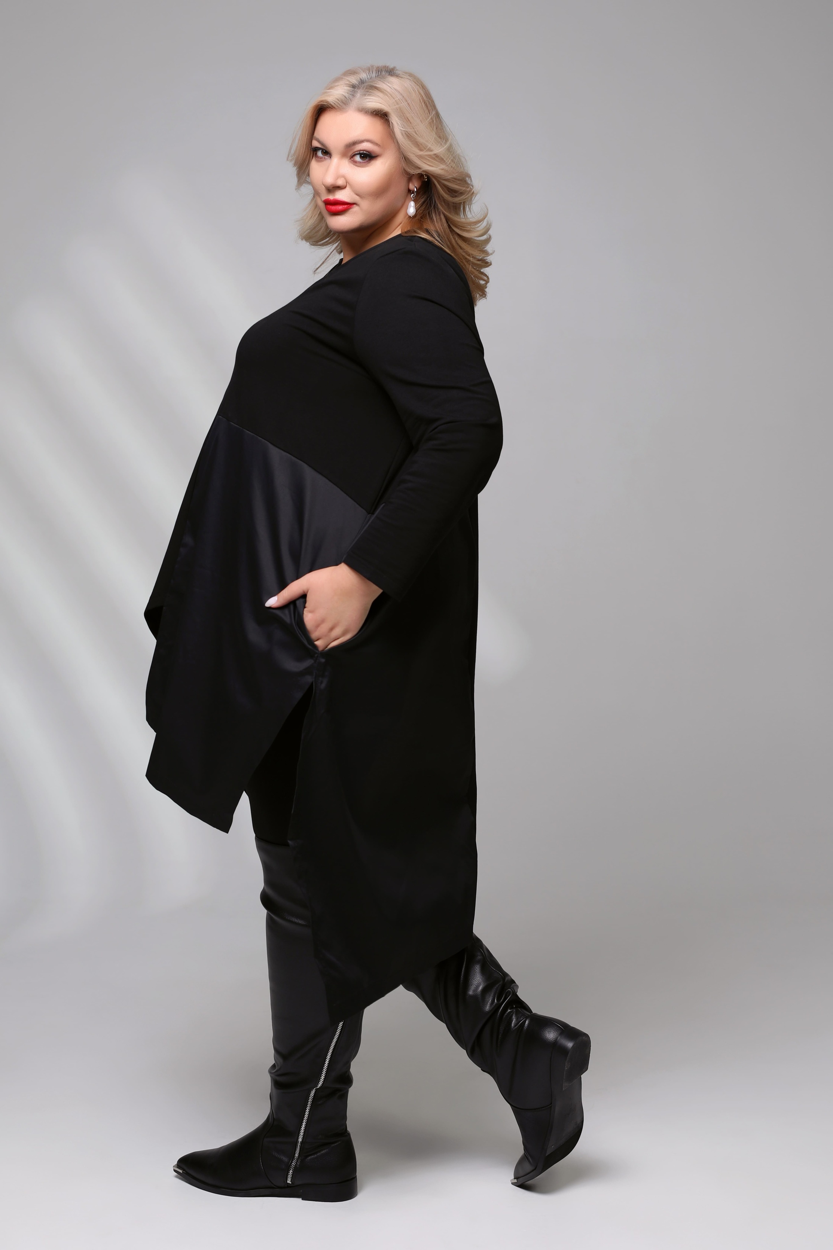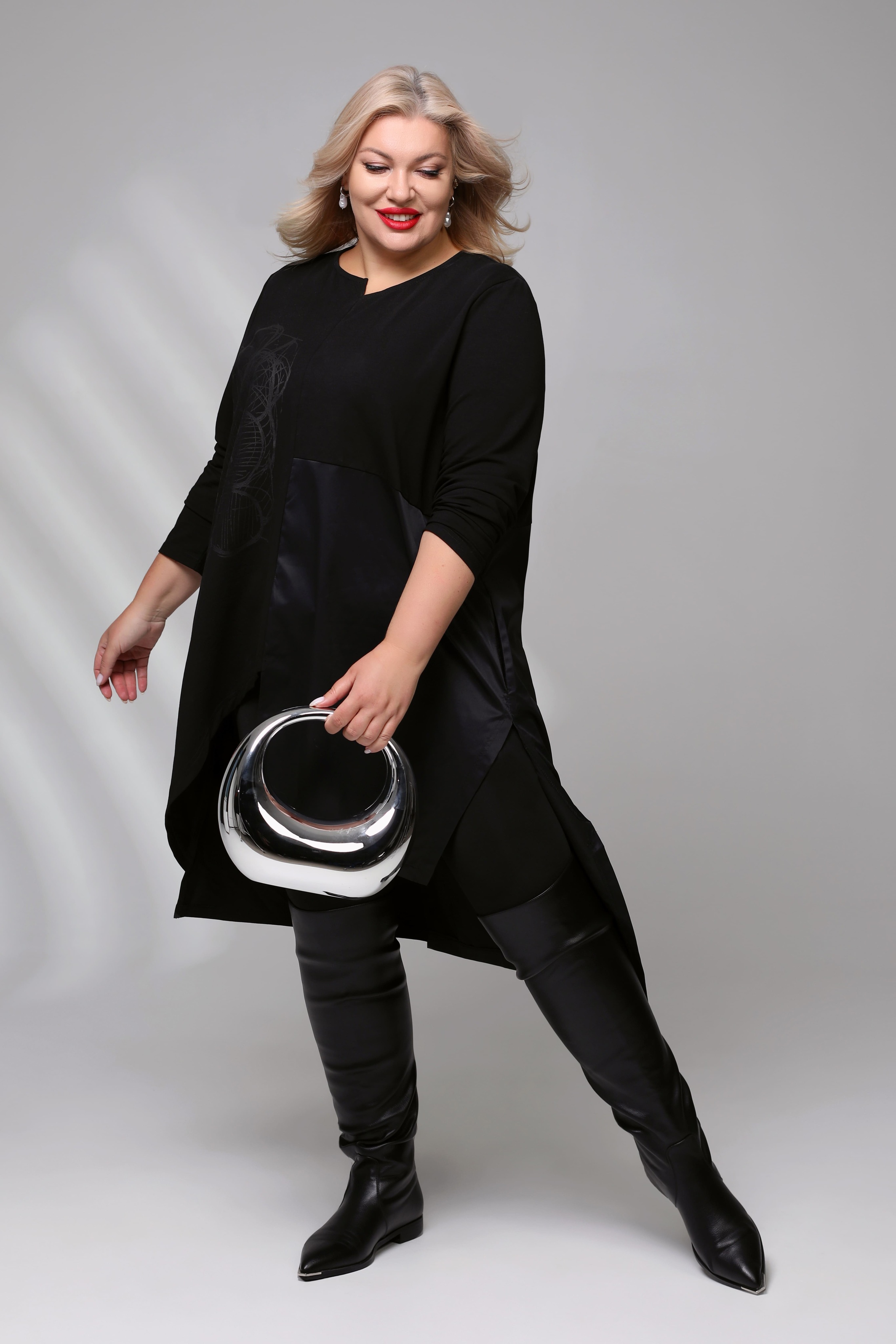 Платье-туника асимметрия с рисунком сбоку черное Параметры модели: Рост 173 см, Размер 54