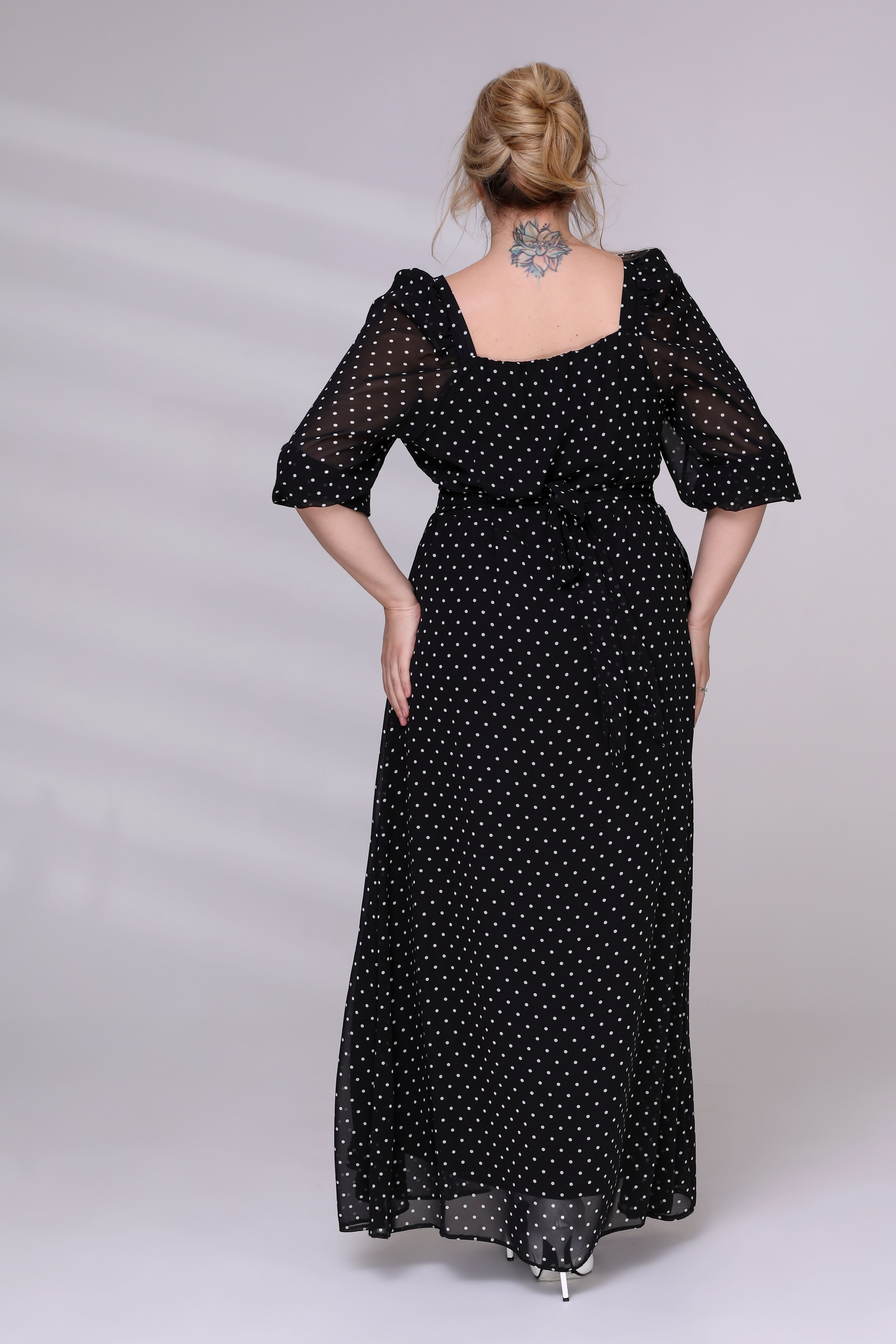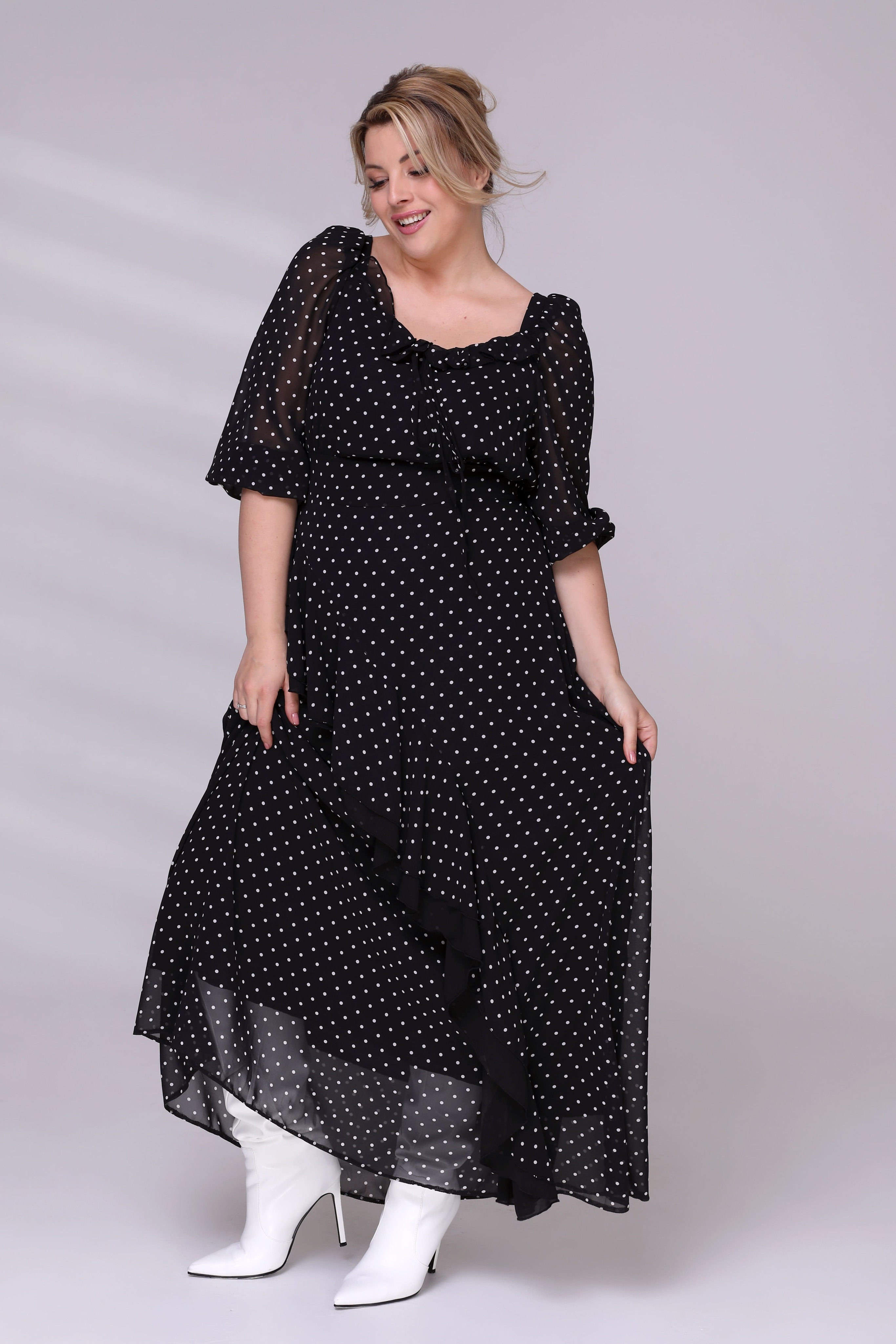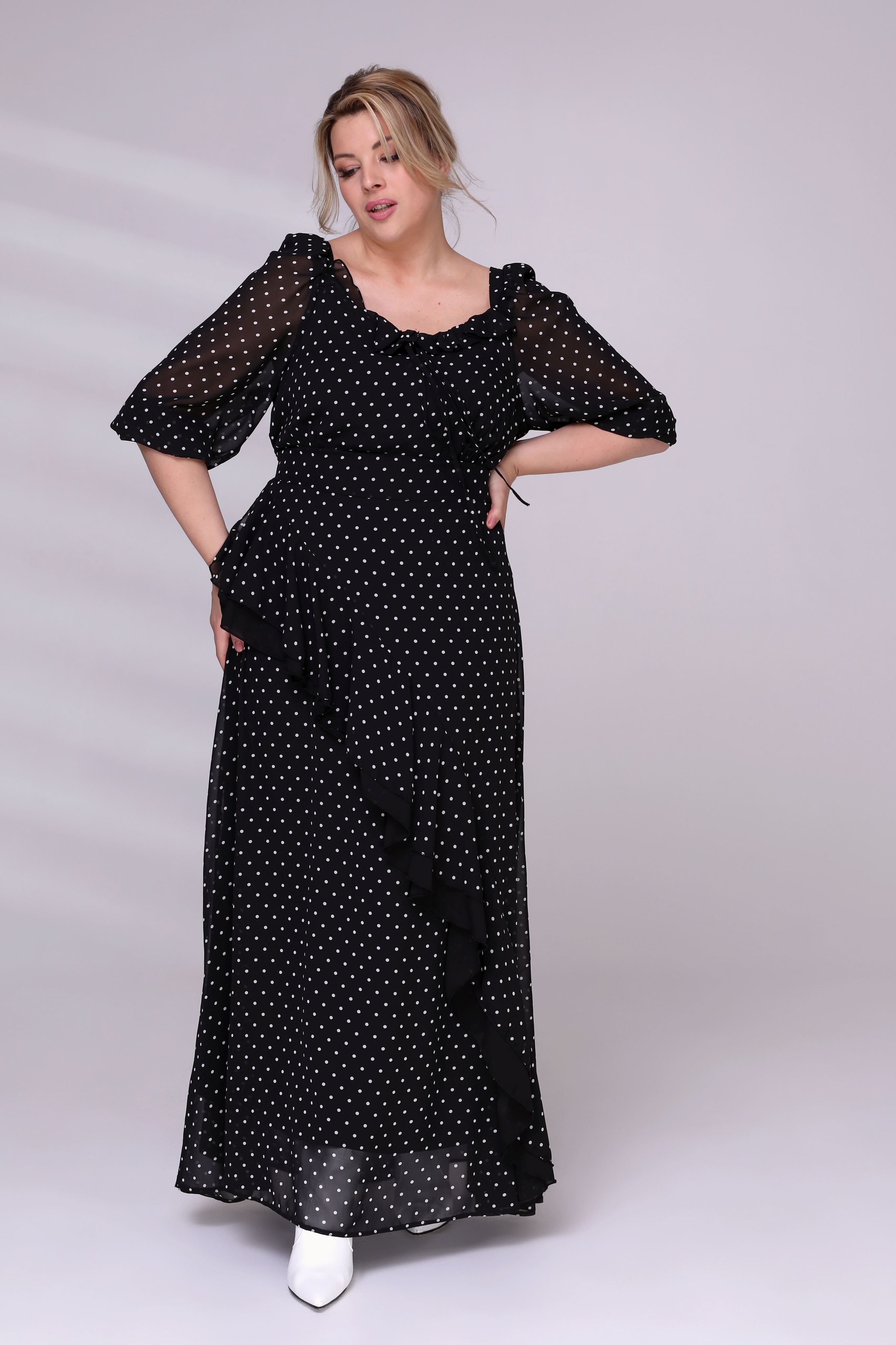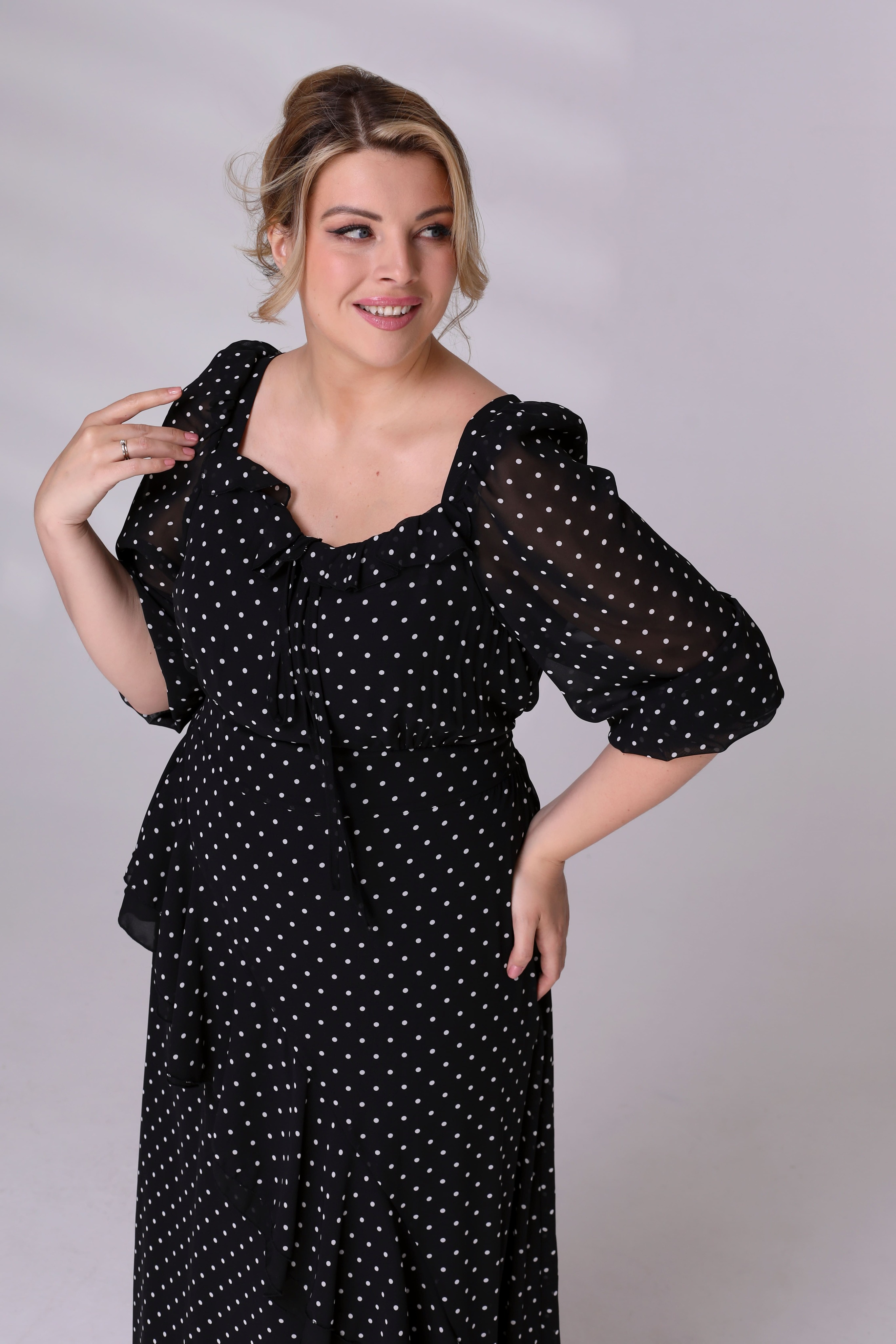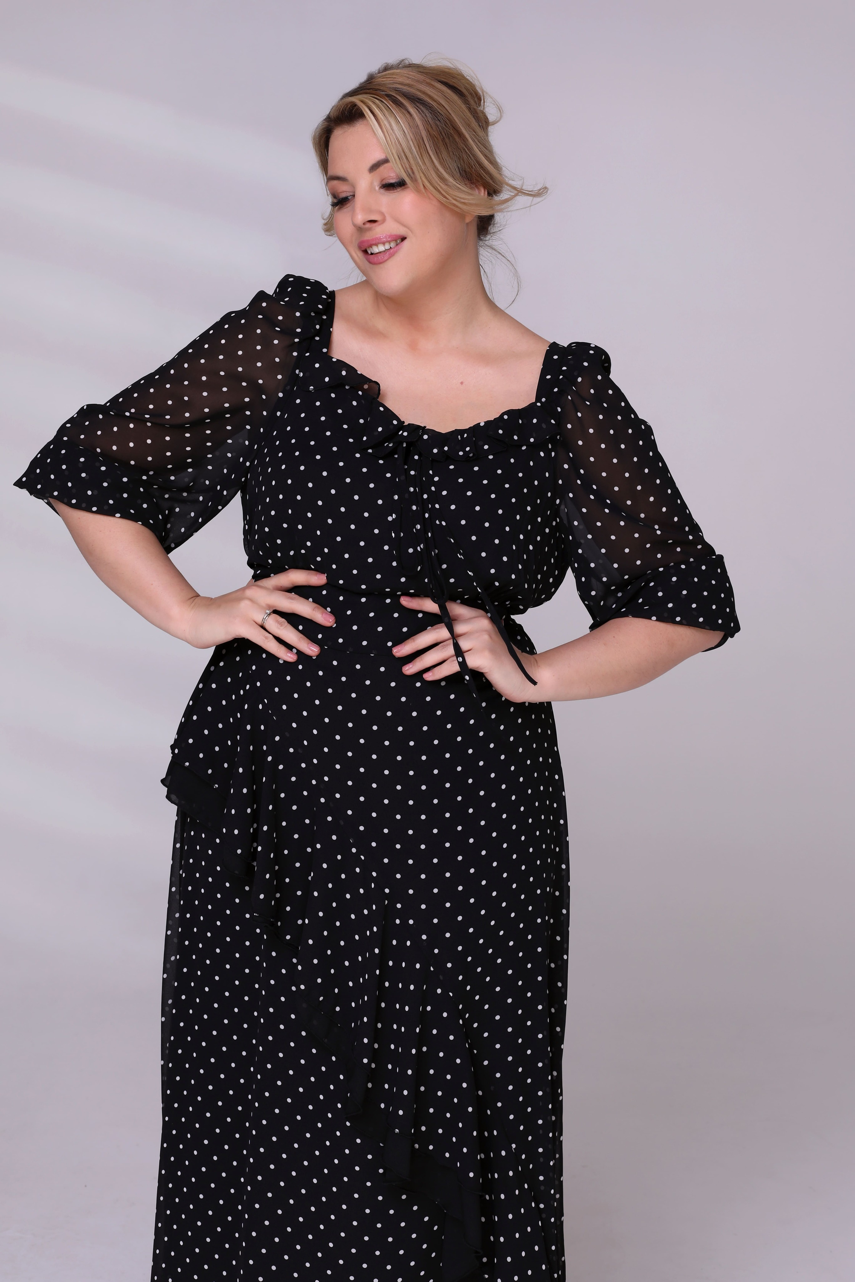Платье шифон в горошек с воланами в слой черный
