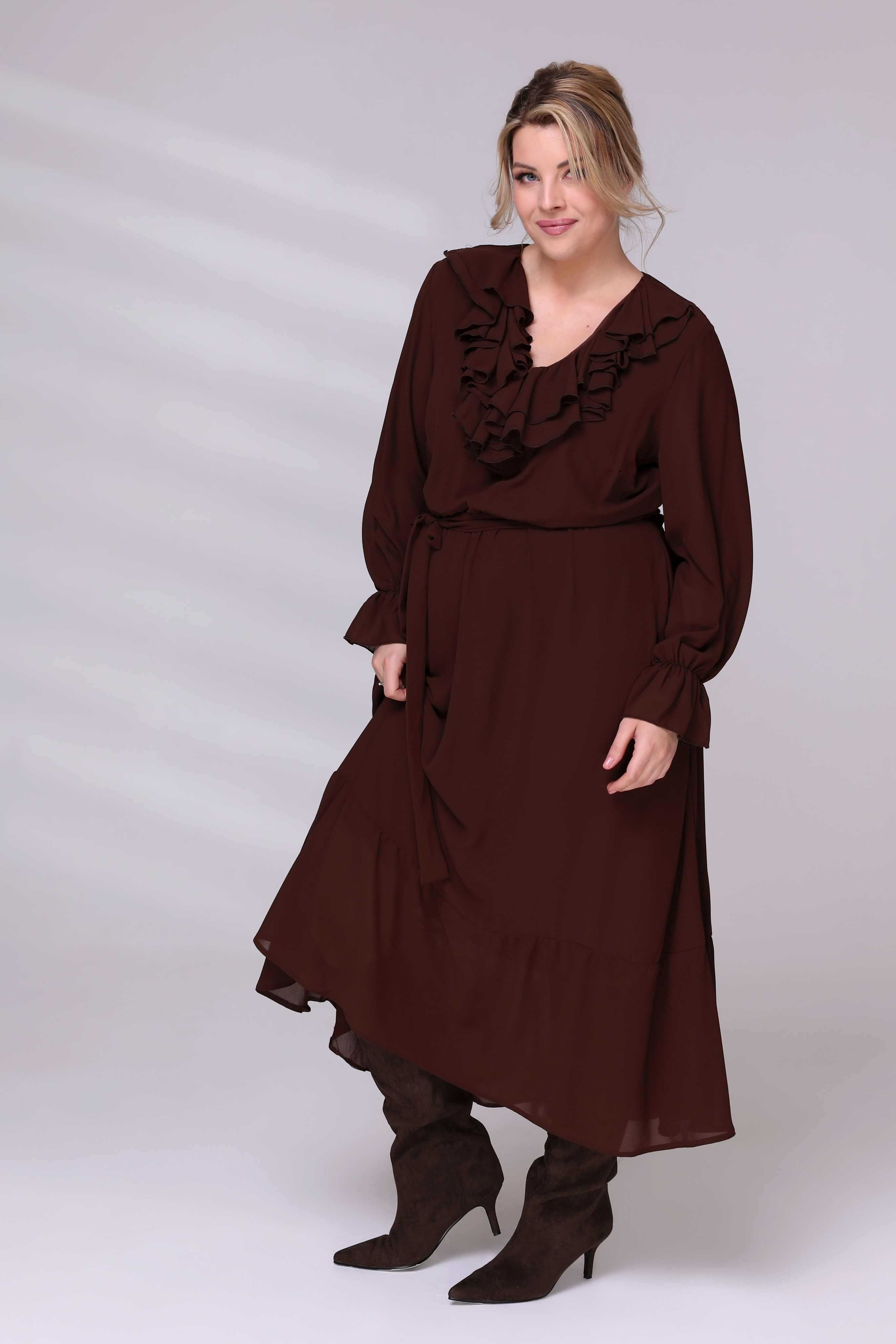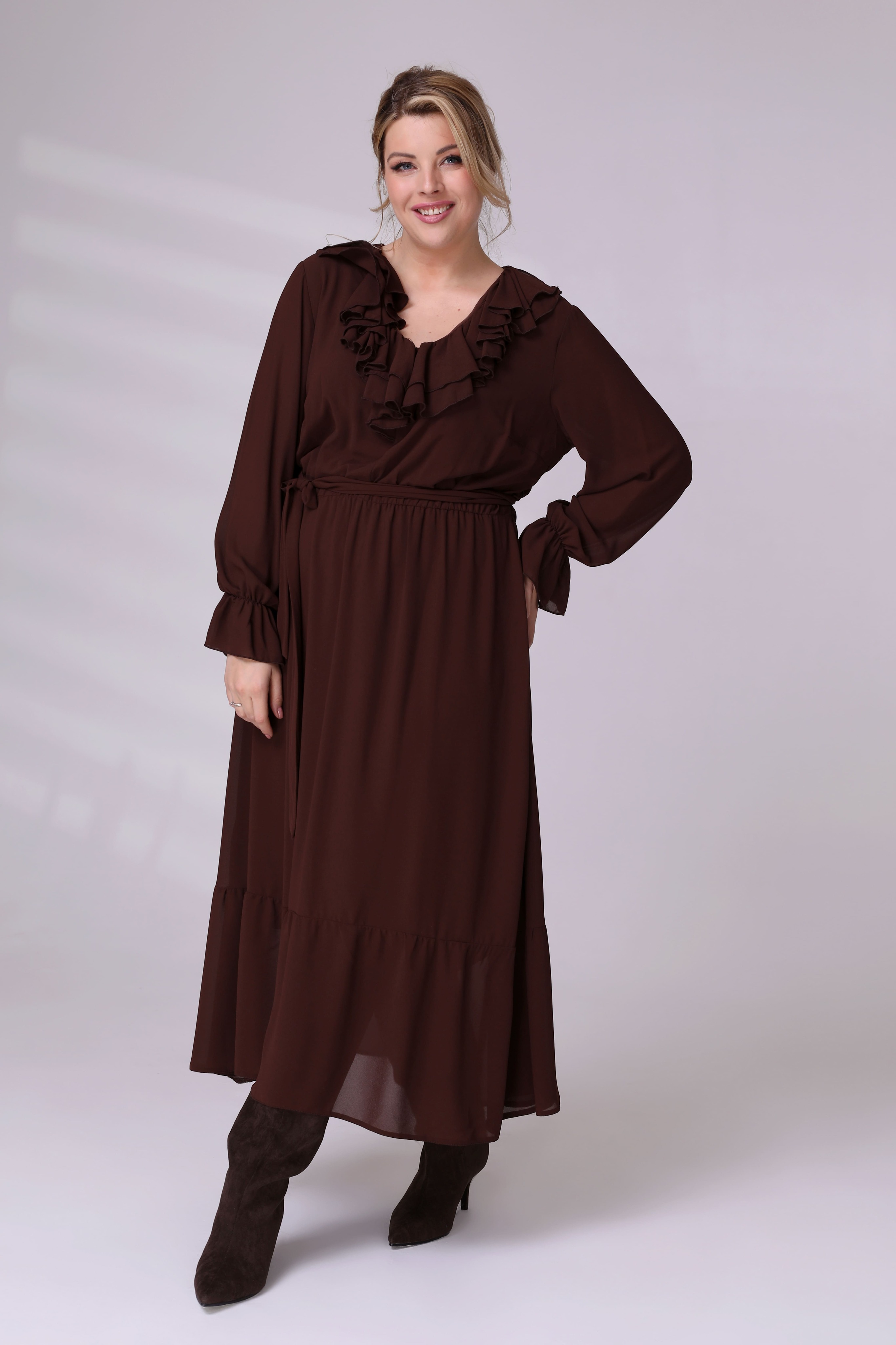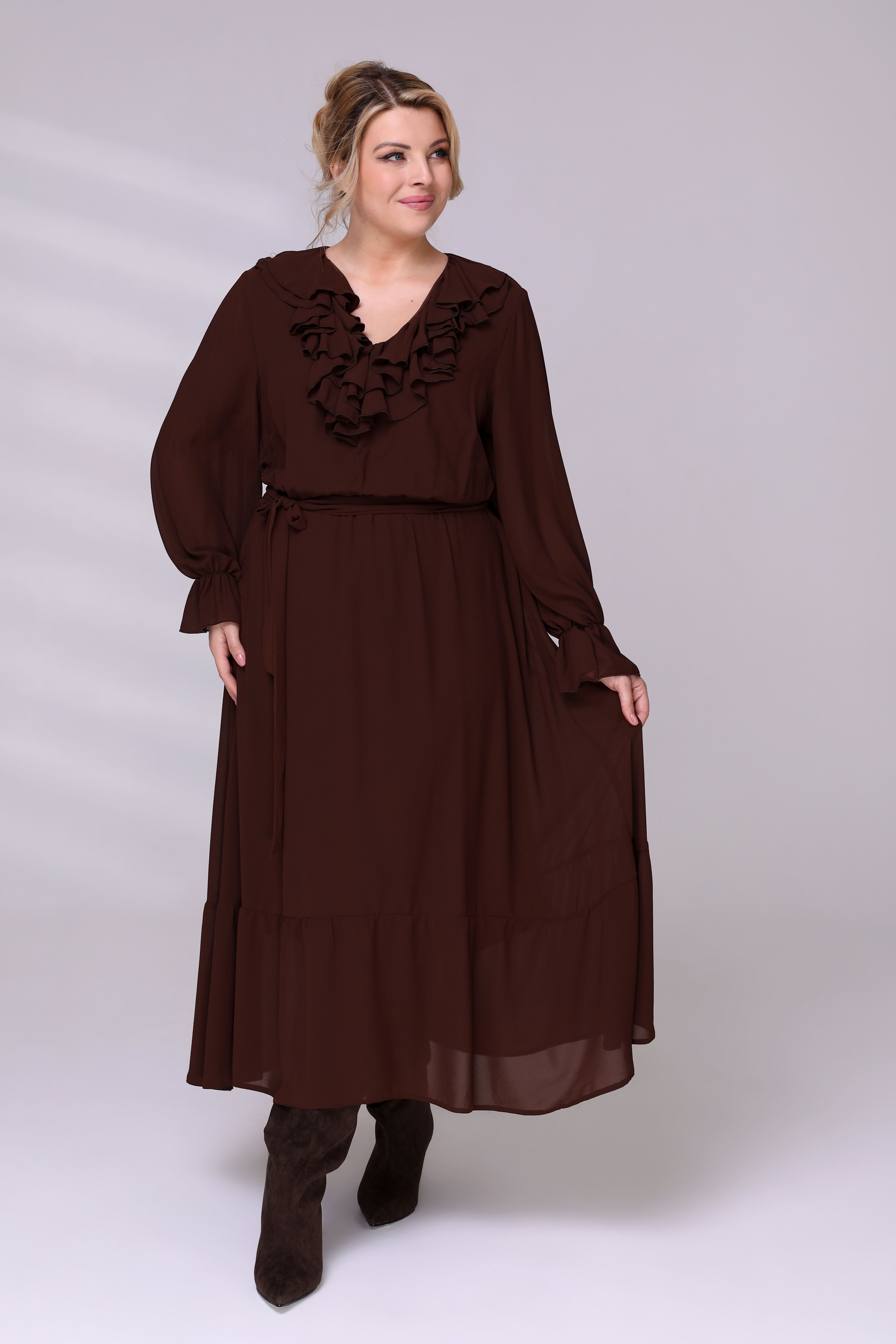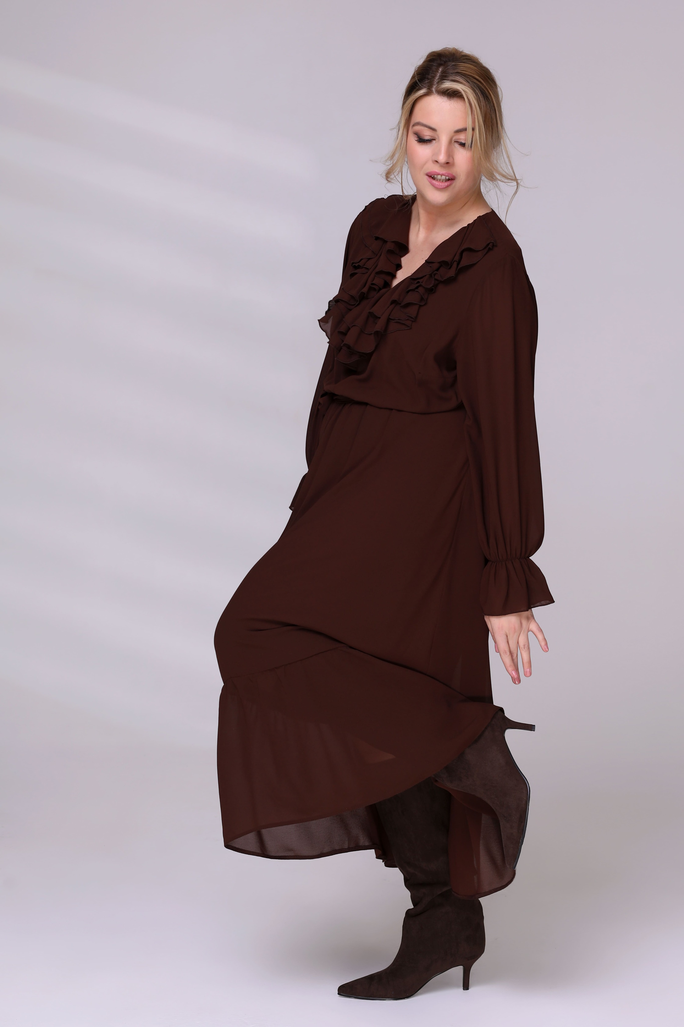 Платье на резинке с рюшами на вороте коричневое