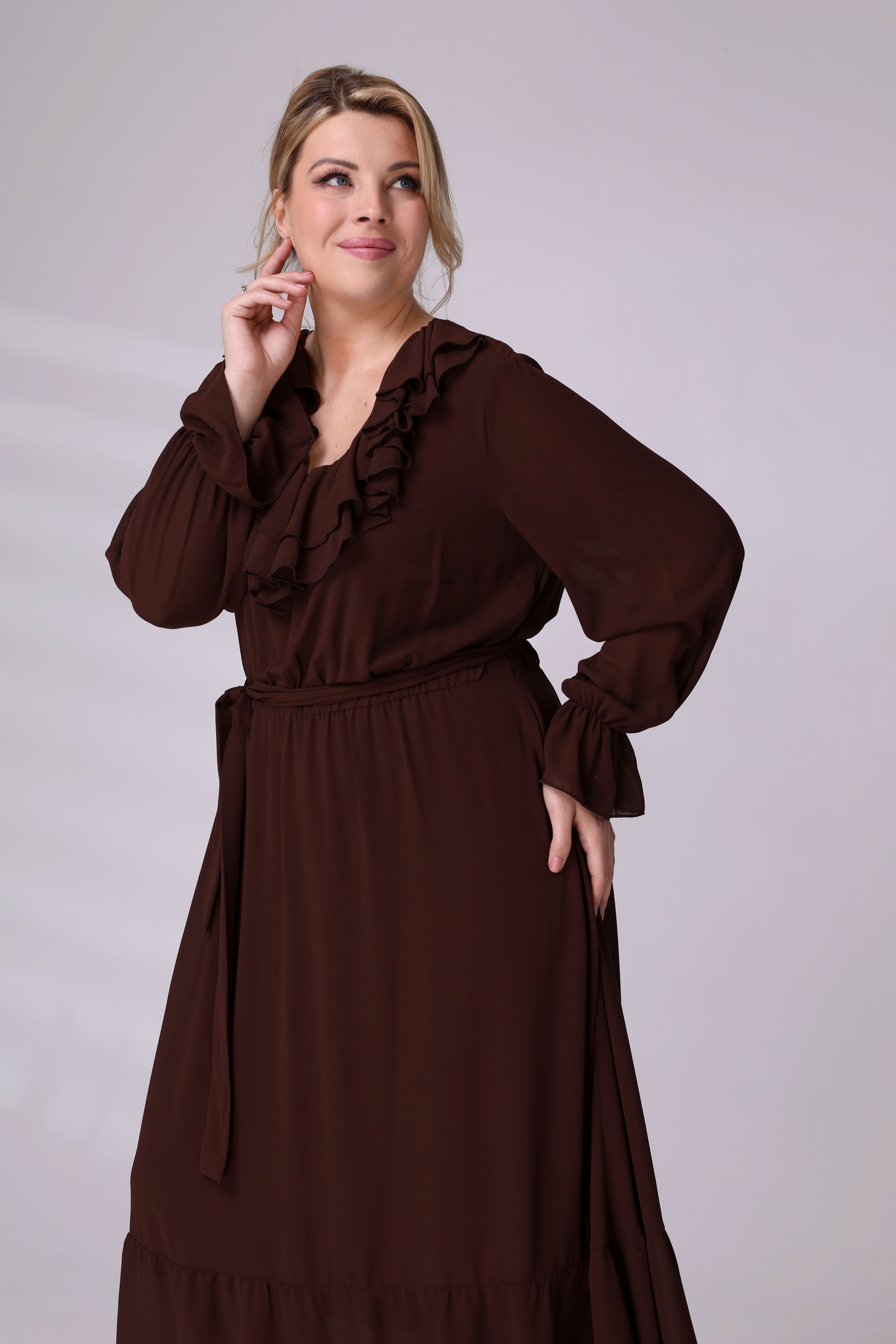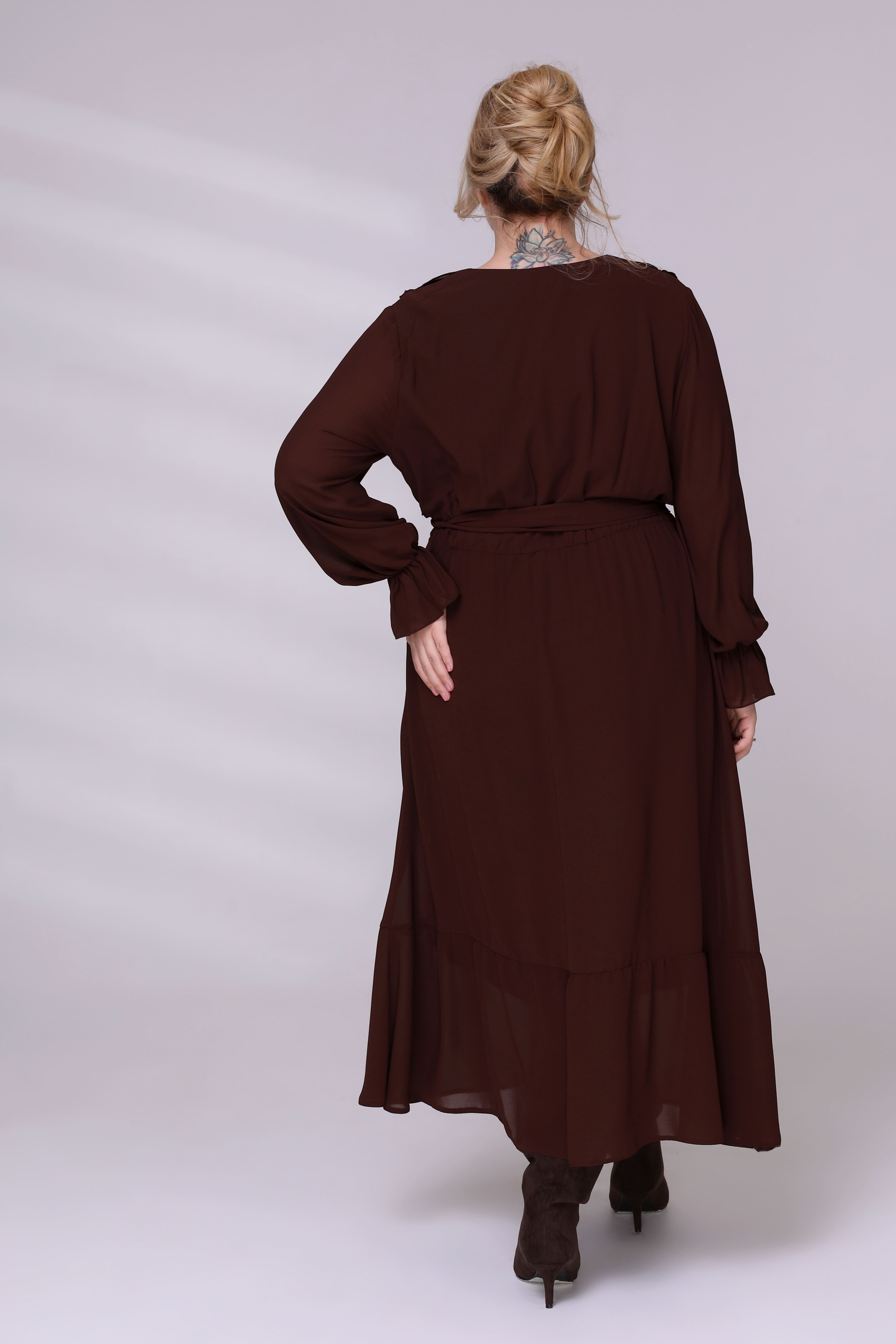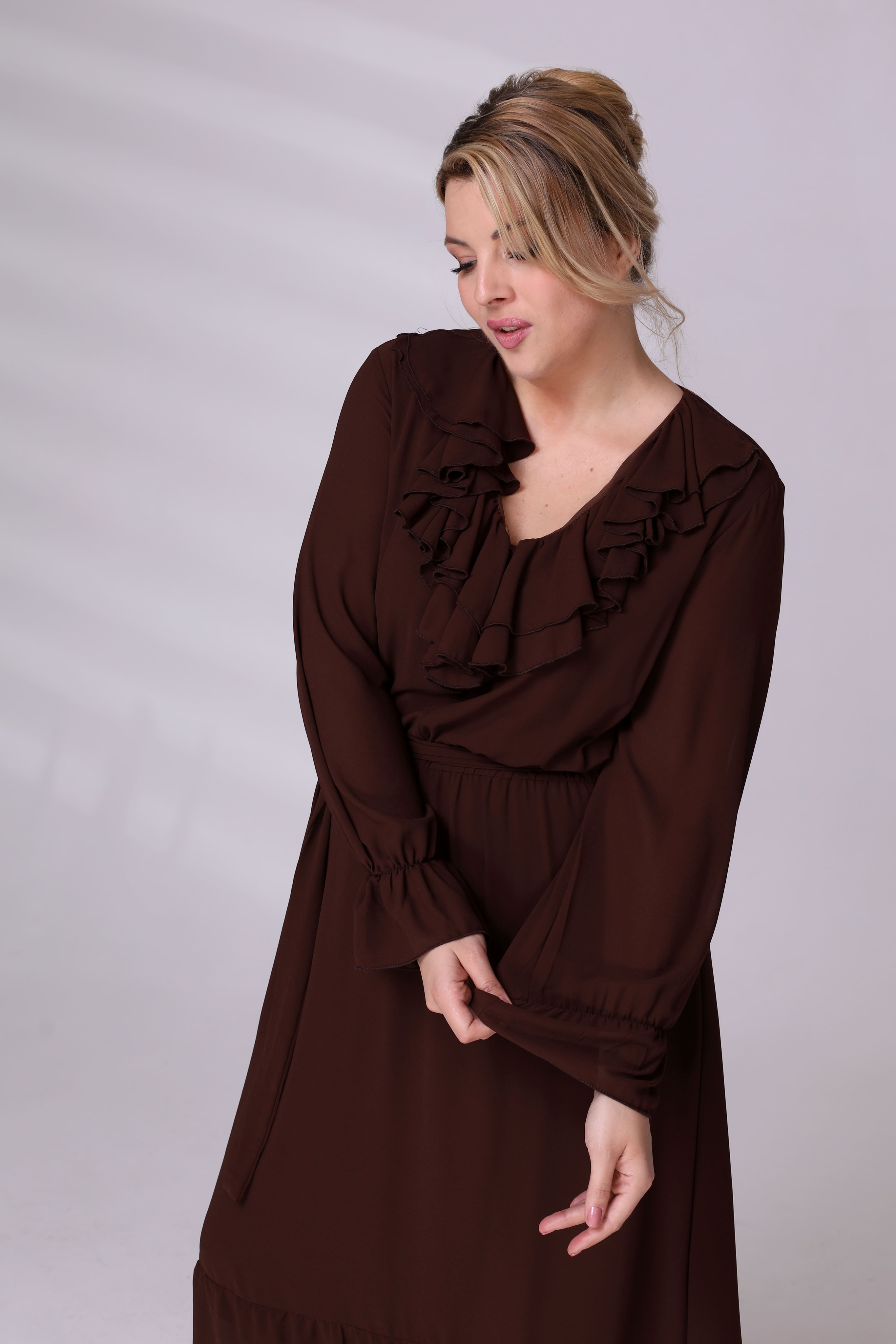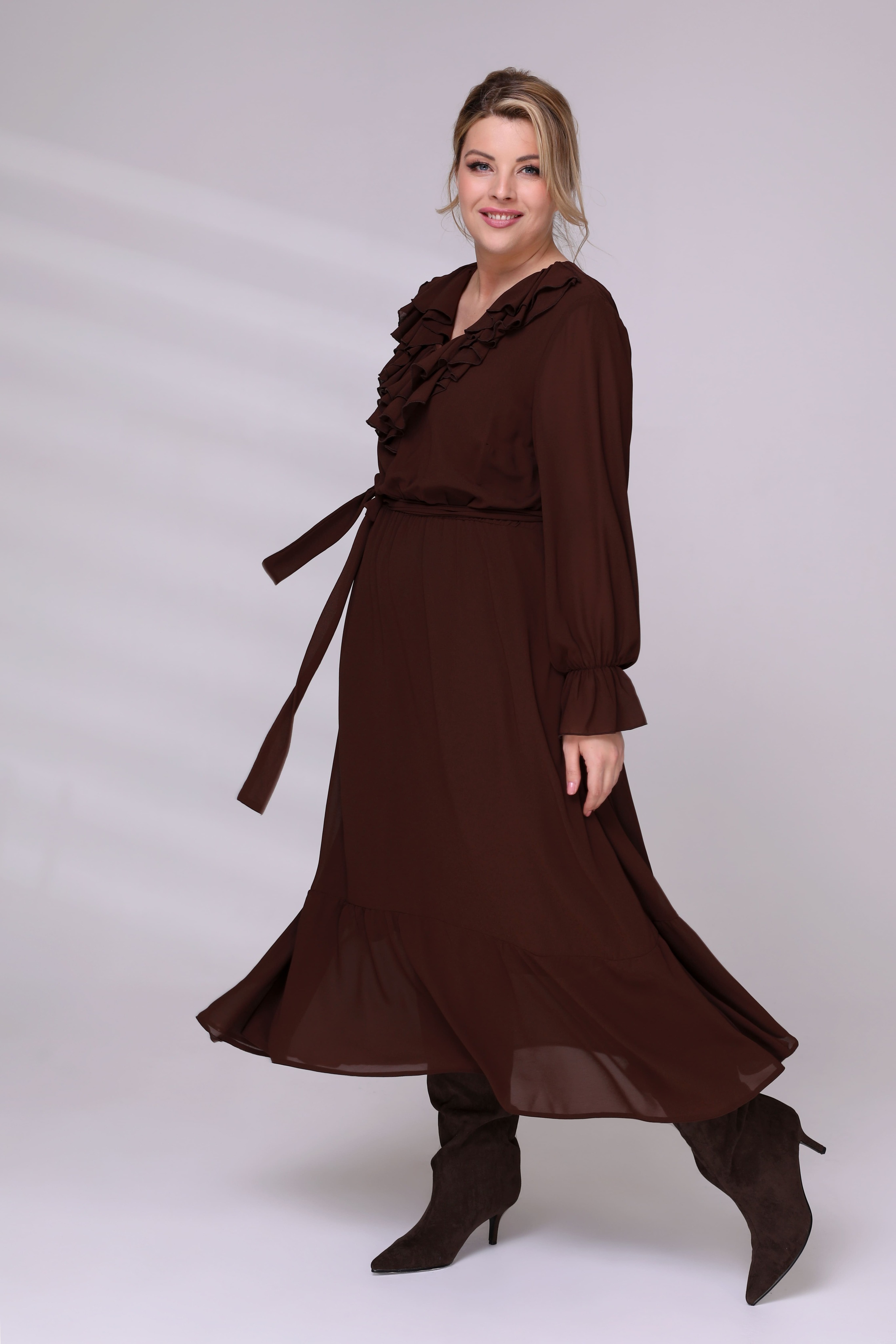 Платье на резинке с рюшами на вороте коричневое