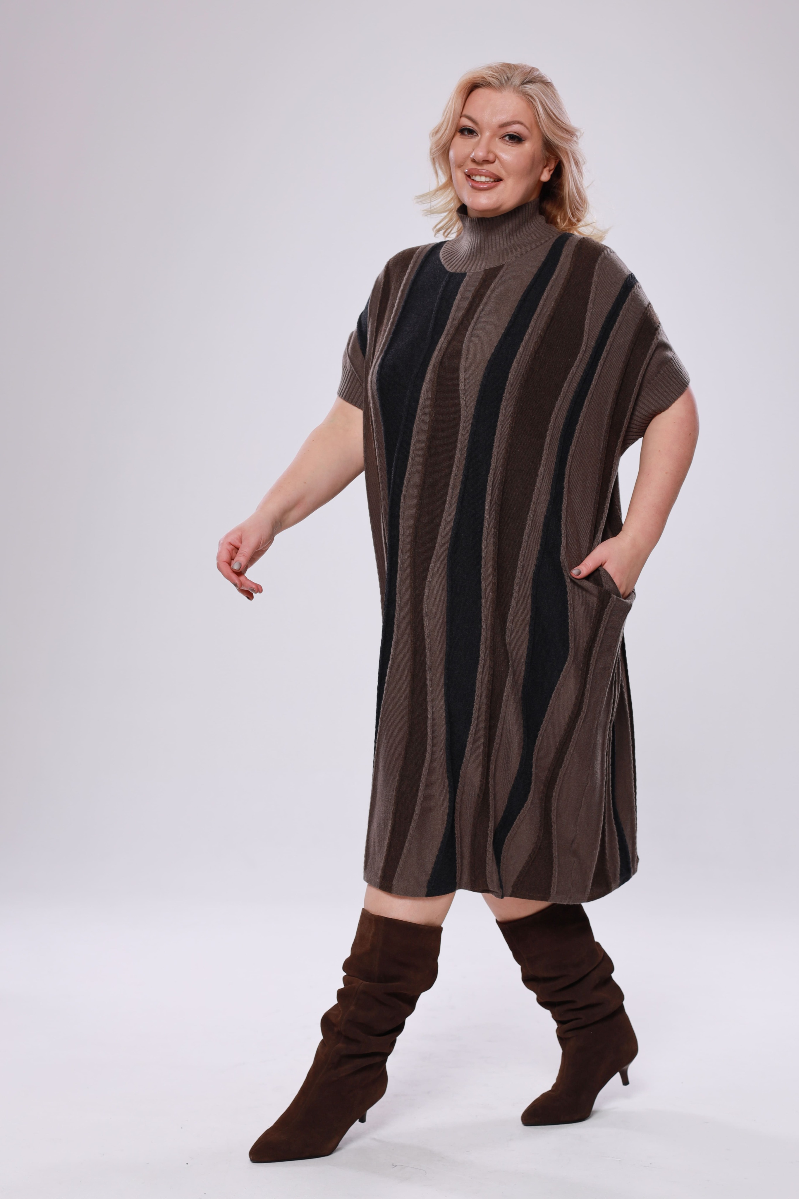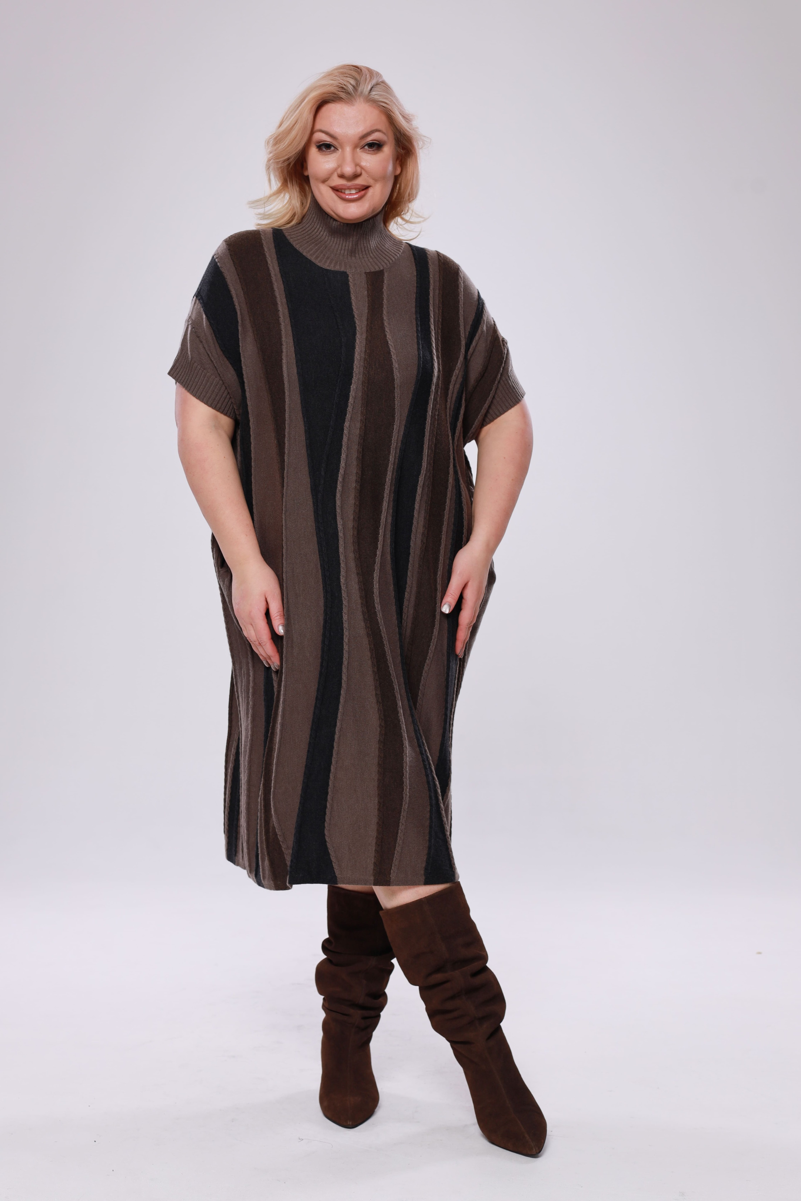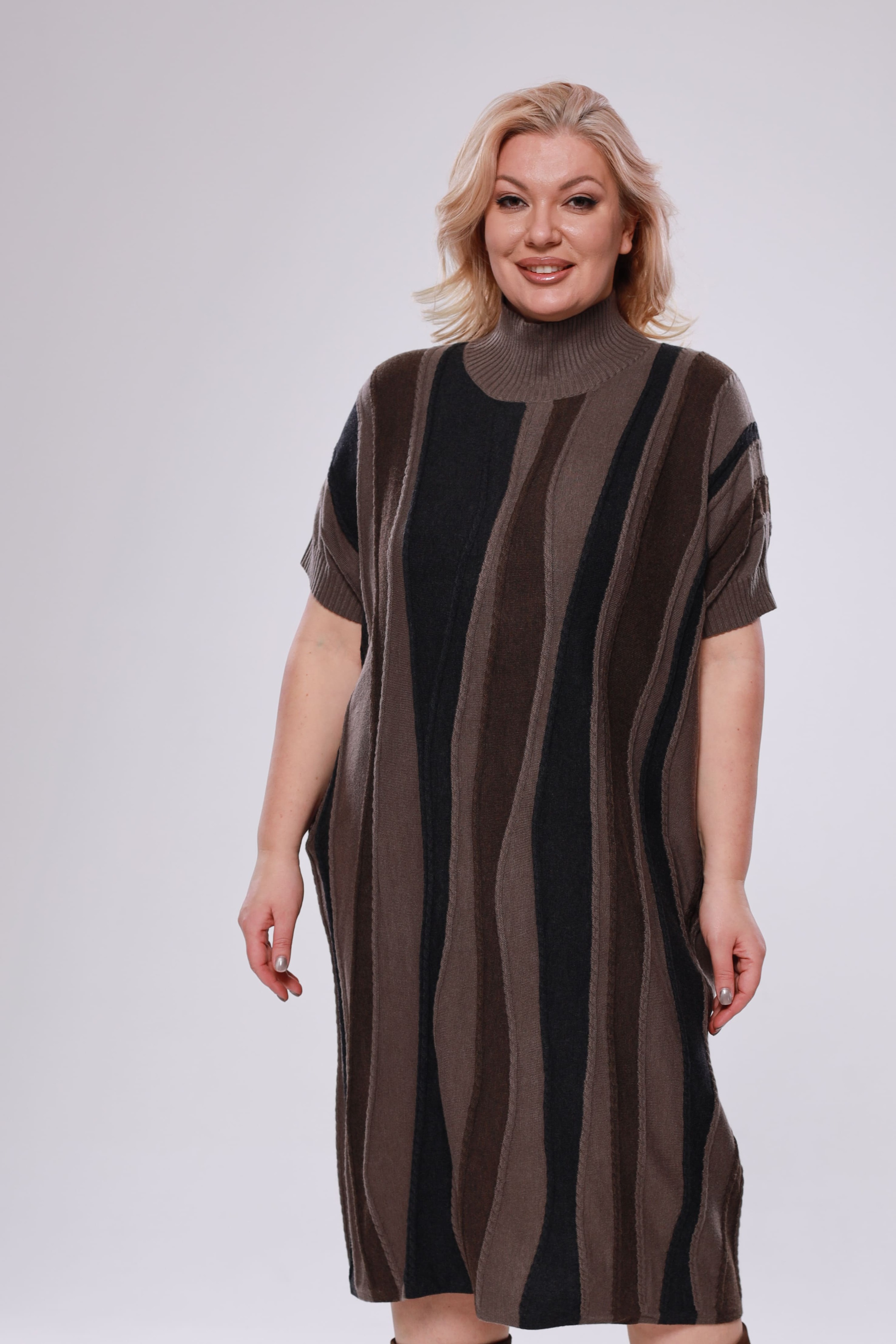 Элегантное платье-свитер из мягкого трикотажа и вязанного материала - идеальный выбор для прохладных дней, когда важно оставаться стильной и комфортной. модель имеет короткие приспущенные рукава. ворот с отворотом греет и защищает область шеи. благодаря своему крою и свободному силуэту, платье отлично подходит для женщин больших размеров, подчеркивая достоинства фигуры и создавая элегантный, женственный образ. модель легко сочетается с различными аксессуарами и обувью, что дает возможность создавать разнообразные образы — от строгого до более повседневного. создайте элегантный образ, который подчеркнет вашу индивидуальность и позволит чувствовать себя уверенно в любой ситуации.