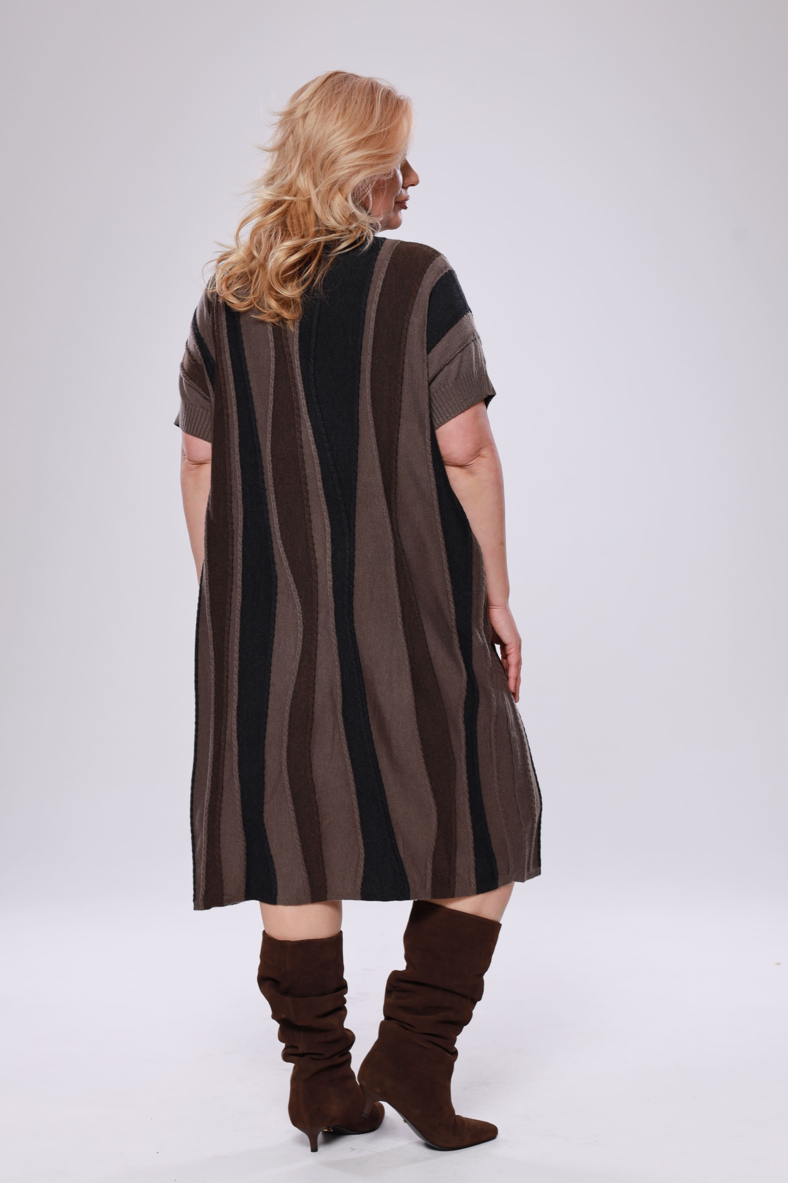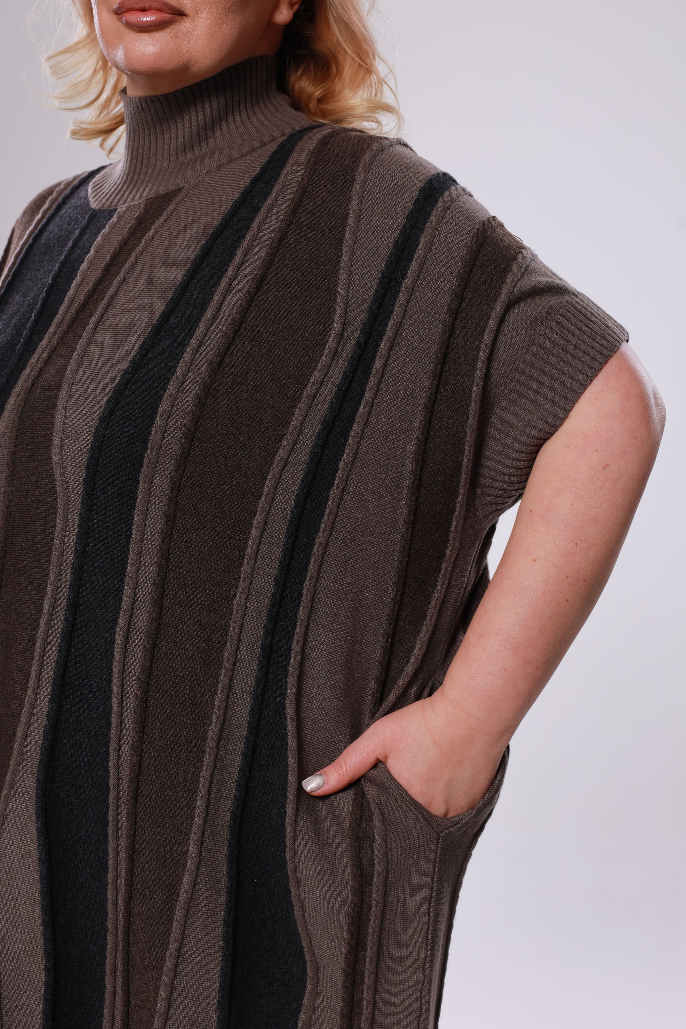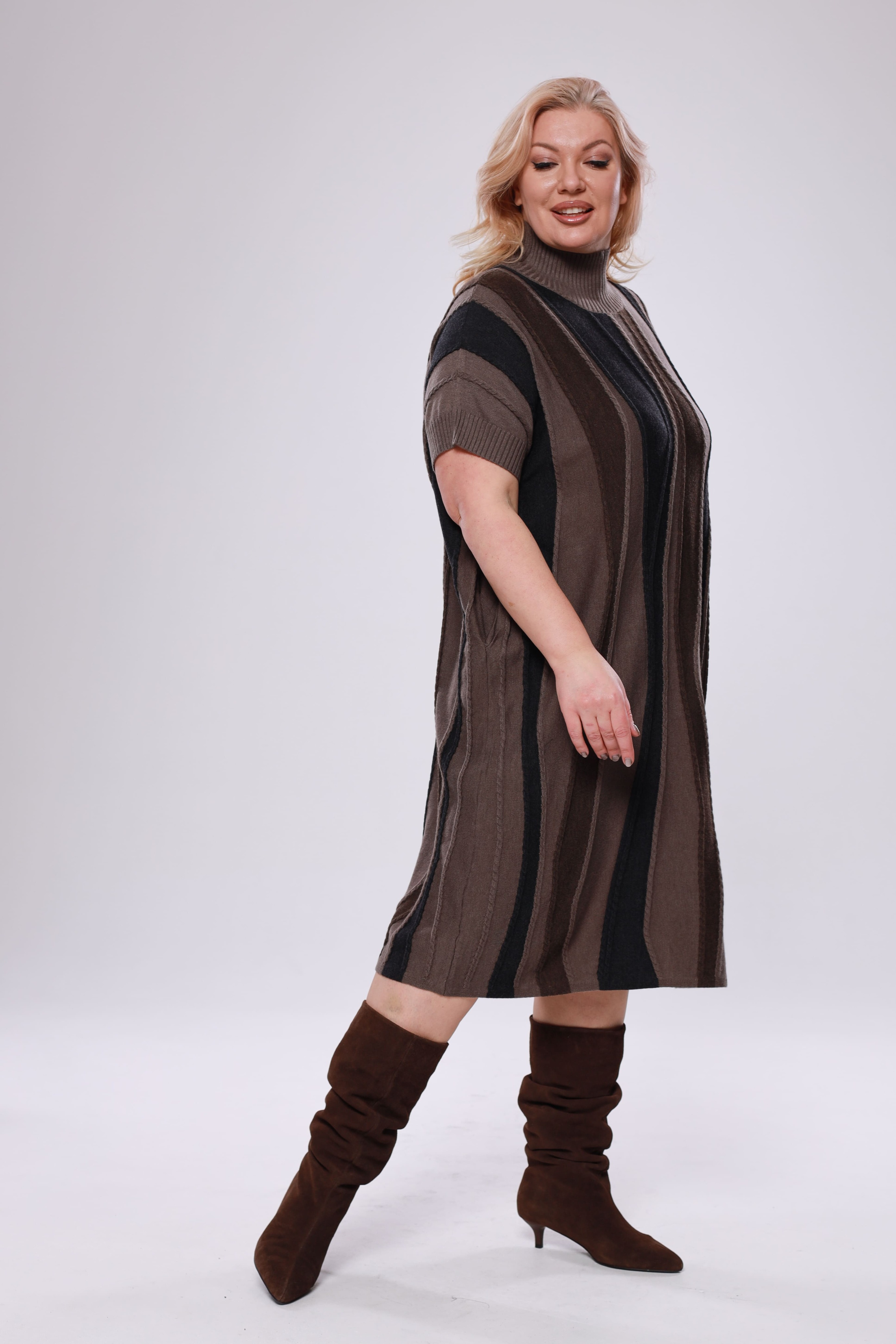 Элегантное платье-свитер из мягкого трикотажа и вязанного материала - идеальный выбор для прохладных дней, когда важно оставаться стильной и комфортной. модель имеет короткие приспущенные рукава. ворот с отворотом греет и защищает область шеи. благодаря своему крою и свободному силуэту, платье отлично подходит для женщин больших размеров, подчеркивая достоинства фигуры и создавая элегантный, женственный образ. модель легко сочетается с различными аксессуарами и обувью, что дает возможность создавать разнообразные образы — от строгого до более повседневного. создайте элегантный образ, который подчеркнет вашу индивидуальность и позволит чувствовать себя уверенно в любой ситуации.