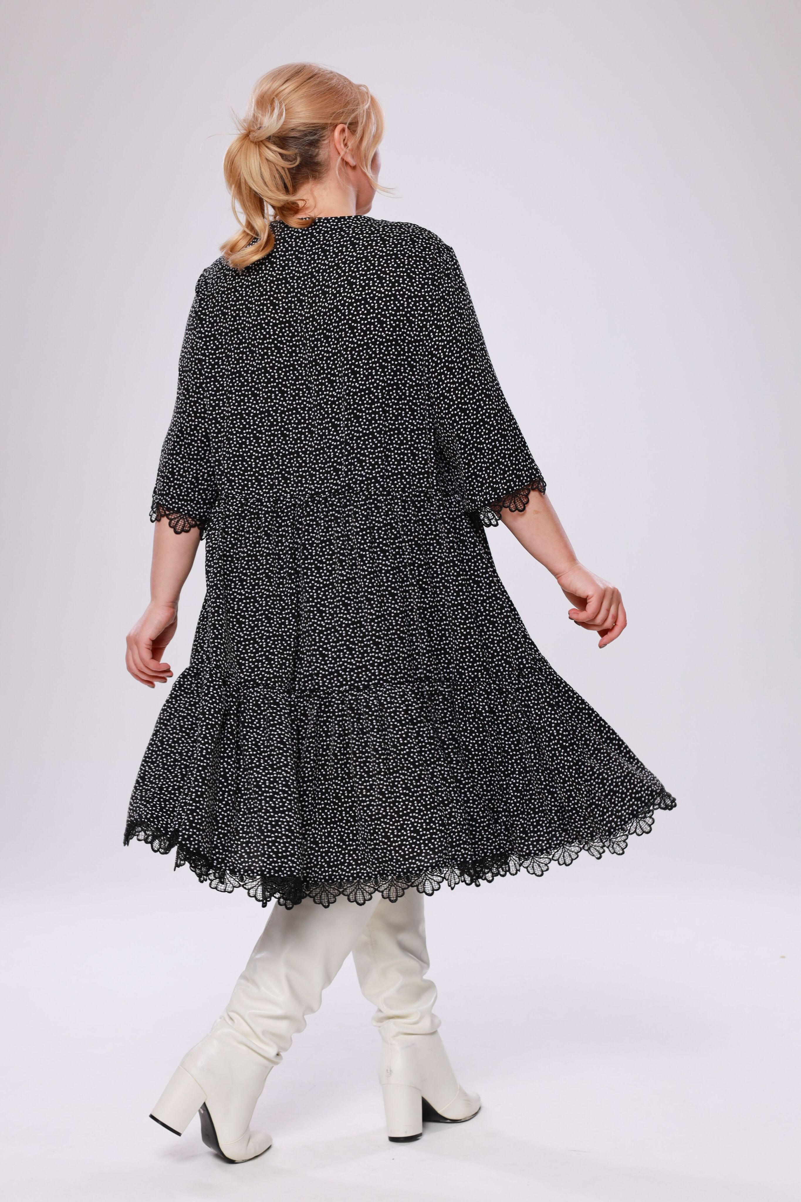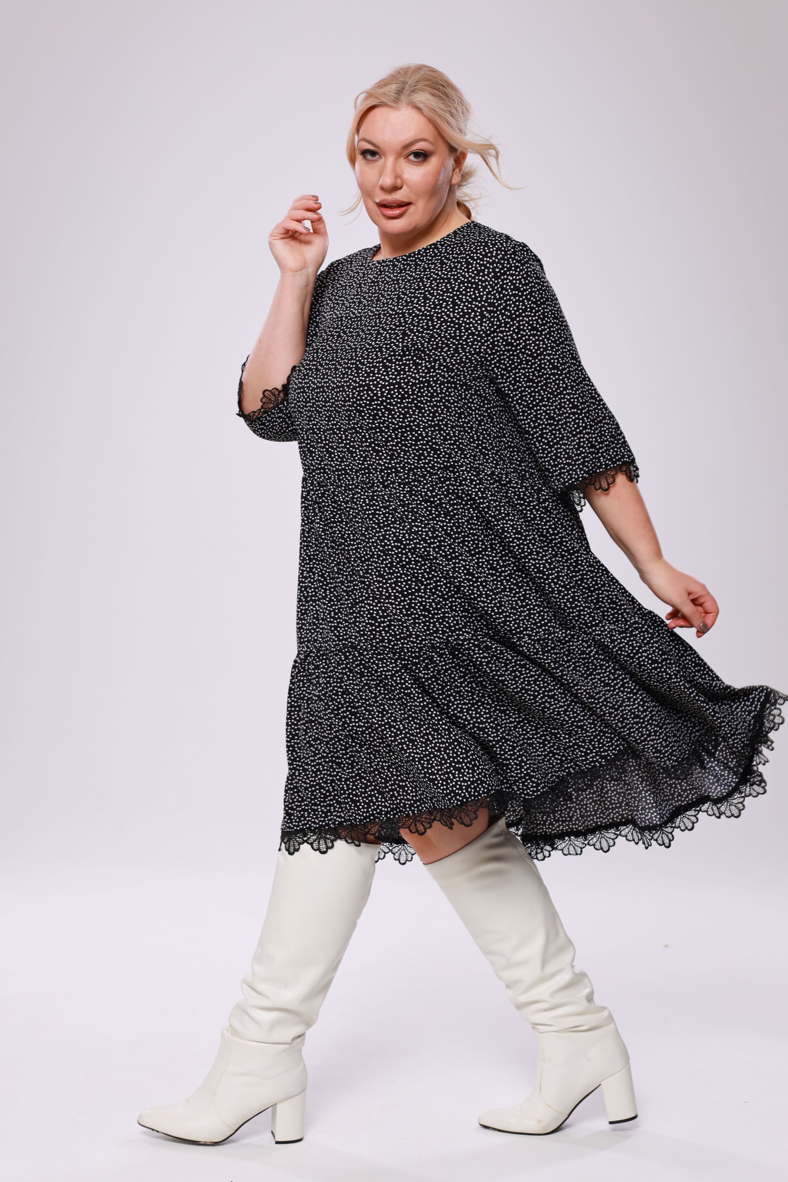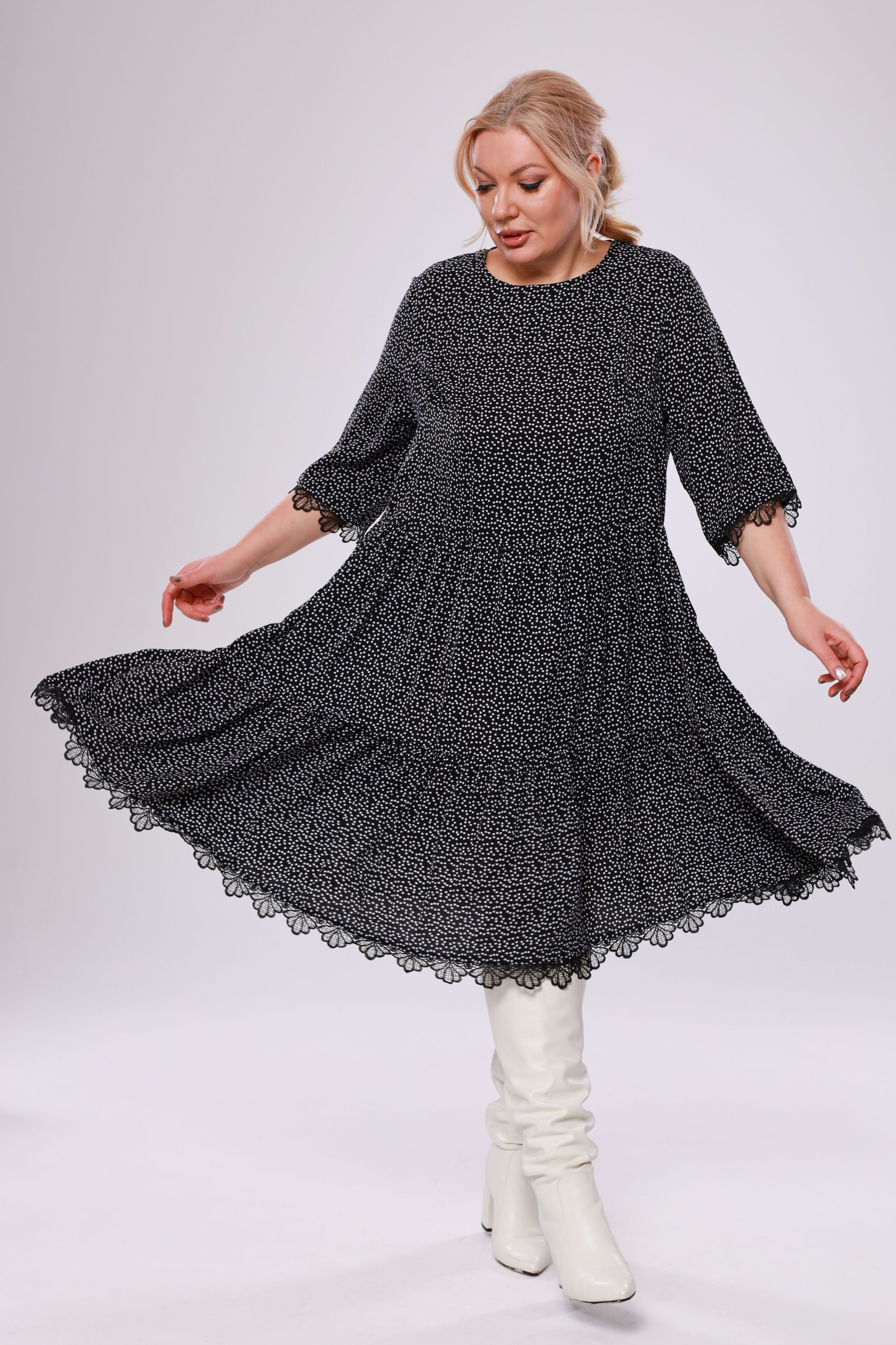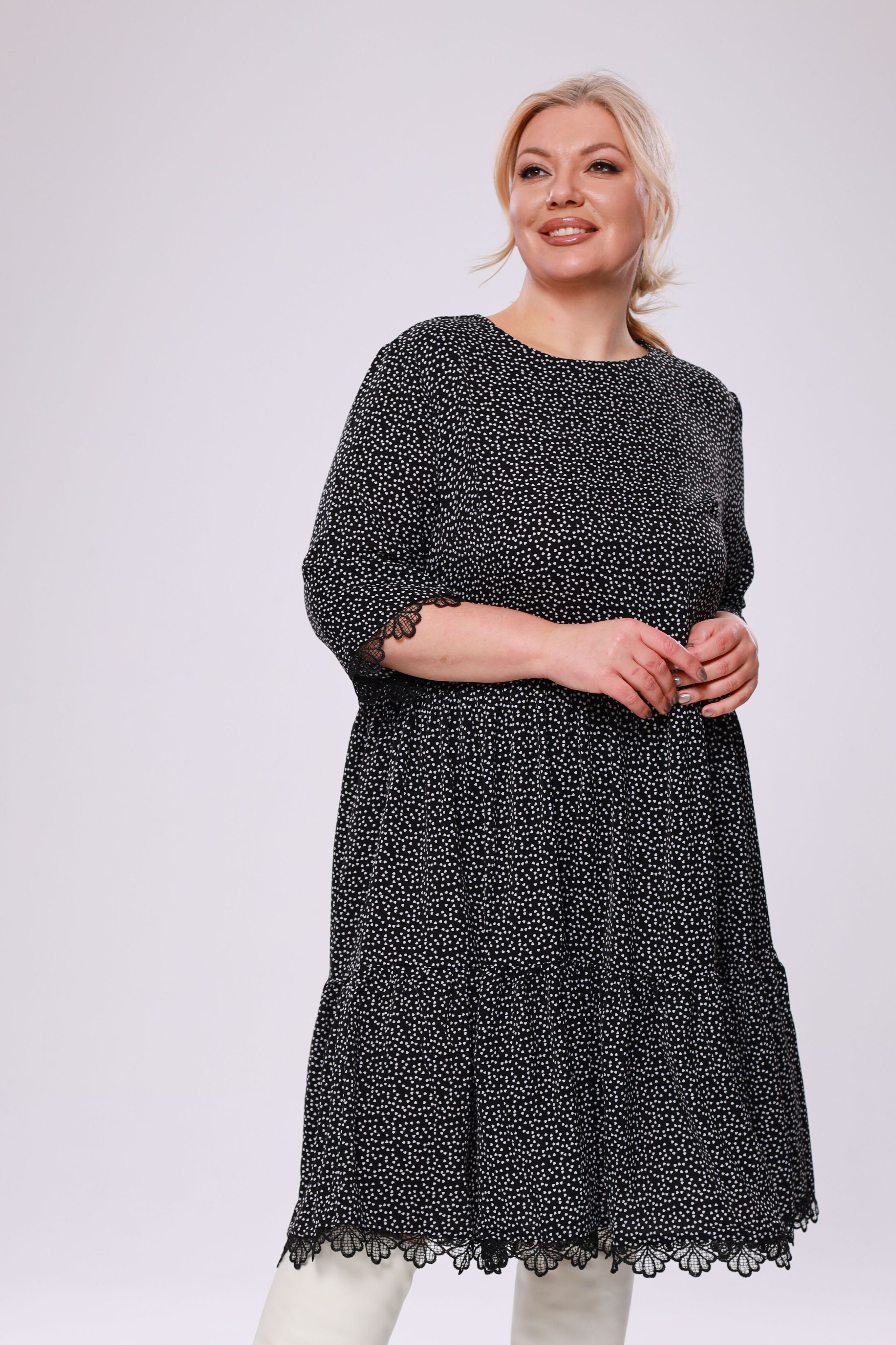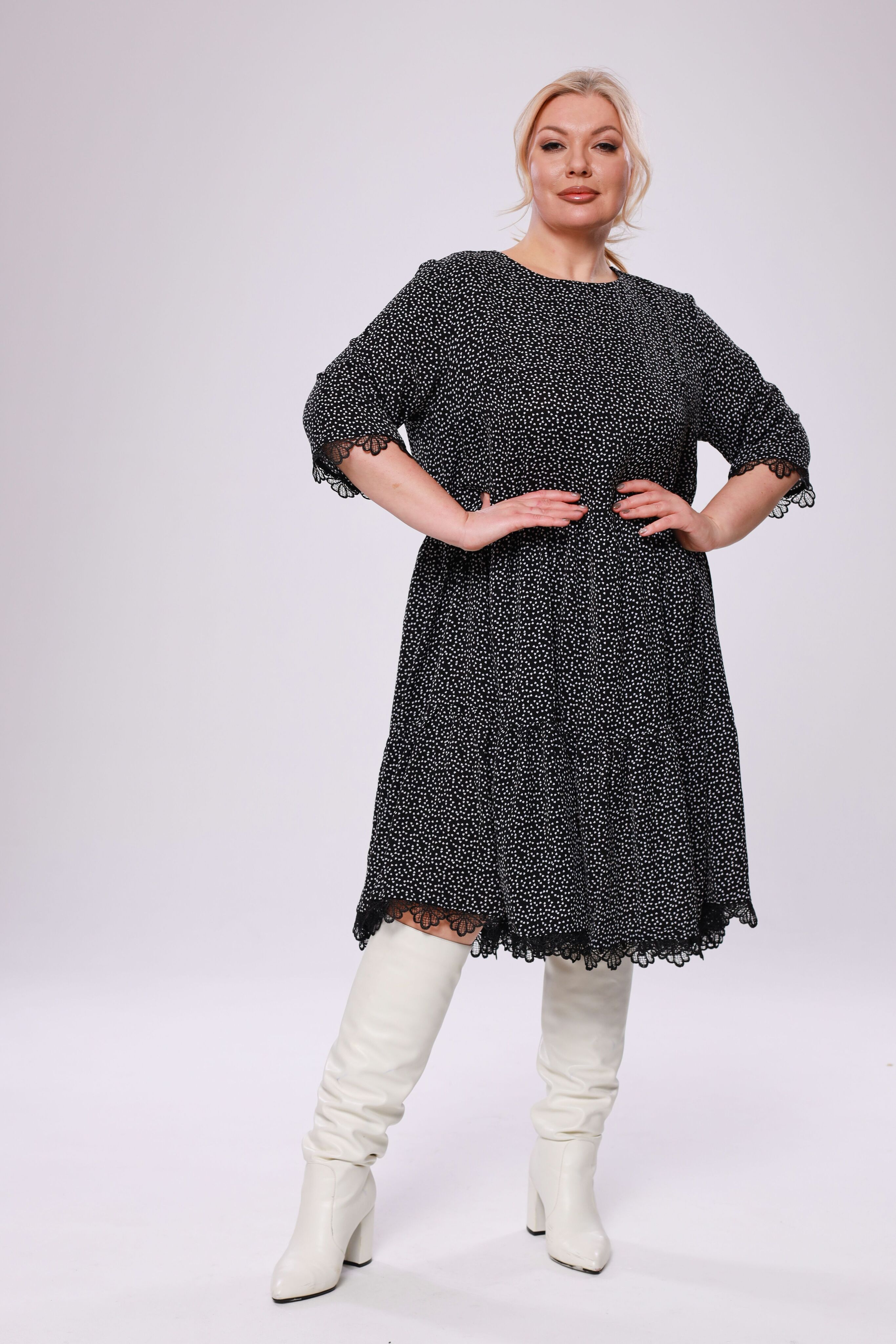 Платье шифон с воланами к низу в горошек черное