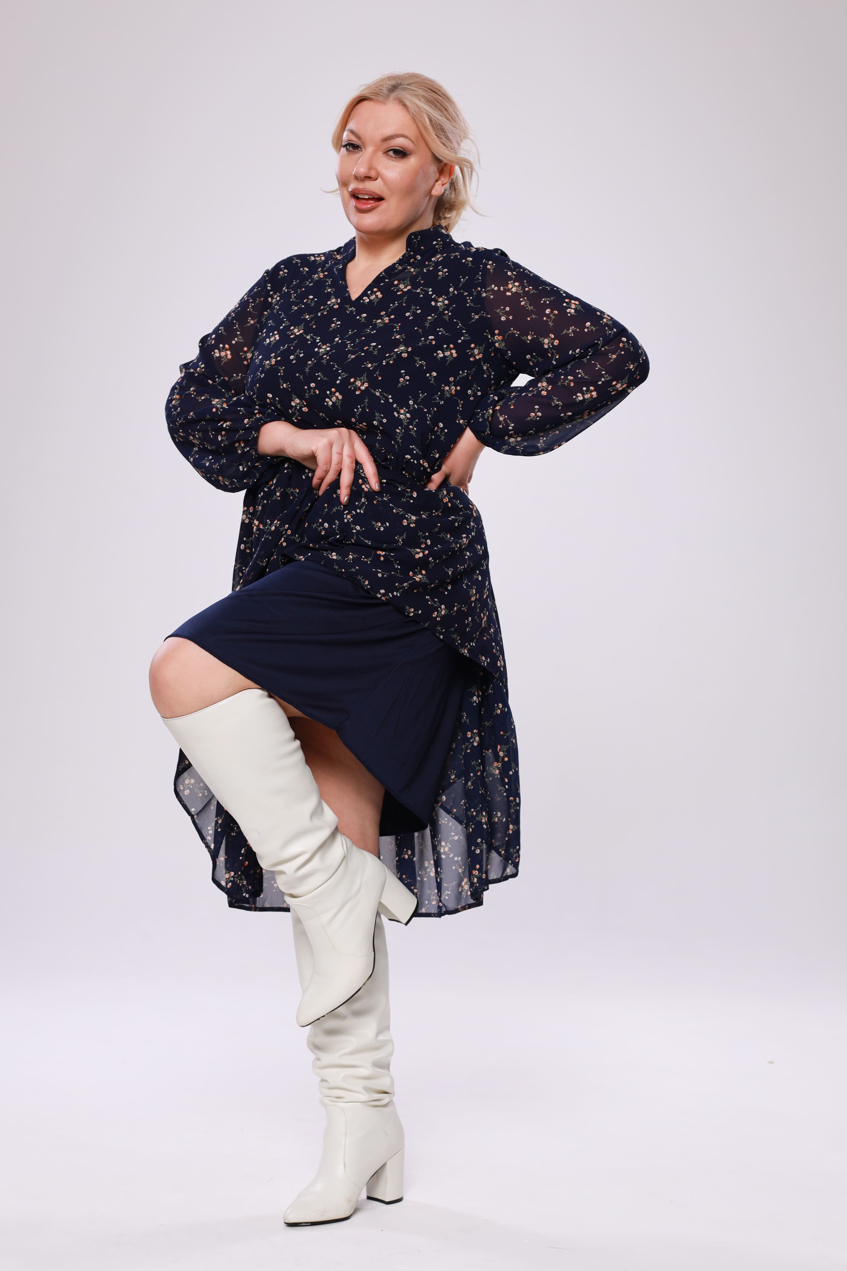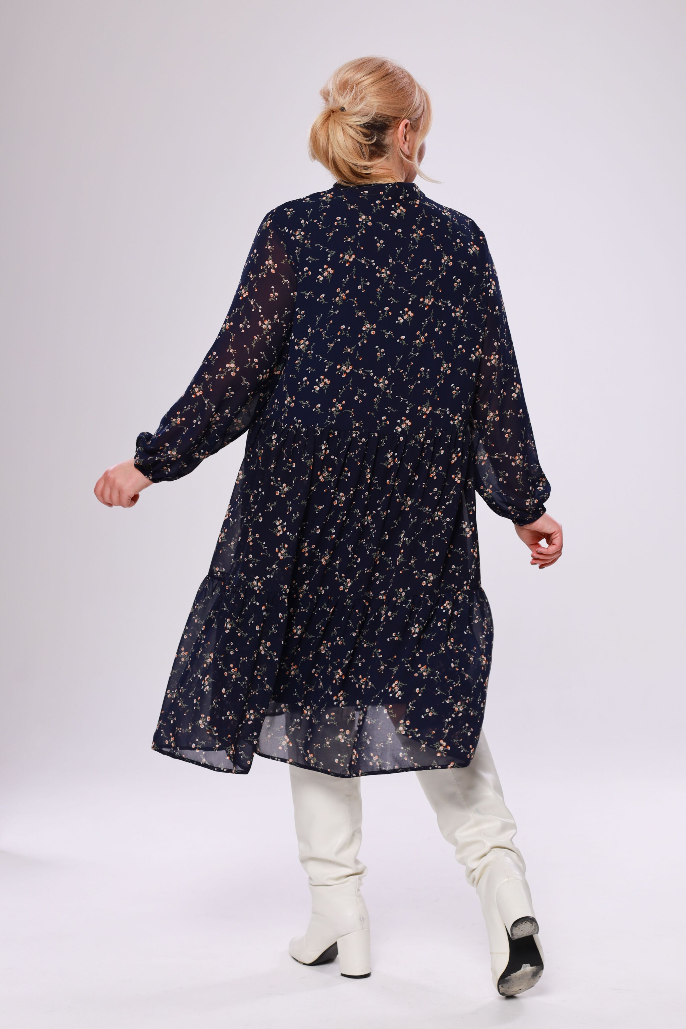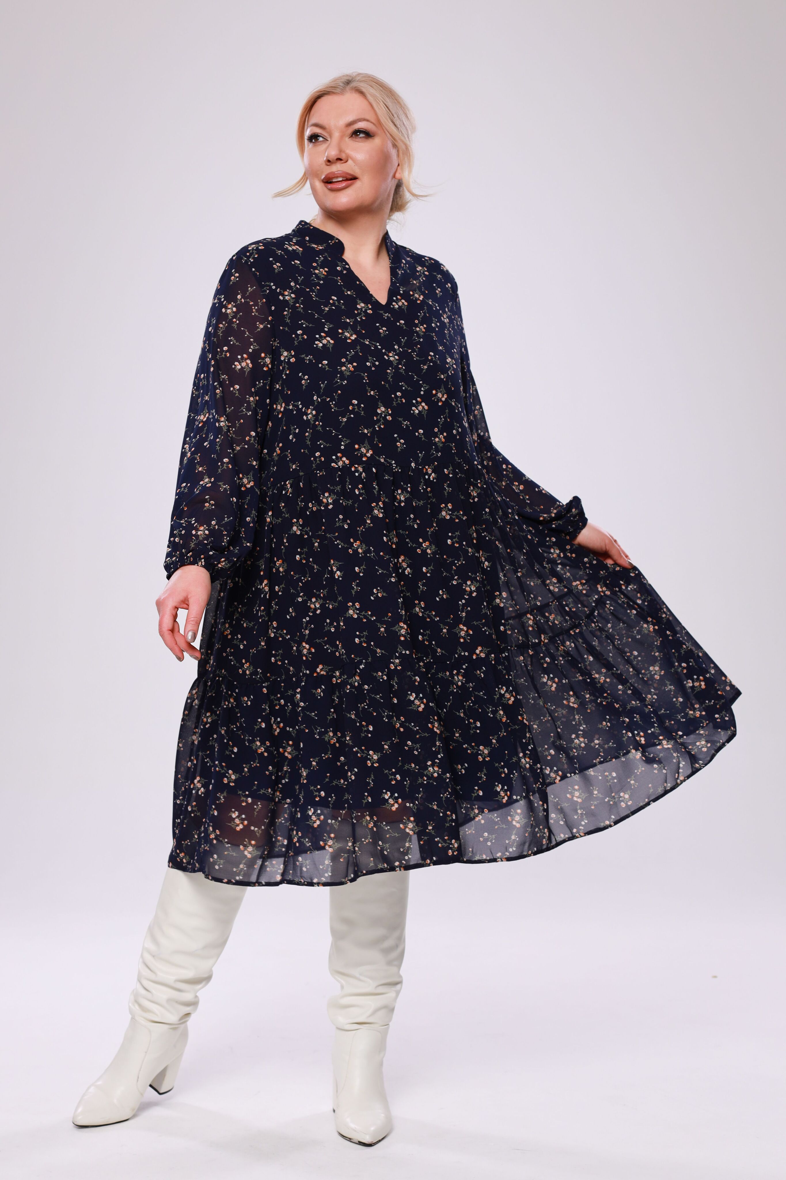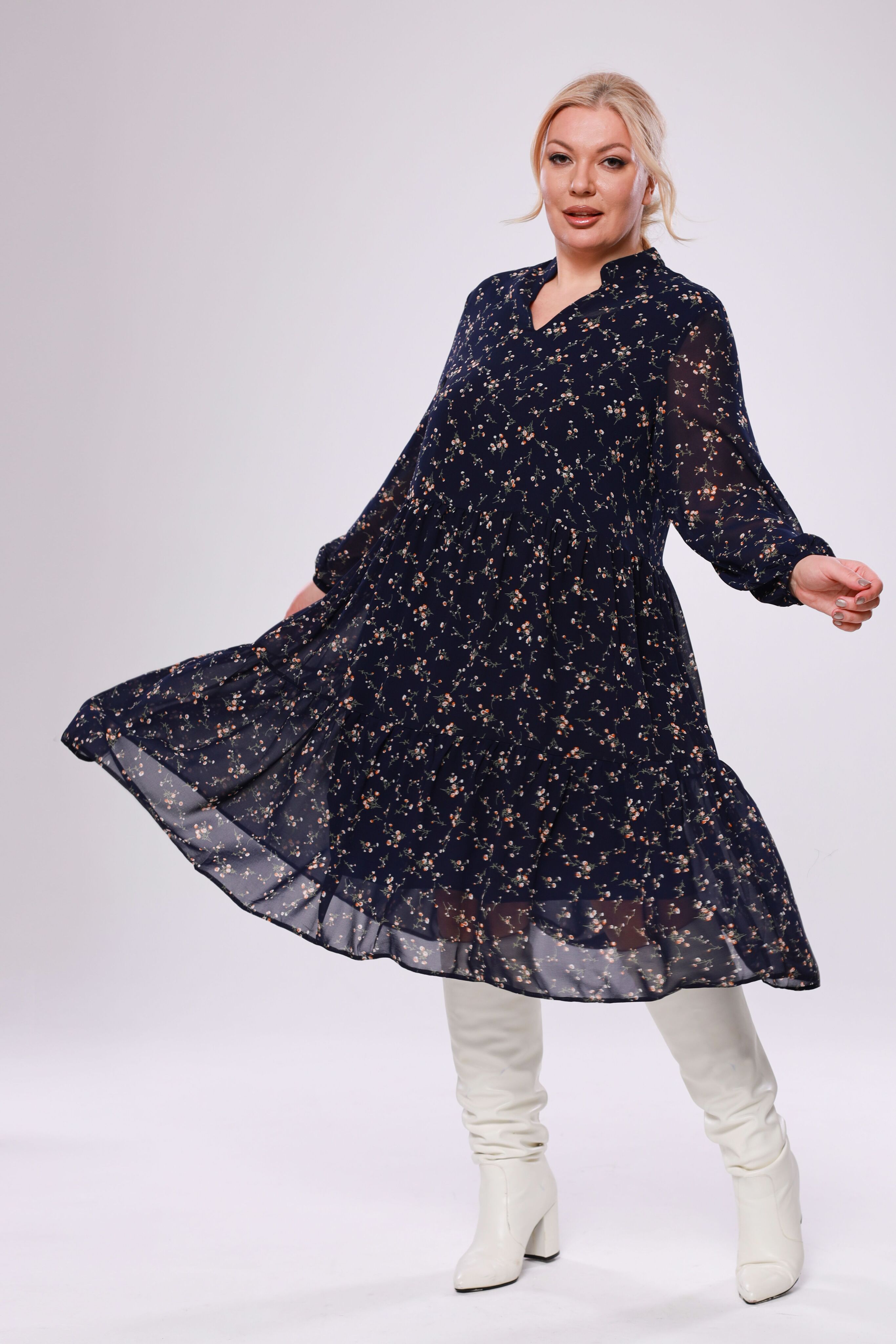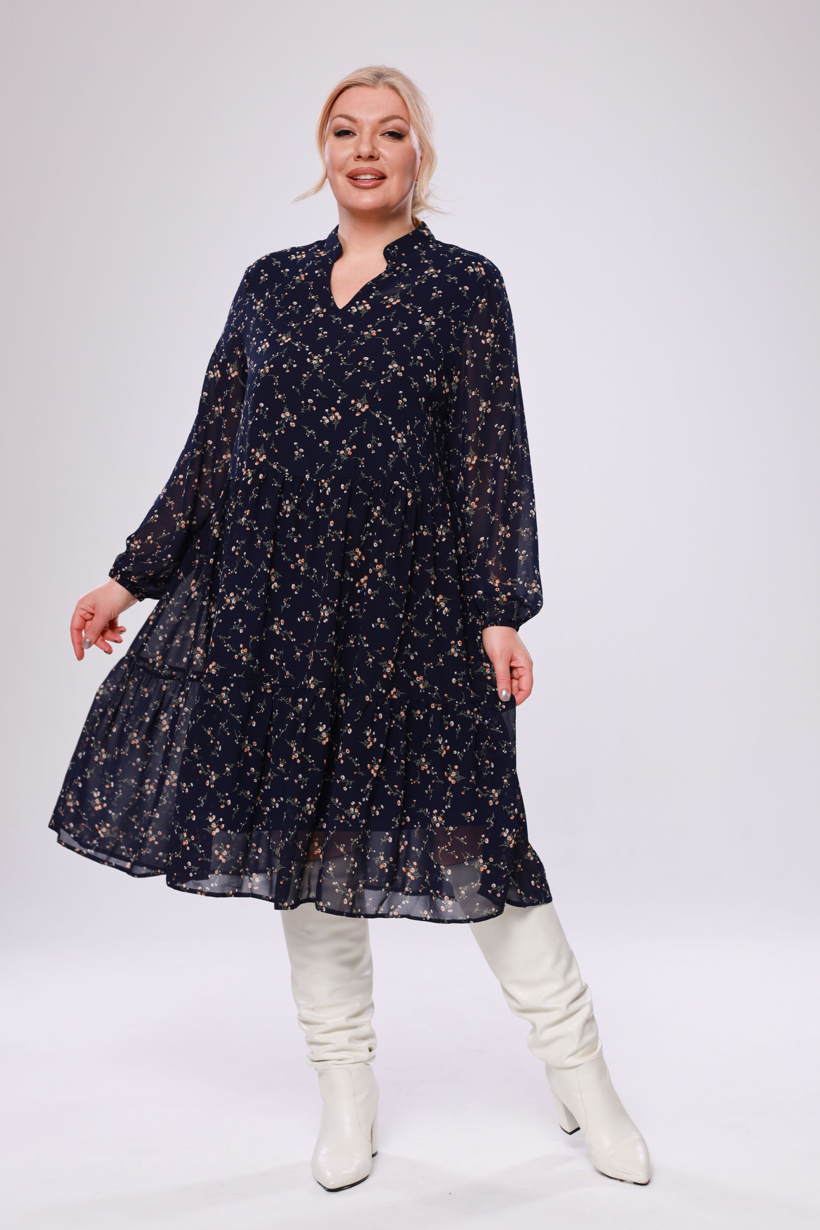 Элегантное платье миди из мягкого полупрозрачного шифона на эластичной подкладке. модель имеет v-образный вырез дополненный воротом-стойкой и рукава полной длины с тонкими манжетами по низу. отрезная по линии бедер многоярусная юбка искусно обыгрывает фигуру и подчеркивает женственность образа. центральный шов по спинке способствует оптимальной посадке по фигуре. актуальный растительный принт добавляет динамичности и освежает образ. для завершения стильного образа используйте яркие аксессуары и туфли на высоких каблуках