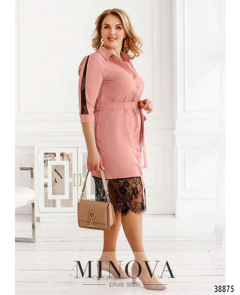 Экстравагантное платье-рубашка большого размера с отложным воротничком, рукава- с небольшими манжетами без пуговиц. застёгивается на ряд пуговиц спереди на планке. рукава и подол украшены тонким цветочным кружевом. по бокам - врезные карманы, на груди вытачки. в комплекте пояс в тон. подол подшит к верху.