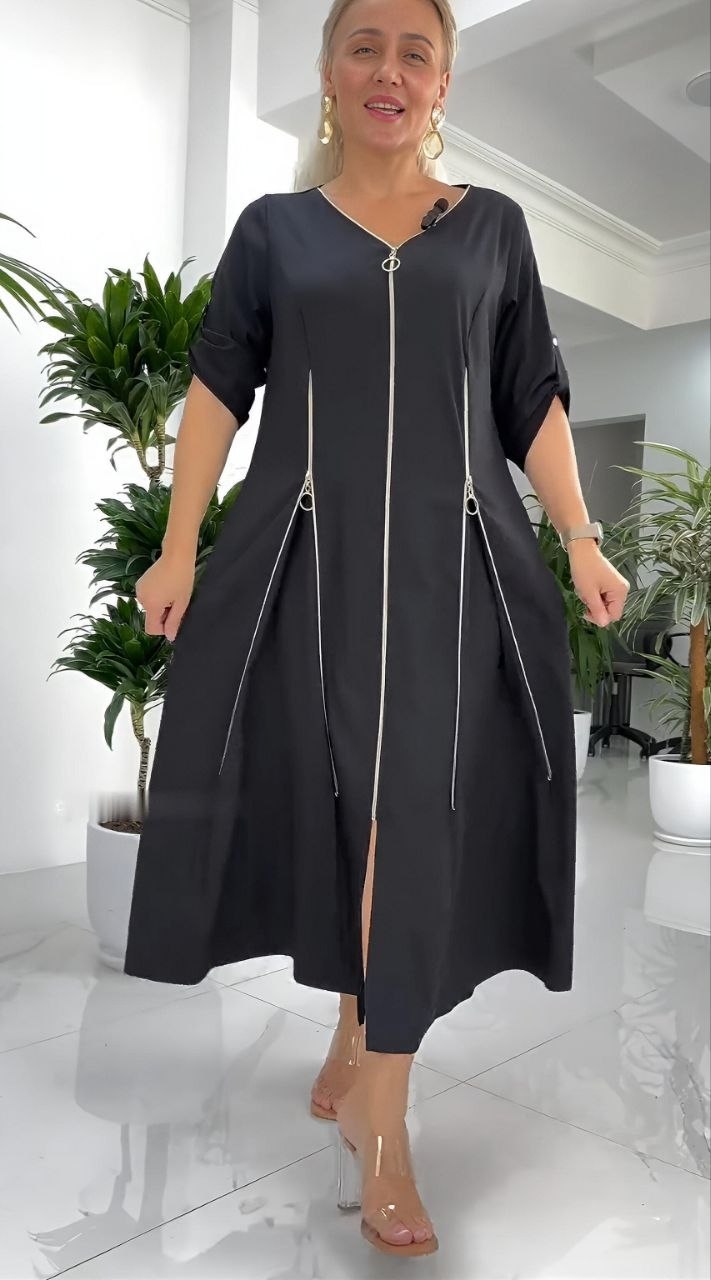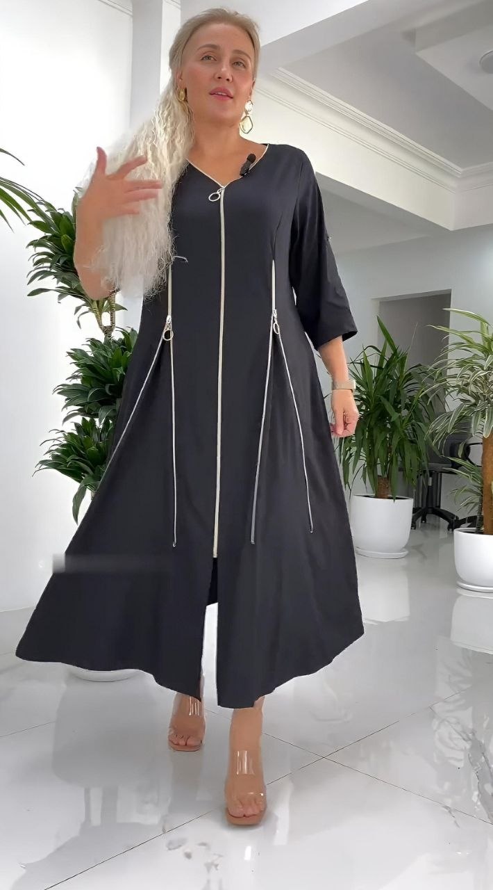 Стильное платье, красиво садится по фигуре, мягко скрывает нюансы в зоне живота и бедер. вертикальные золотые молнии визуально струятся. ткань имеет хорошую растяжимость, не сковывает движения. рукав регулируется патами.