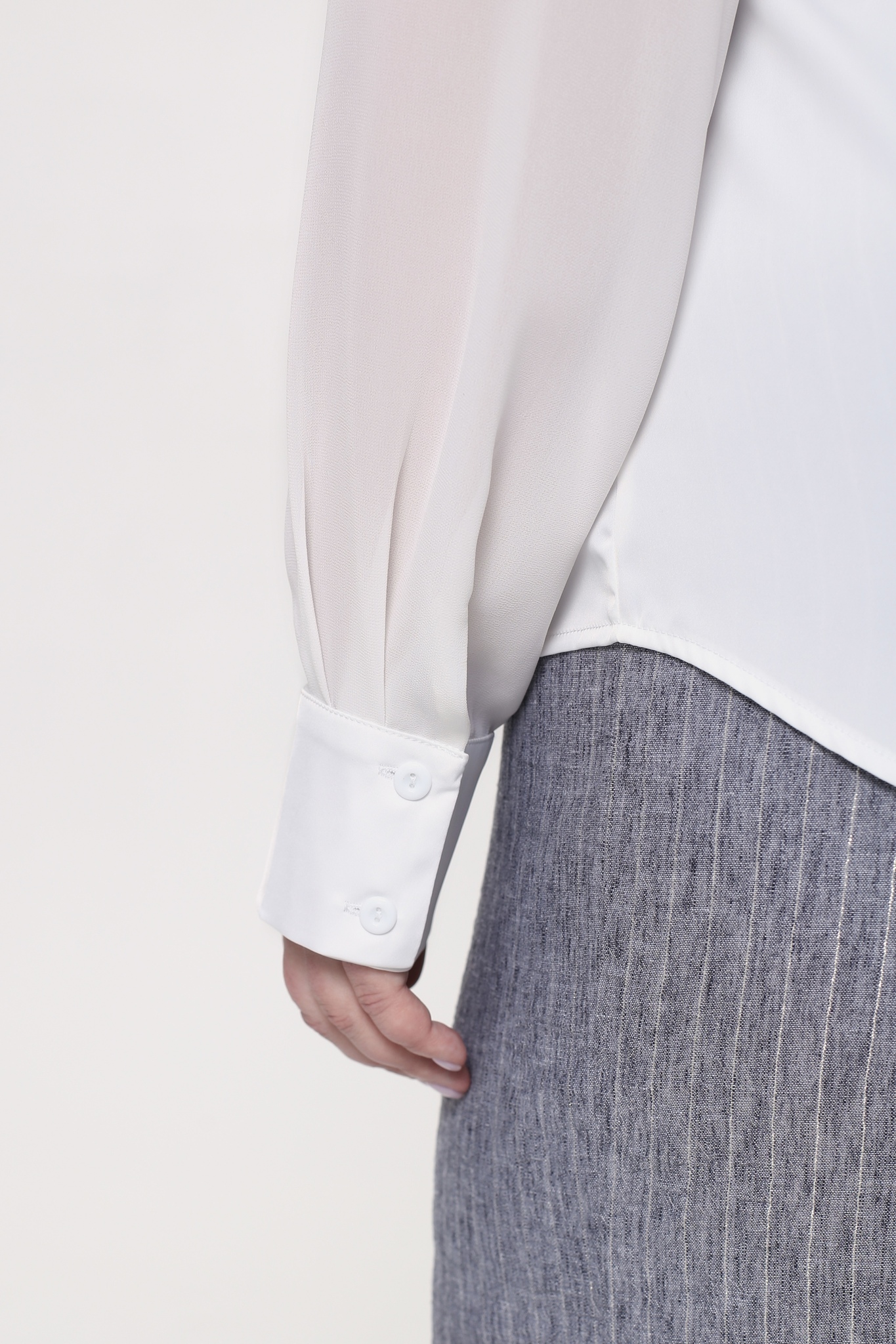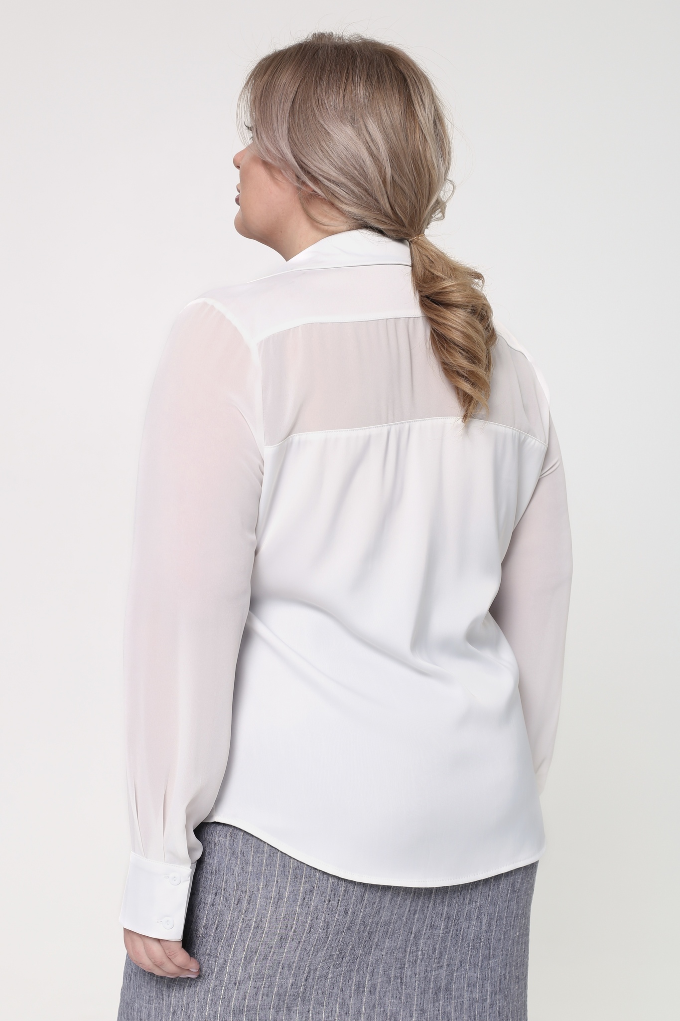 Рубашка с прозрачной кокеткой белая Состав: 71%-вискоза; 27%-полиэстер; 2%-эластан. Параметры модели: Рост 173 см, Размер 54