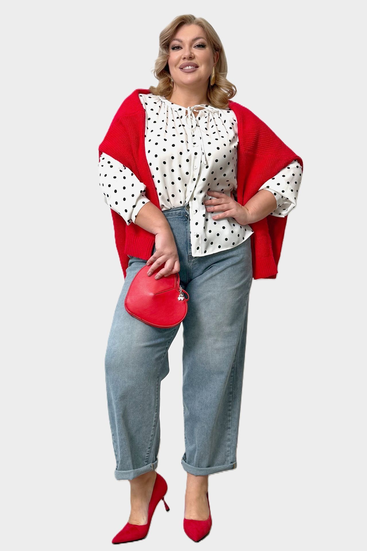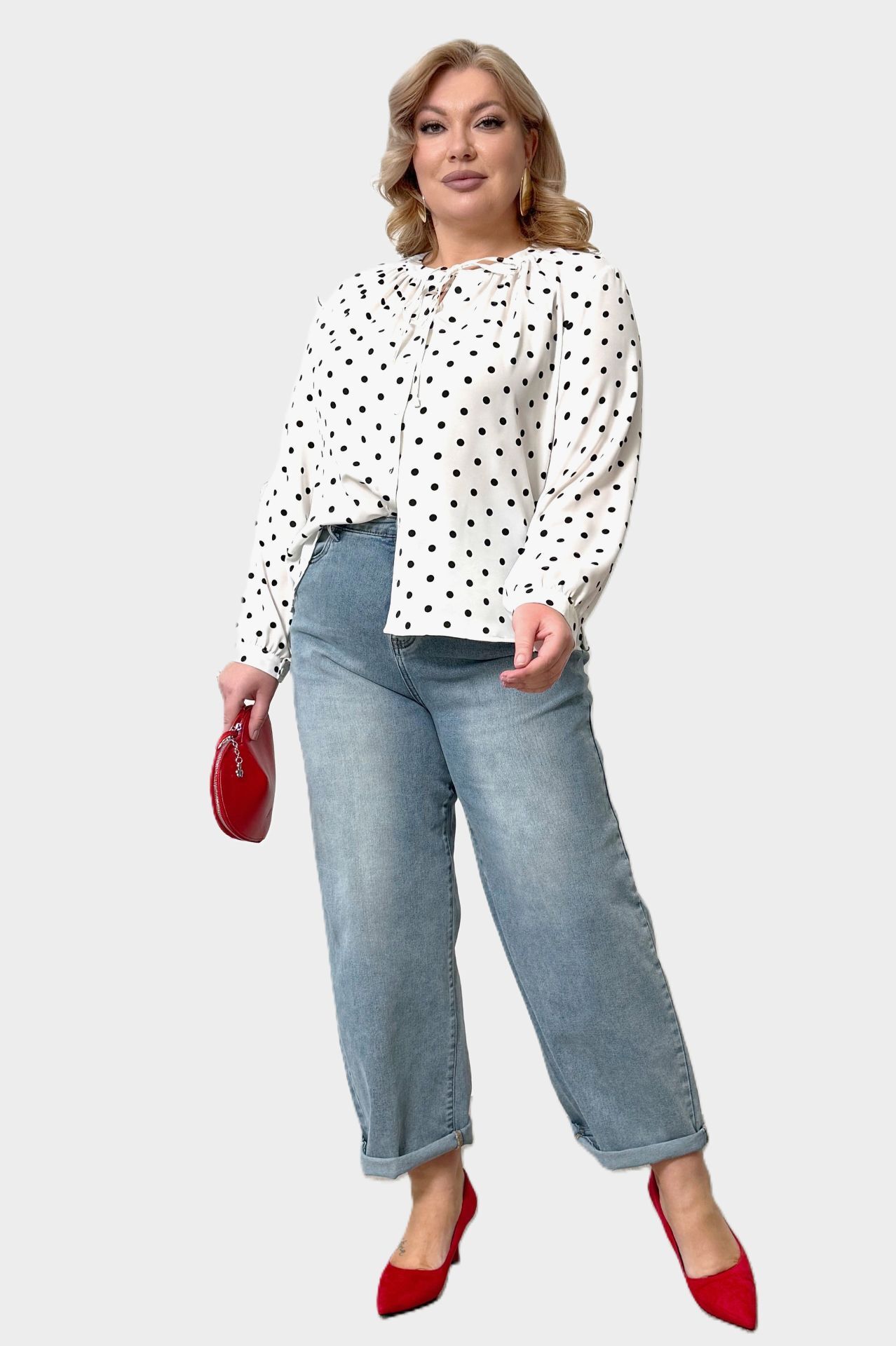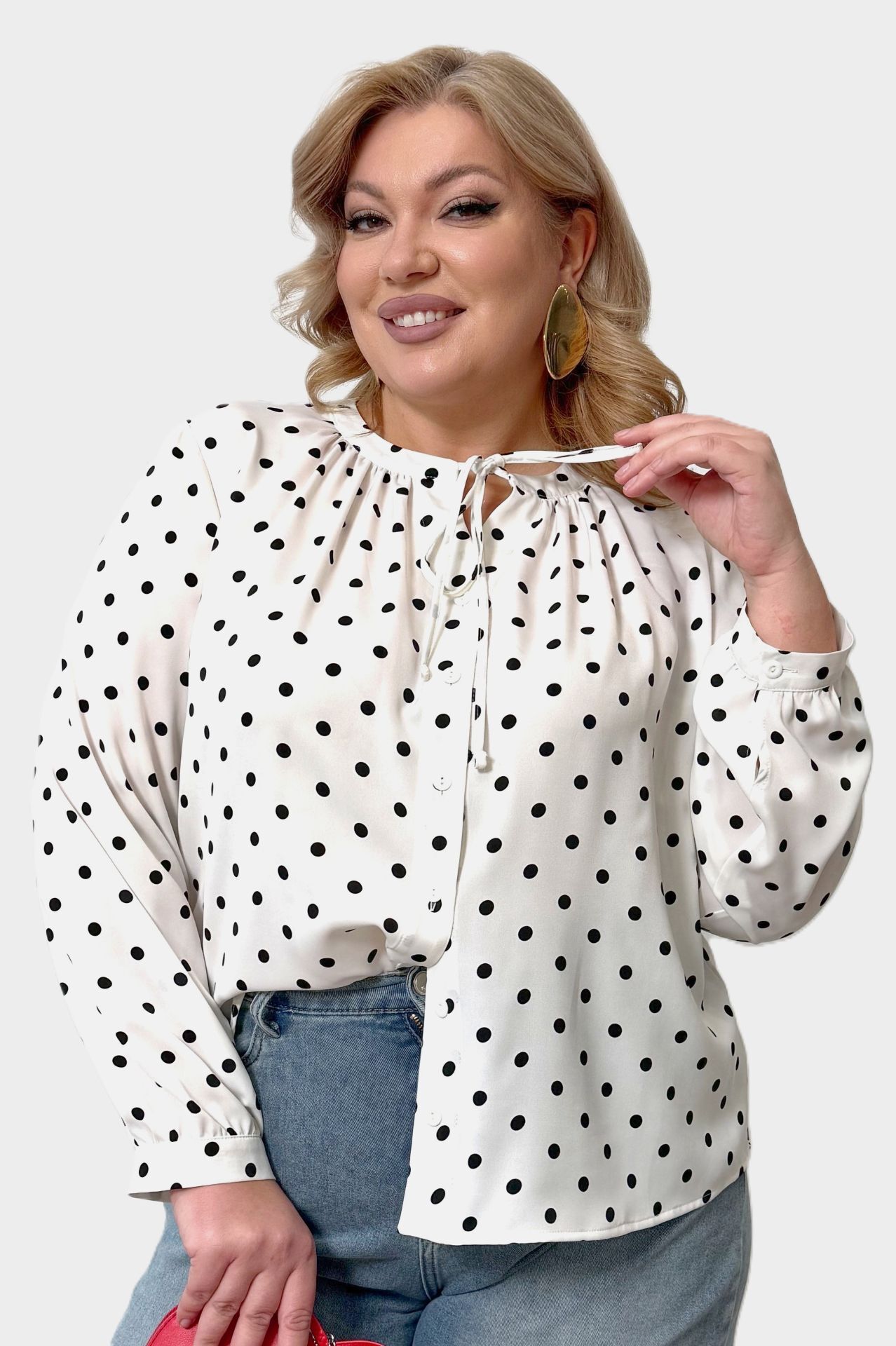 Лаконичная рубашка прямого кроя из мягкого струящегося материала - идеальный вариант для женщин, ценящих простоту и элегантность. модель привлекает оригинальным дизайном. рубашка застегивается спереди на оригинальные пуговки под планку. круглый вырез на груди декорирован завязкой. рукава полной длины застегиваются на пуговках по низу. актуальный гороховый принт добавляет динамичности и освежает образ. свободный крой искусно обыгрывает силуэт, а мягкий, приятный телу материал подарит комфорт на весь день. отлично подходит для комбинирования с брюками и юбками.