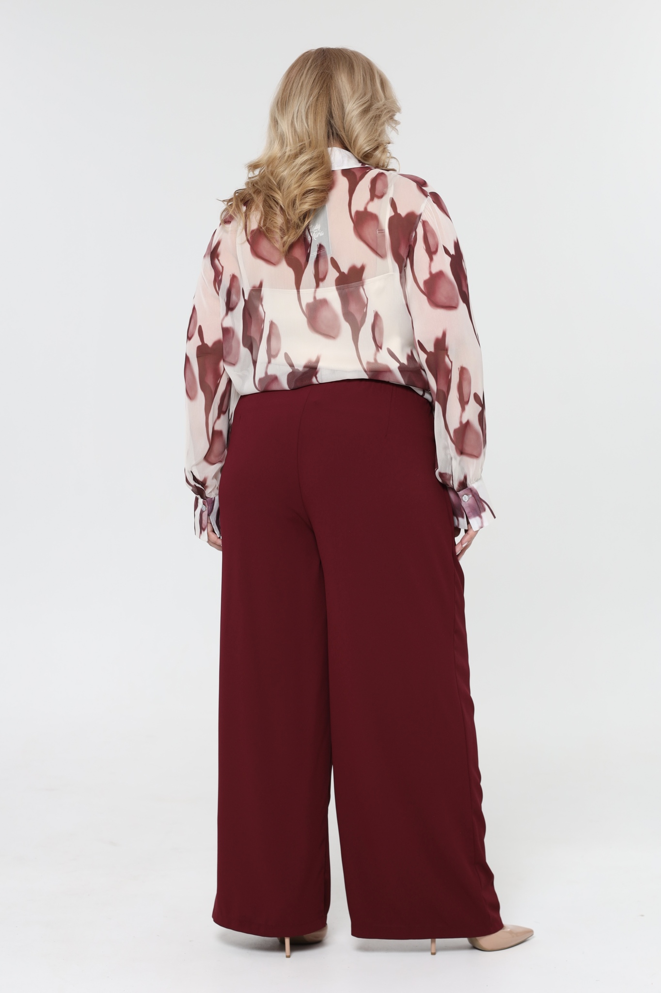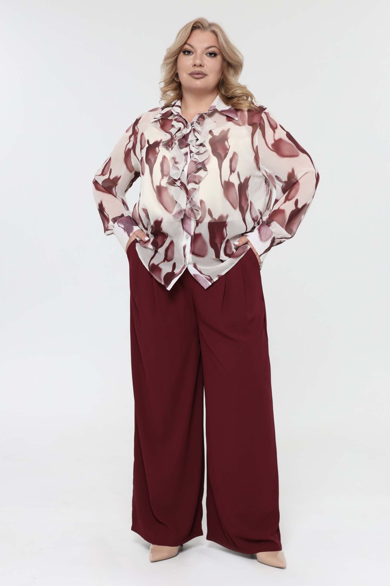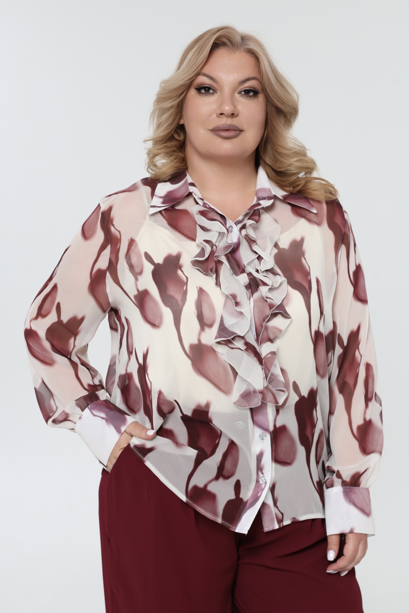 Комплект состоит из рубашки и топа. рубашка прямого кроя выполнена из мягкого шифона. модель привлекает внимание оригинальным дизайном. рубашка застегивается спереди по всей длине на пуговицы под планку. имеет классический отложной воротник и рукава полной длины на широких манжетах по низу. кокетливый волан по планке добавляет модели женственности, а растительный принт - динамичности.