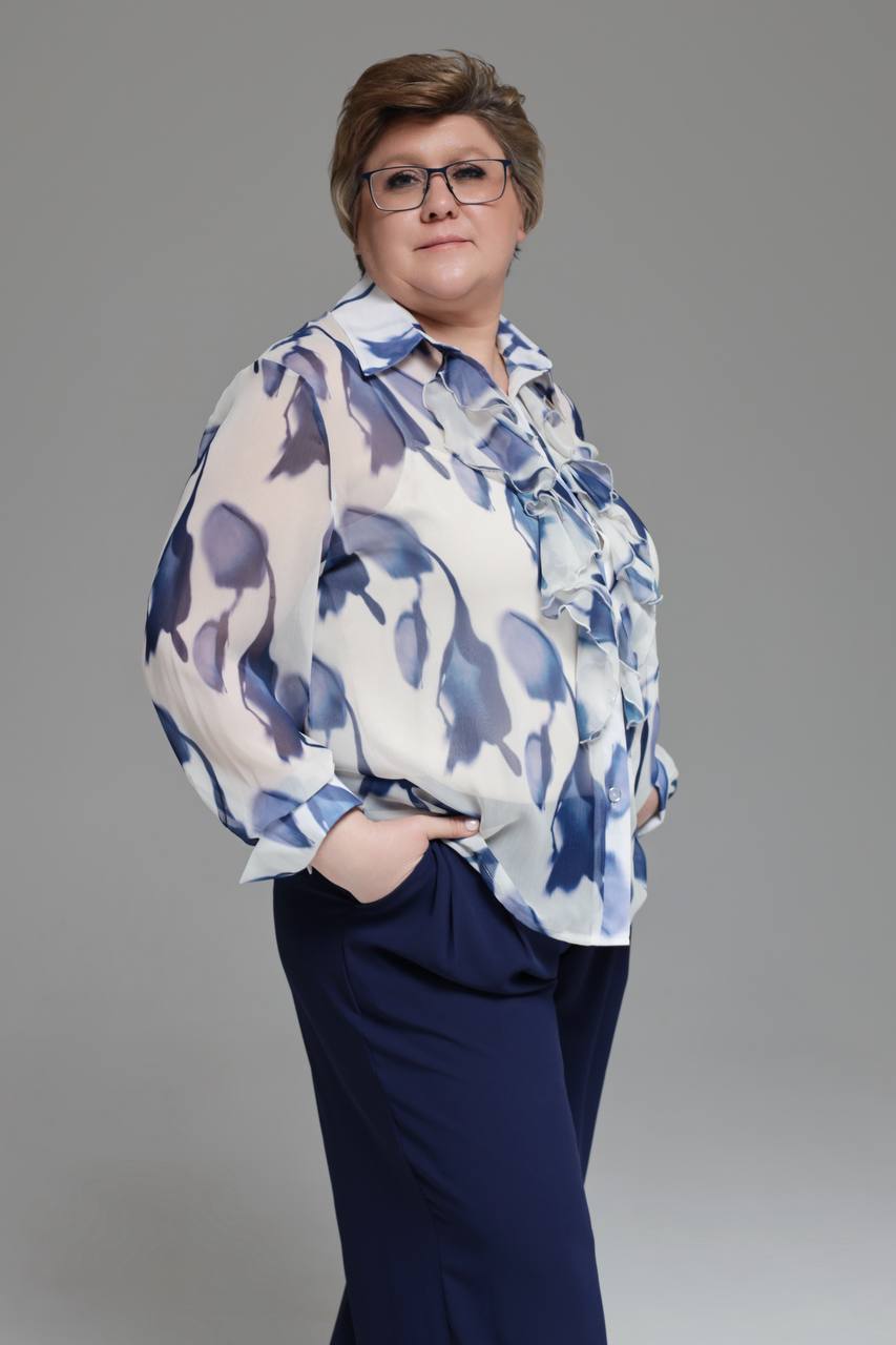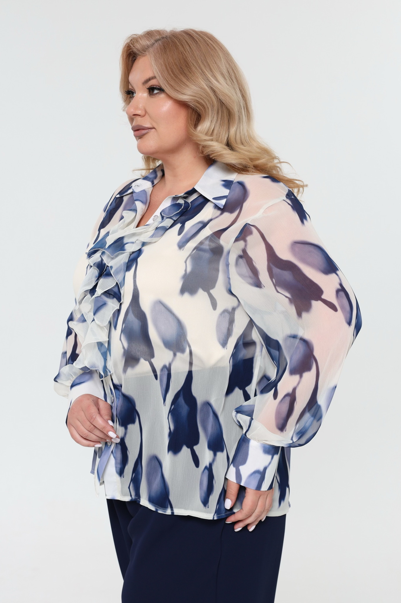 Рубашка шифон "синие тюльпаны" белая