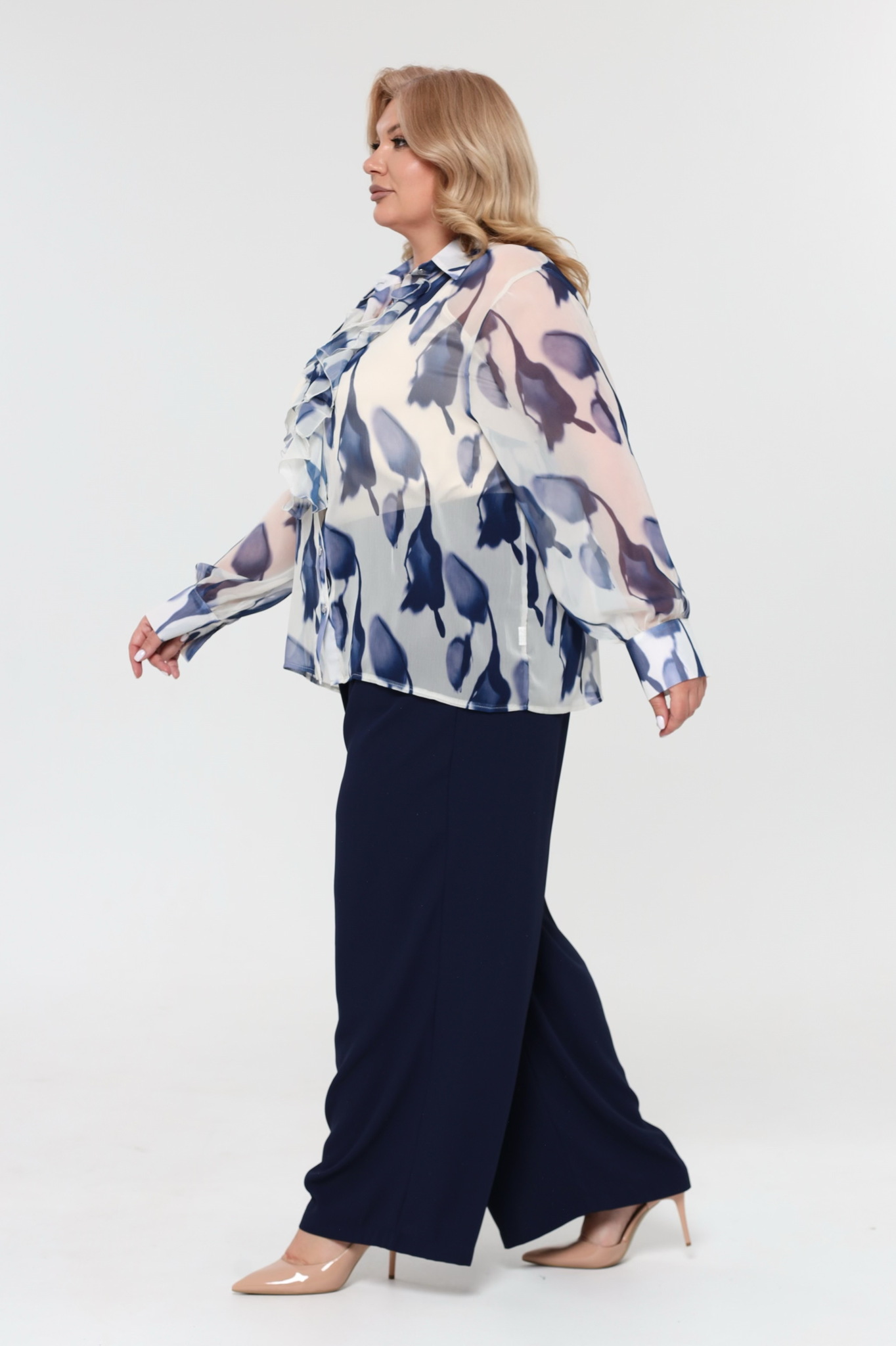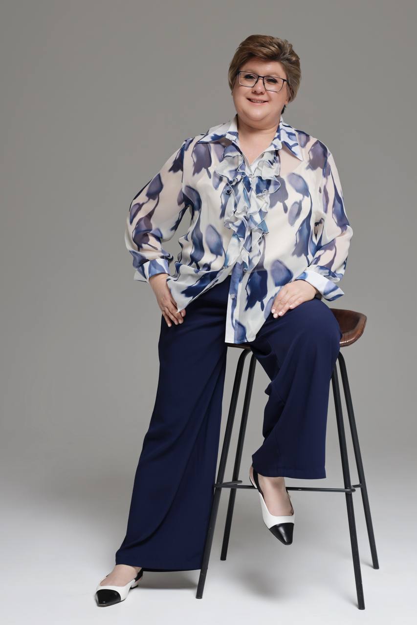 Комплект состоит из рубашки и топа. рубашка прямого кроя выполнена из мягкого шифона. модель привлекает внимание оригинальным дизайном. рубашка застегивается спереди по всей длине на пуговицы под планку. имеет классический отложной воротник и рукава полной длины на широких манжетах по низу. кокетливый волан по планке добавляет модели женственности, а растительный принт - динамичности.