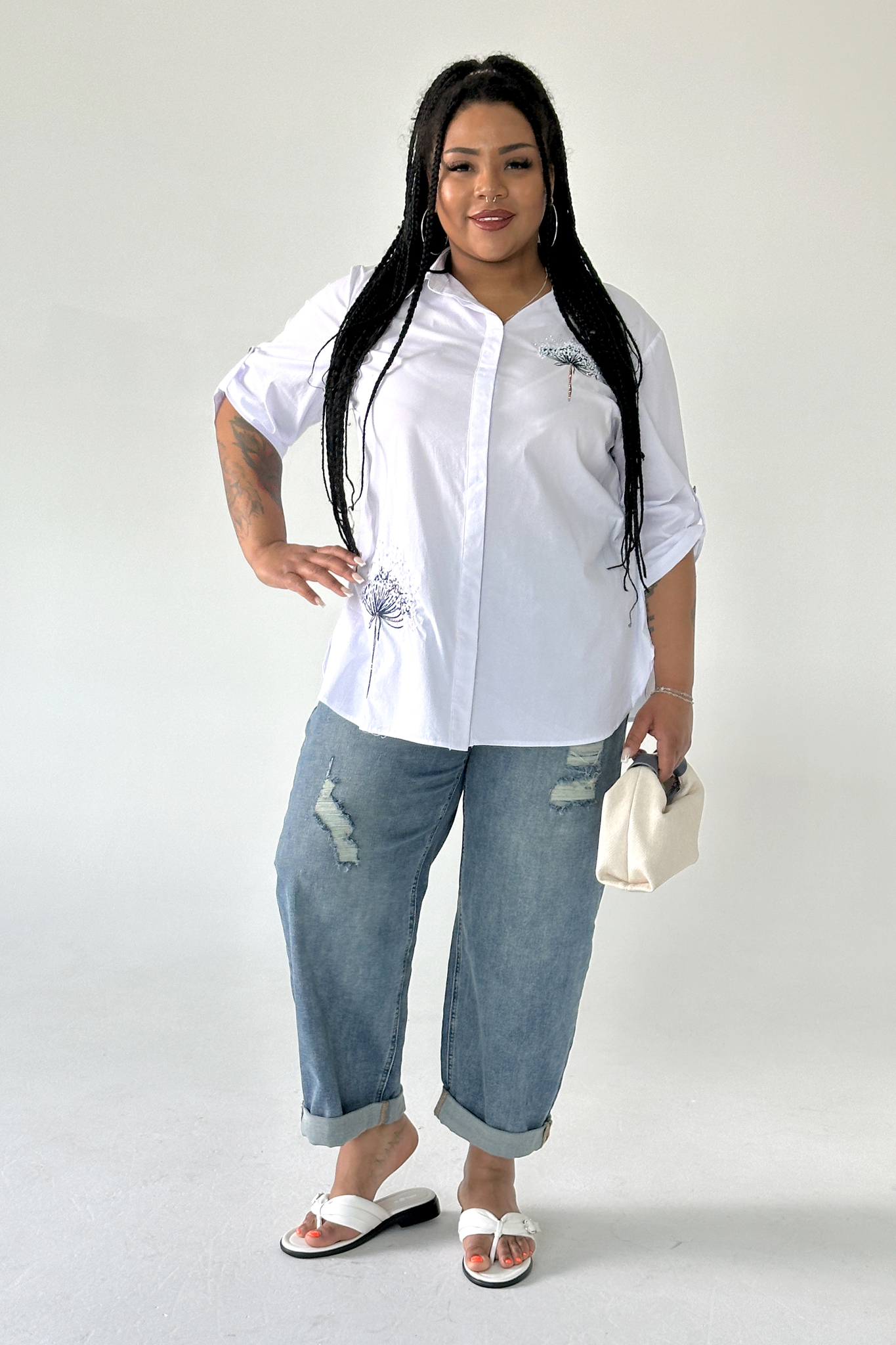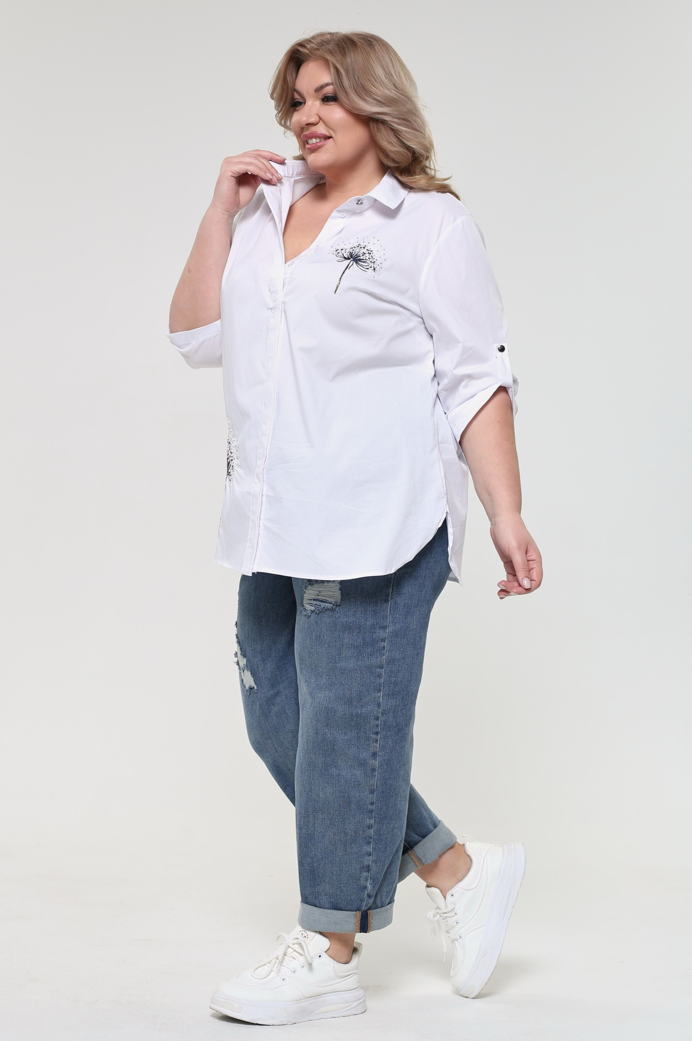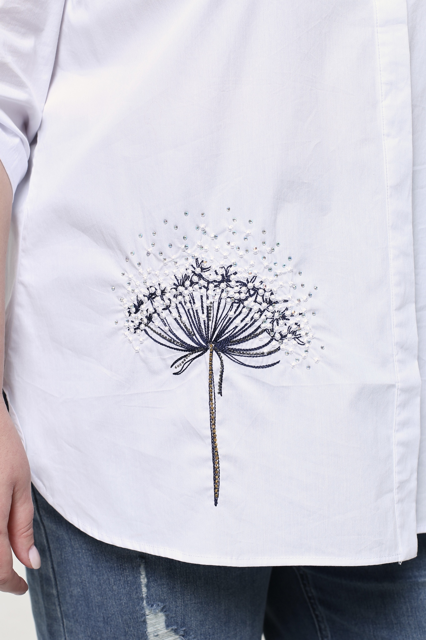 Оригинальная удлиненная рубашка свободного кроя идеальный вариант для женщин, ценящих простоту и элегантность. модель имеет классический отложной воротник. застегивается спереди на скрытые пуговицы под планку. рукава длиной 3/4 можно красиво присобраны патами. нарядности придает модная вышивка по переду. вытачки на груди и удлиненная спинка способствуют оптимальной посадке по фигуре. полуприлегающий силуэт не сковывает движений и искусно обыгрывает фигуру, маскируя мелкие недостатки. рубашку можно комбинировать как с брюками, так и с легинсами.