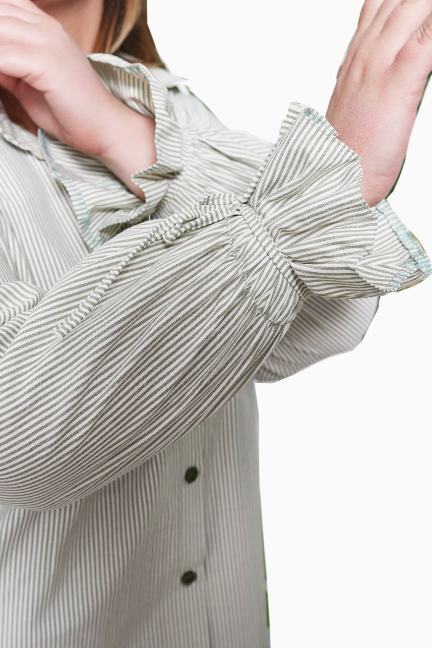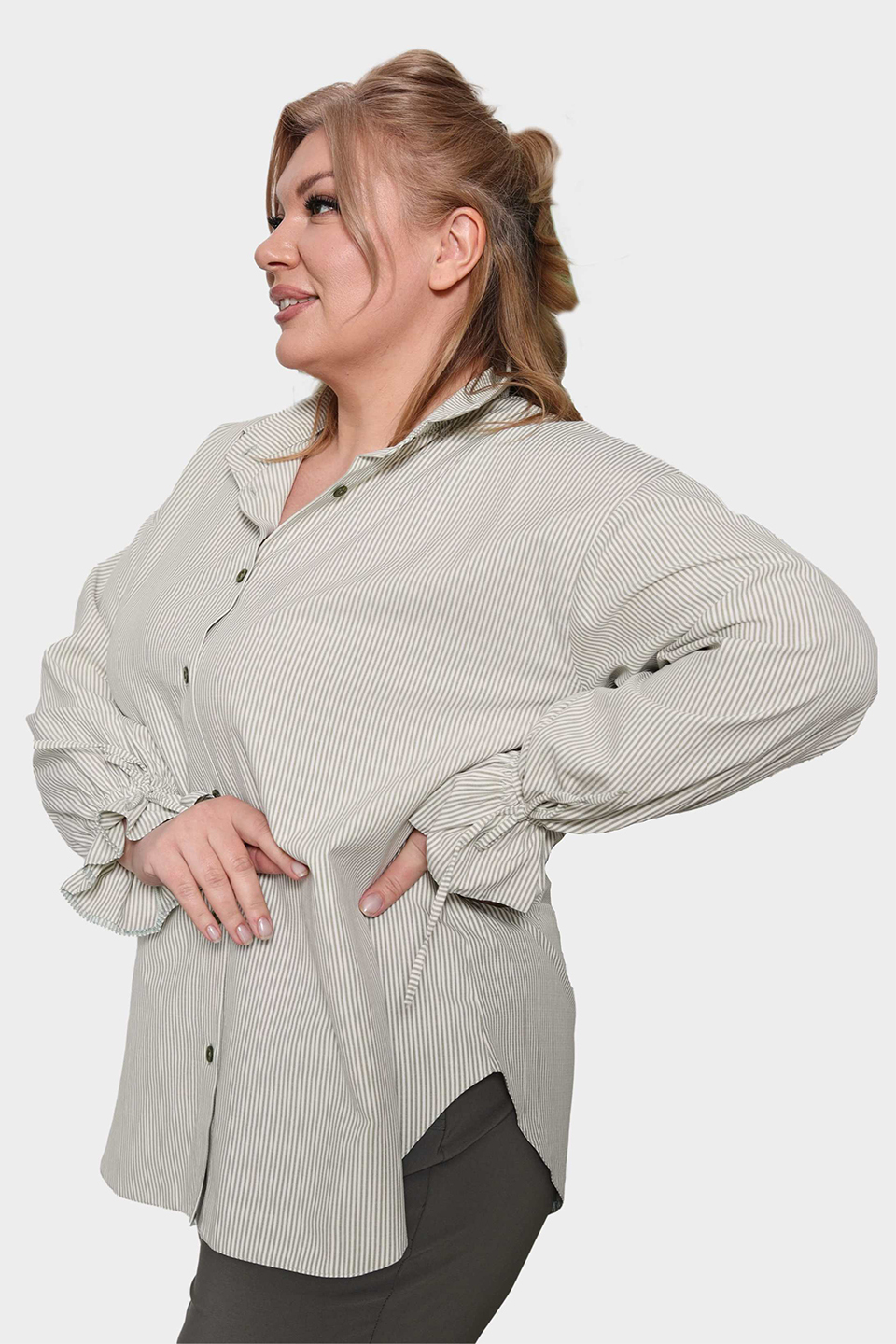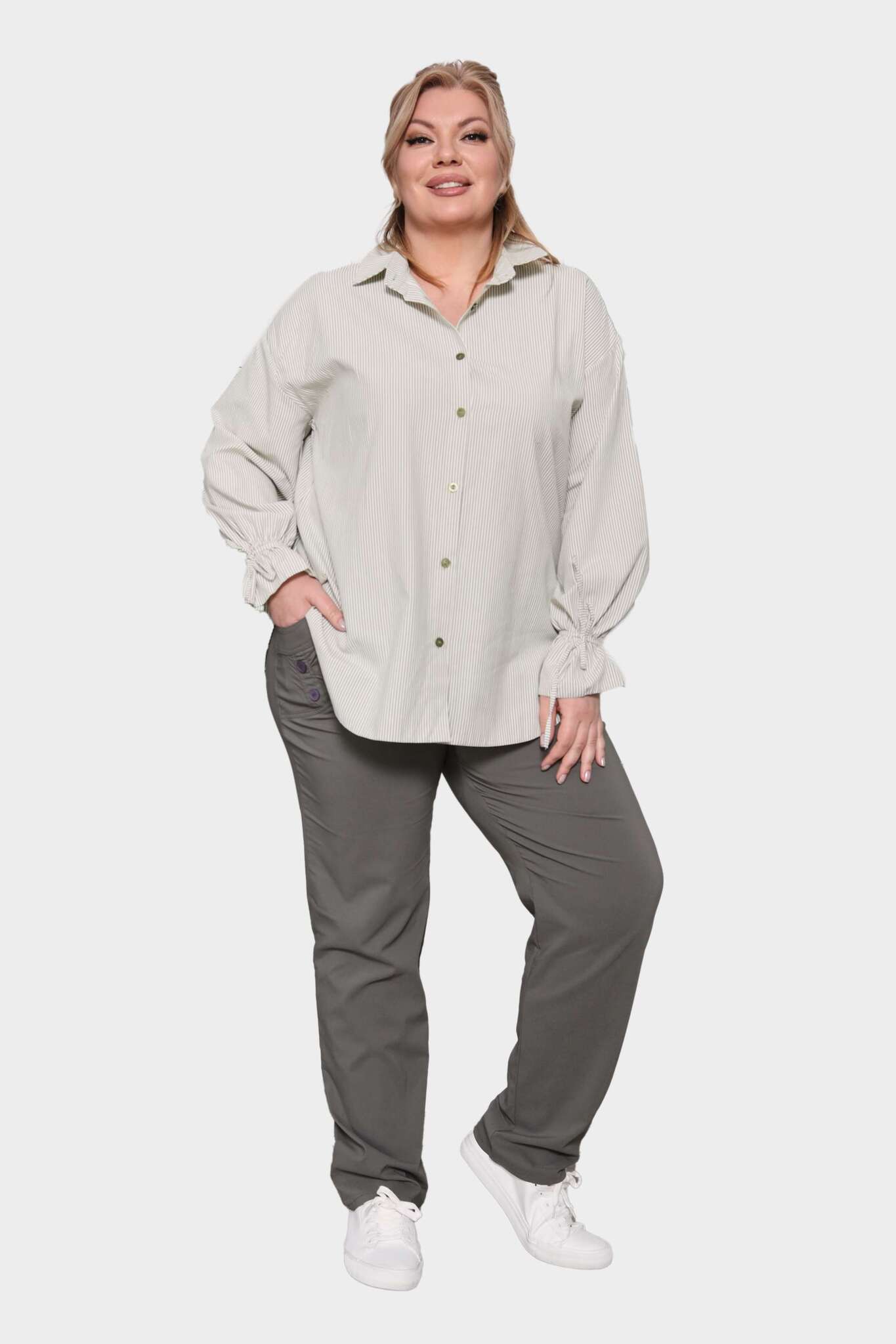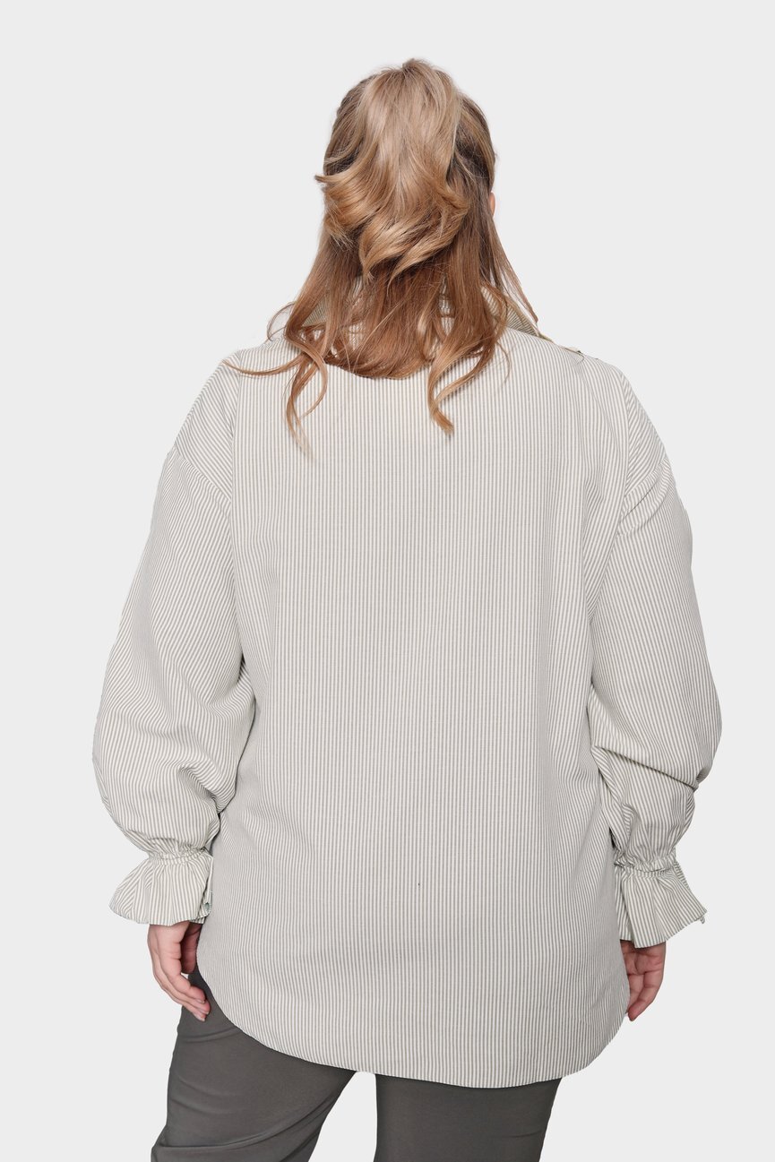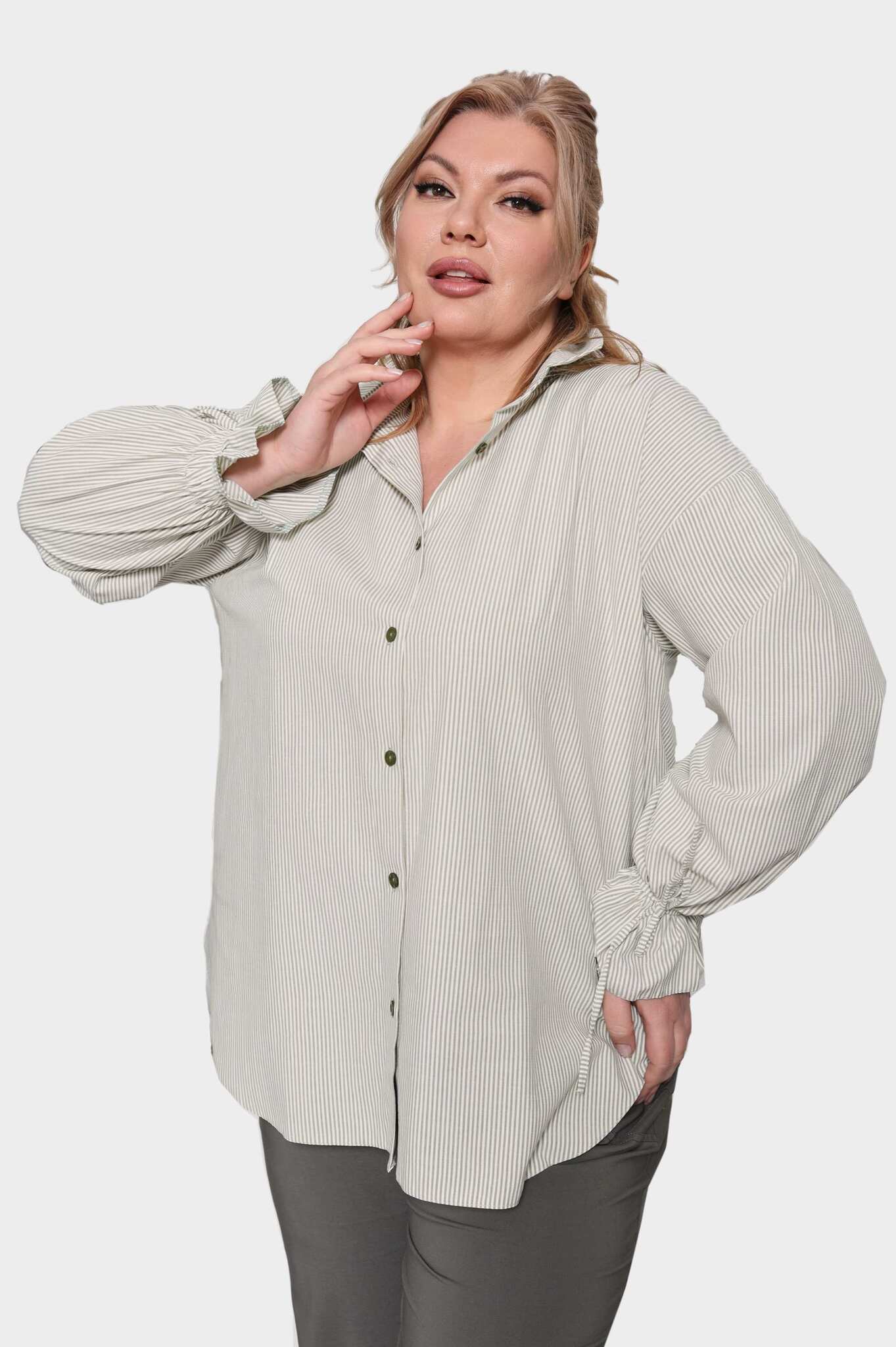 Оригинальная рубашка прямого кроя из мягкого материала. круглый вырез дополнен классическим отложным воротником. рукава полной длины с приспущенной проймой по низу присобраны на тонкие резиночки и дополнены оригинальными завязками, которыми можно регулировать объем манжеты. модель застёгивается на оригинальные пуговки под планку. актуальный полосатый принт добавляет динамичности. удлиненная спинка и закругленные бока не сковывают движений и искусно обыгрывают фигуру, маскируя мелкие недостатки. рубашка отлично сочетается как с брюками, так и с легинсами.
