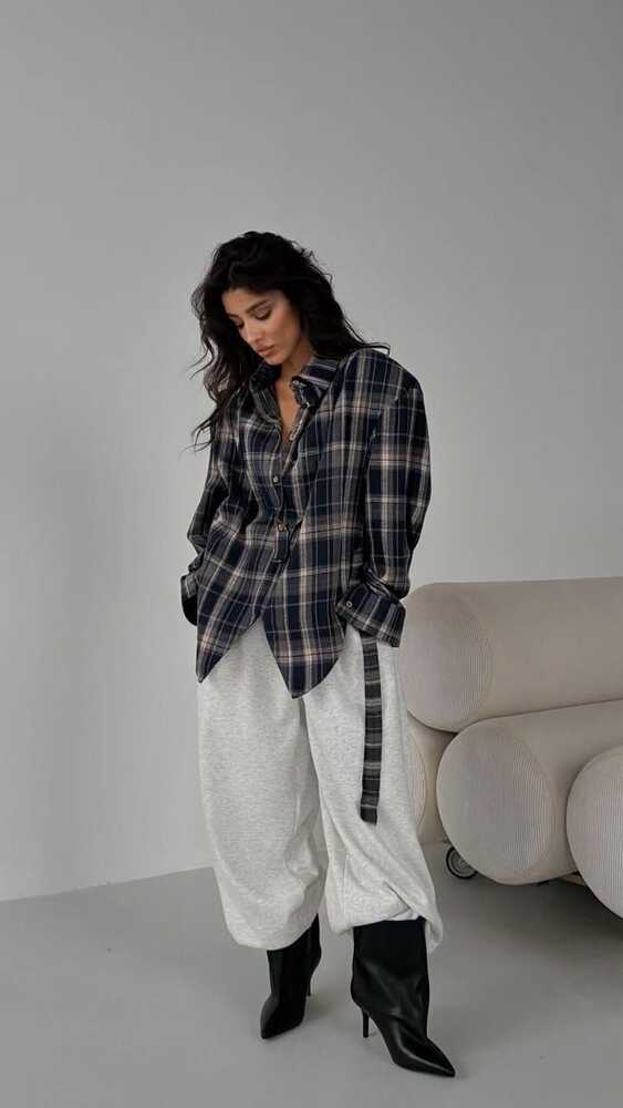 Рубашка в крупную клетку с подплечниками и удлинённым кроем.