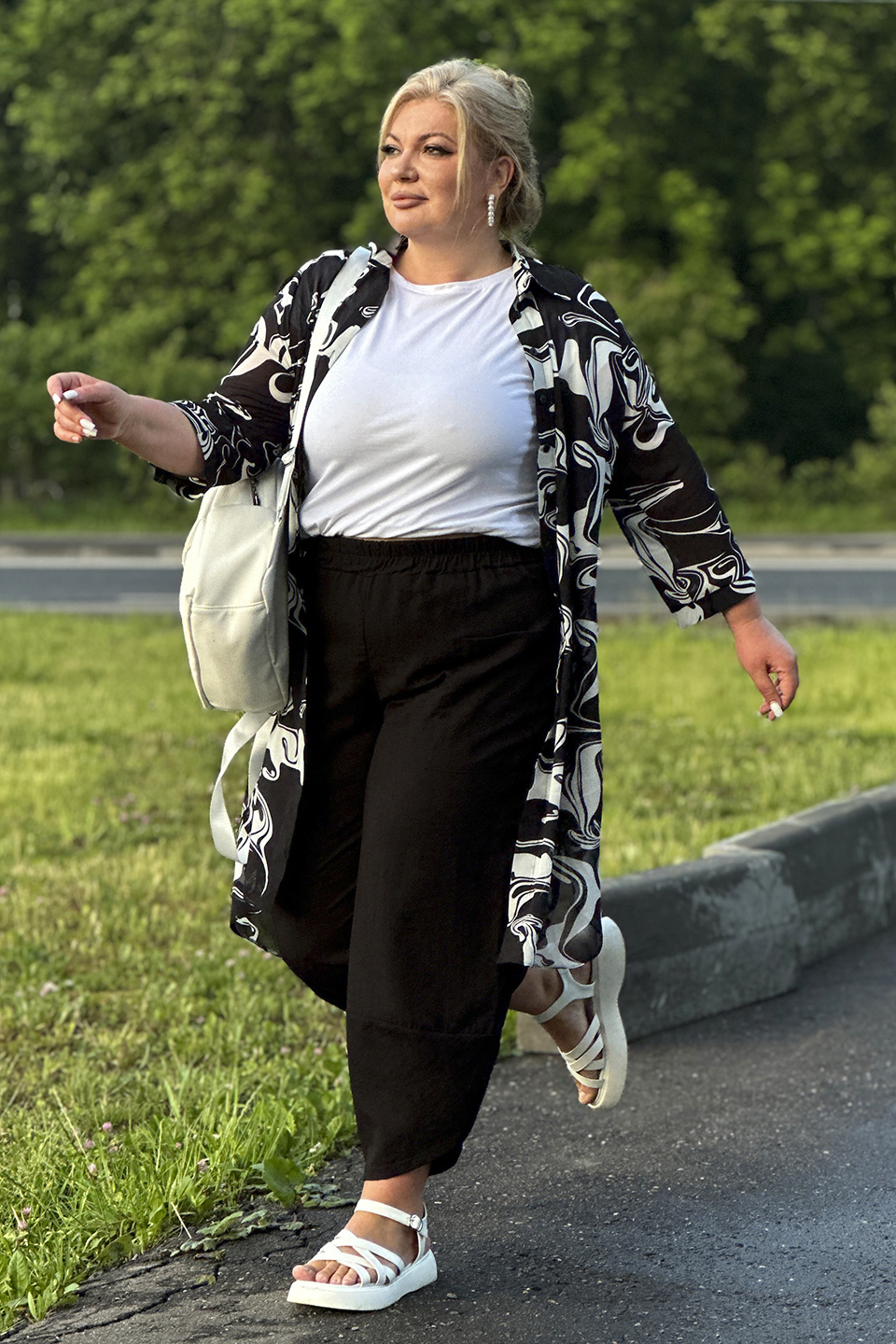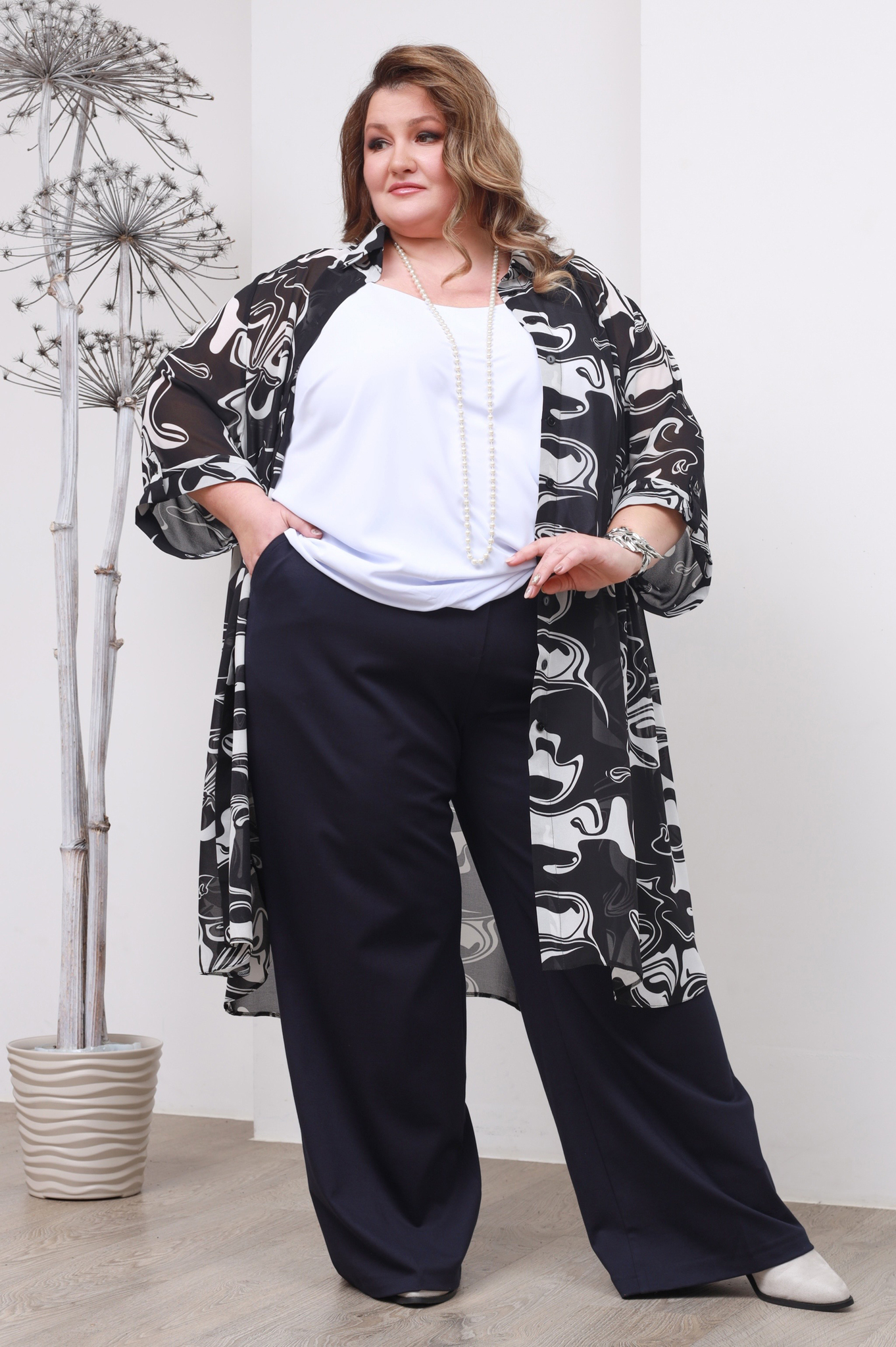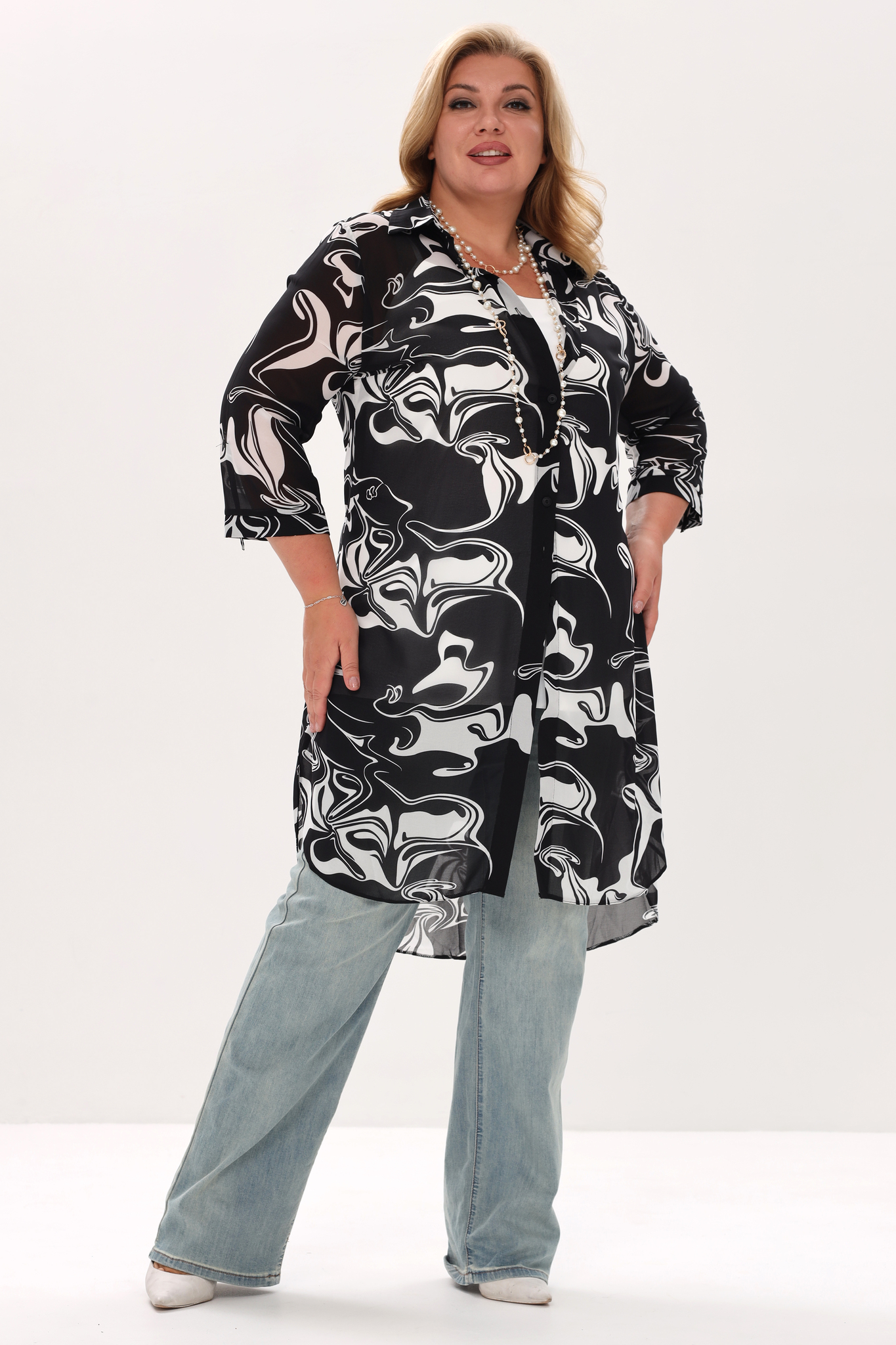 Удлиненная рубашка прямого кроя из мягкого шифона - идеальный вариант для женщин, ценящих простоту и элегантность. модель привлекает внимание оригинальным дизайном. рубашка застегивается спереди по всей длине на пуговицы под планку. имеет классический отложной воротник и рукава длиной, которые при желании можно присобрать хлястиком. актуальный прин добавляет модели динамичности. удлиненная спинка и небольшие разрезы по бокам способствуют оптимальной посадке по фигуре. мягкий, приятный телу материал подарит комфорт на весь день. рубашку можно носить летом как кардиган и комбинировать с любым низом.