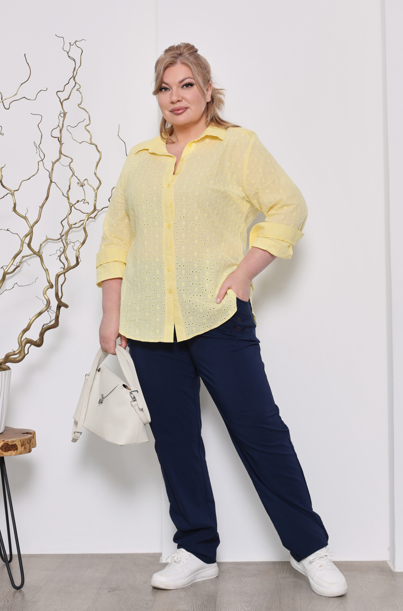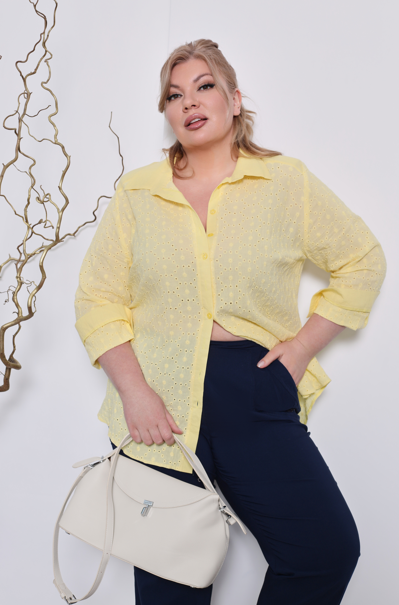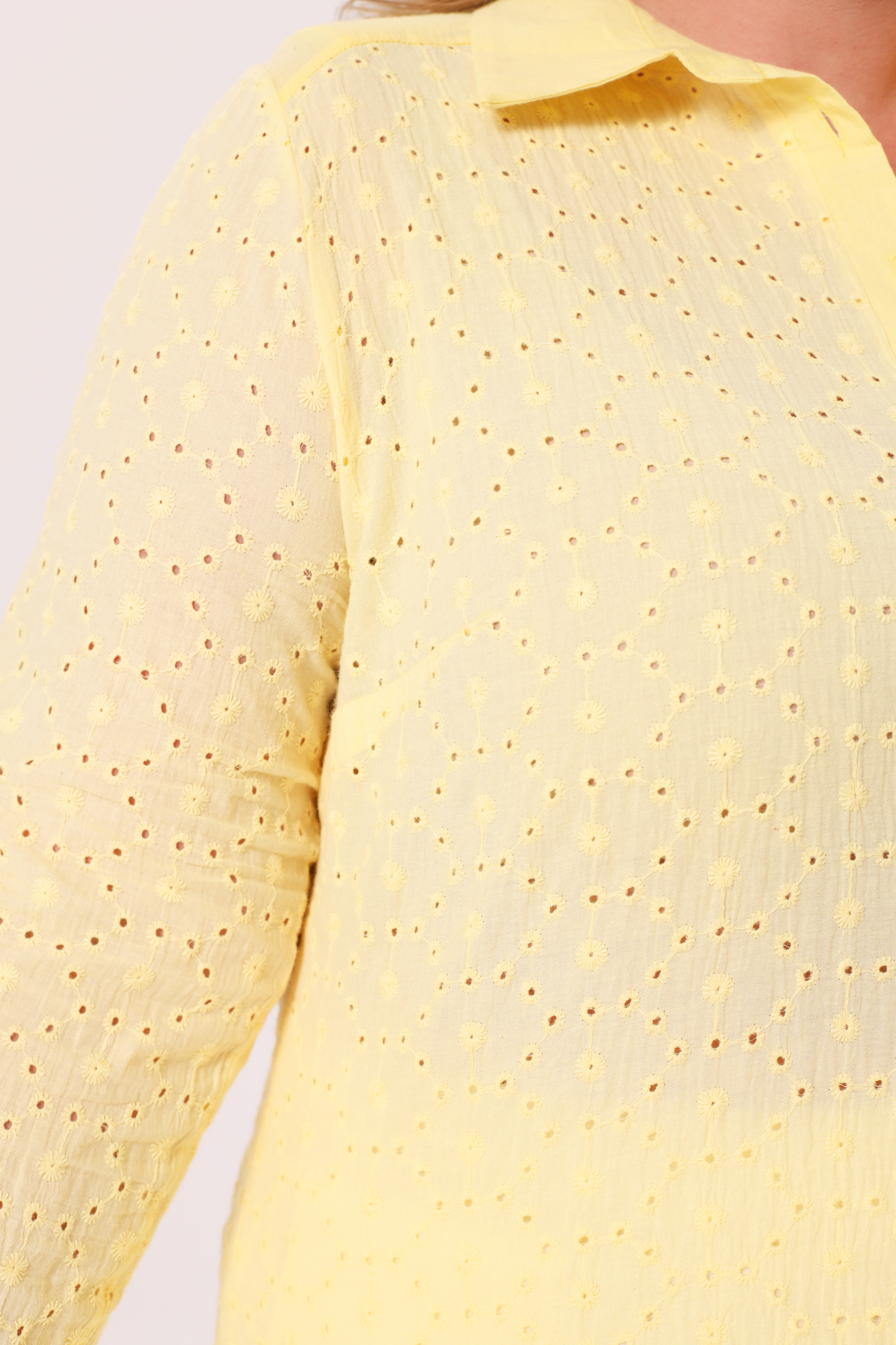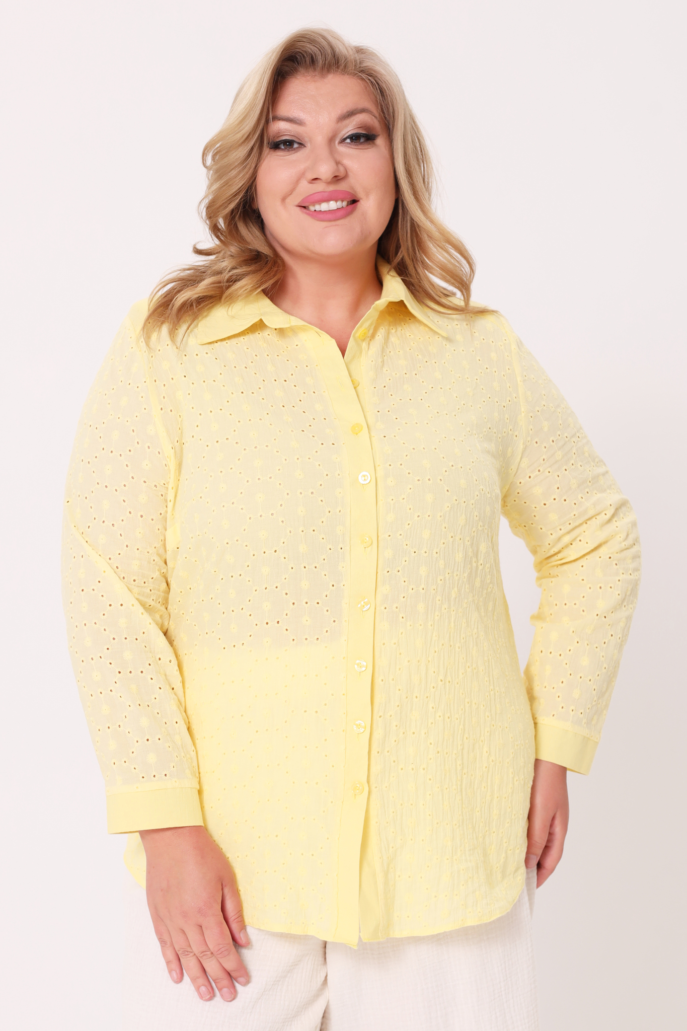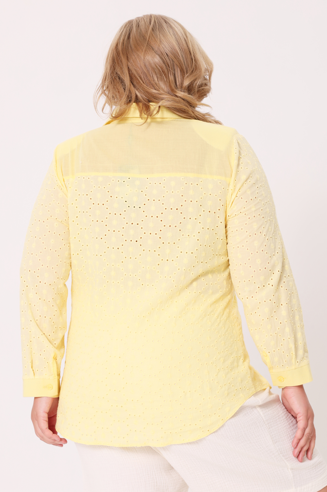 Оригинальная удлиненная рубашка свободного кроя идеальный вариант для девушек, ценящих простоту и элегантность. круглый вырез дополнен классическим отложным воротником. модель застёгивается спереди под планку на небольшие пуговицы. рукава полной длины по низу застёгиваются на изящные пуговки. кокетка по спинке способствует оптимальной посадке по фигуре, а небольшие подплечники зрительно вытягивают силуэт. закругленный нижний край по бокам не сковывает движений и искусно обыгрывает фигуру, маскируя мелкие недостатки. нежная вышивка с перфорацией добавляет модели динамичности и женственности. рубашка отлично сочетается как с брюками, так и с легинсами.