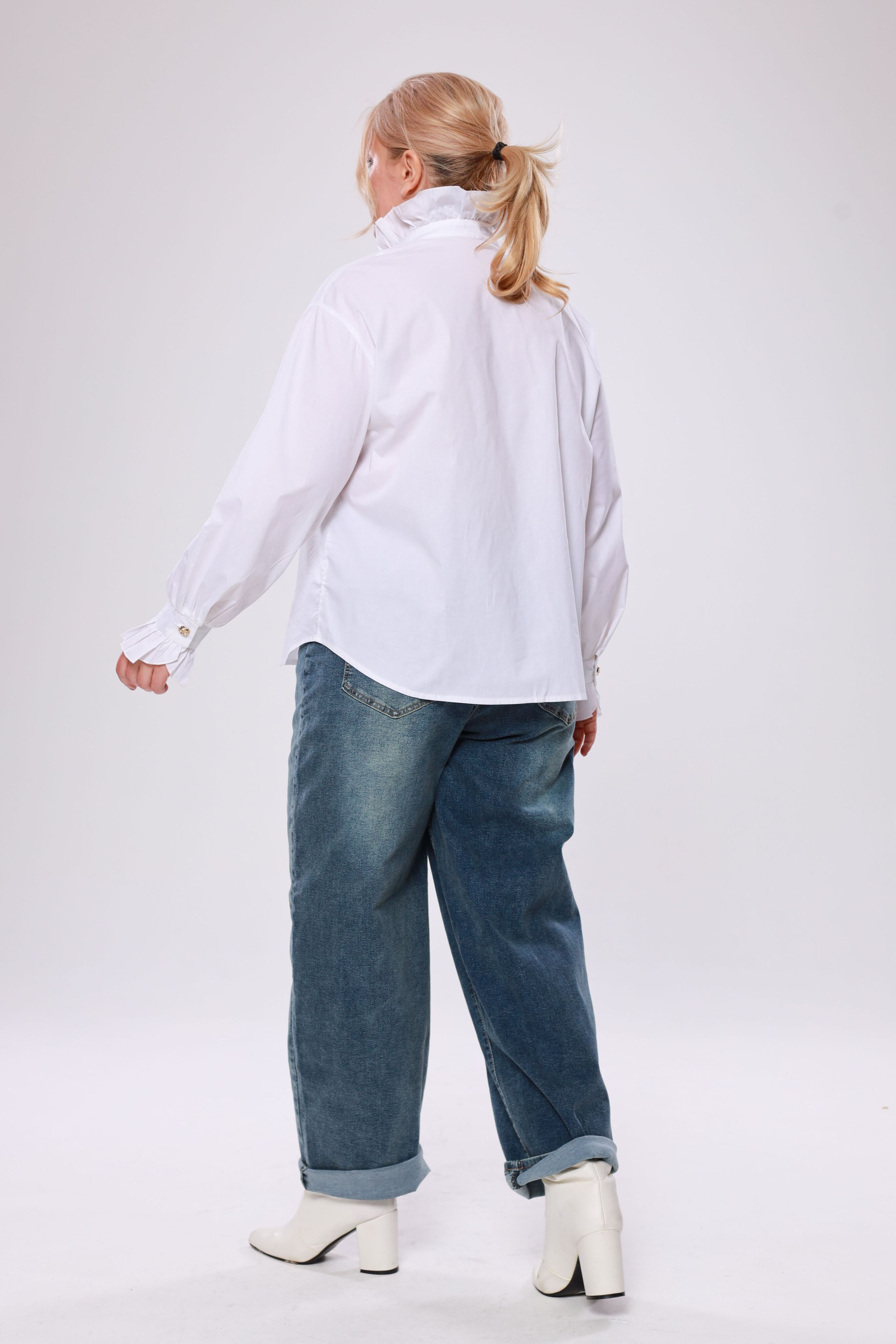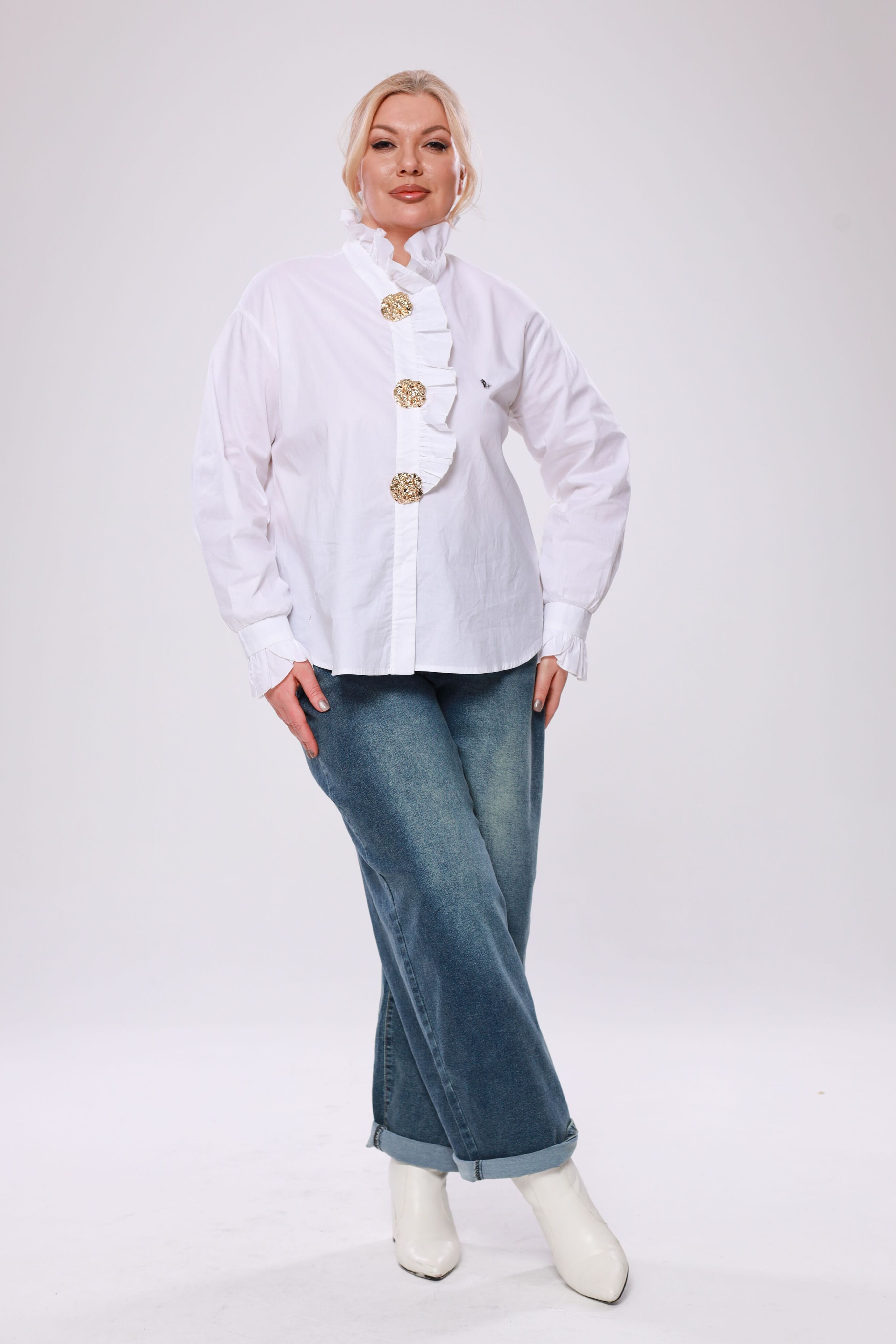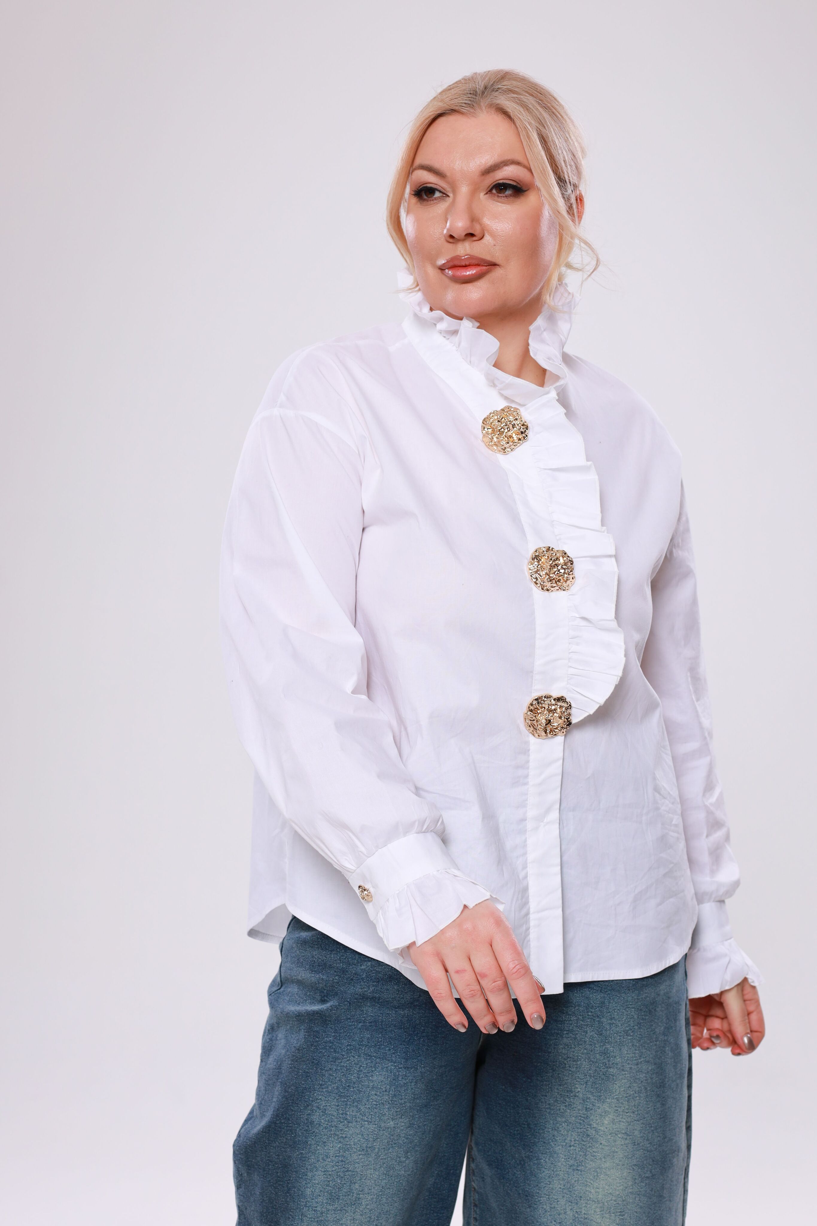 Оригинальная удлиненная рубашка прямого кроя из мягкого материала. круглый вырез кокетливым воротом - стойкой. рюши по краям и на рукавах добавляют женственности. рукава полной длины с приспущенной проймой по низу оформлены манжетами с пуговками. модель застёгивается на элегантные пуговицы под планку. закругленный нижний край по бокам не сковывает движений и искусно обыгрывает фигуру, маскируя мелкие недостатки. рубашка отлично сочетается как с брюками, так и с леггинсами.