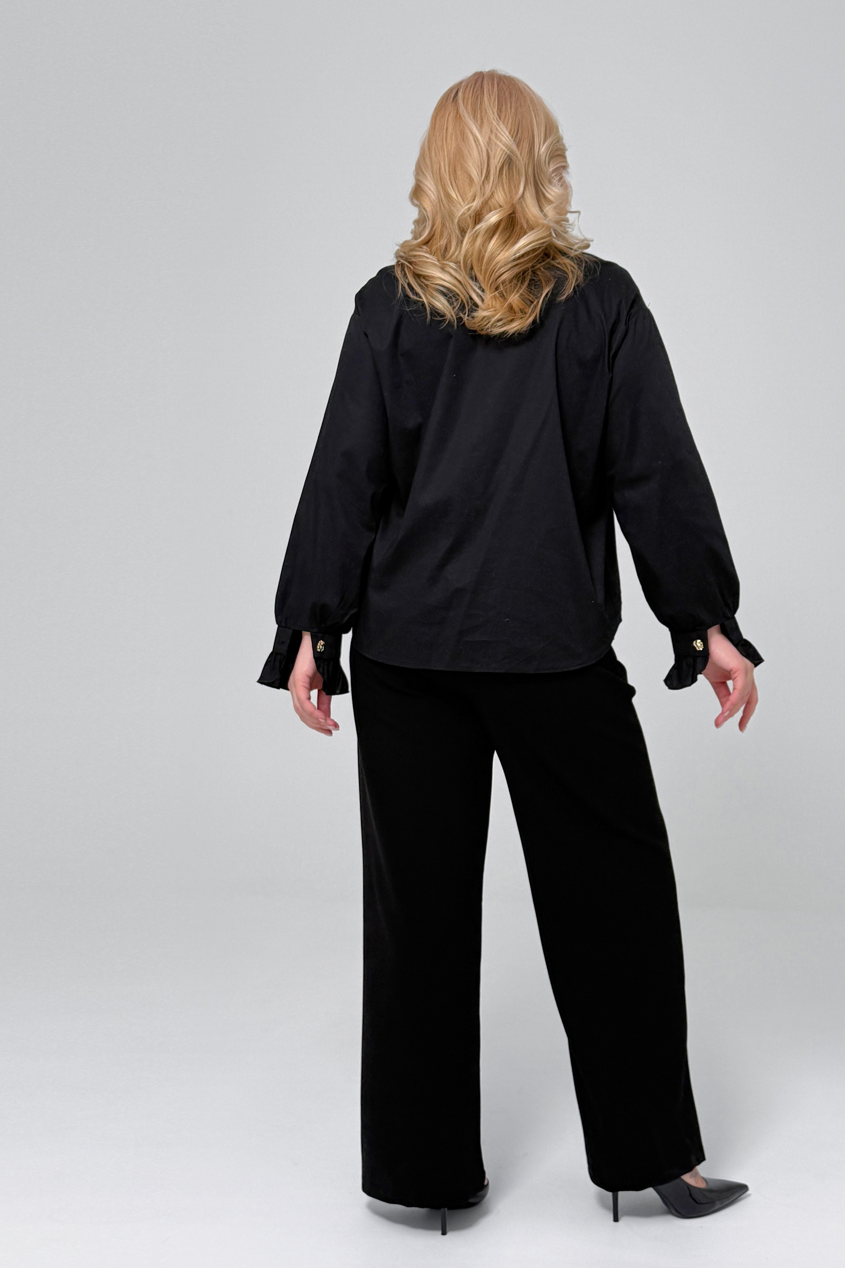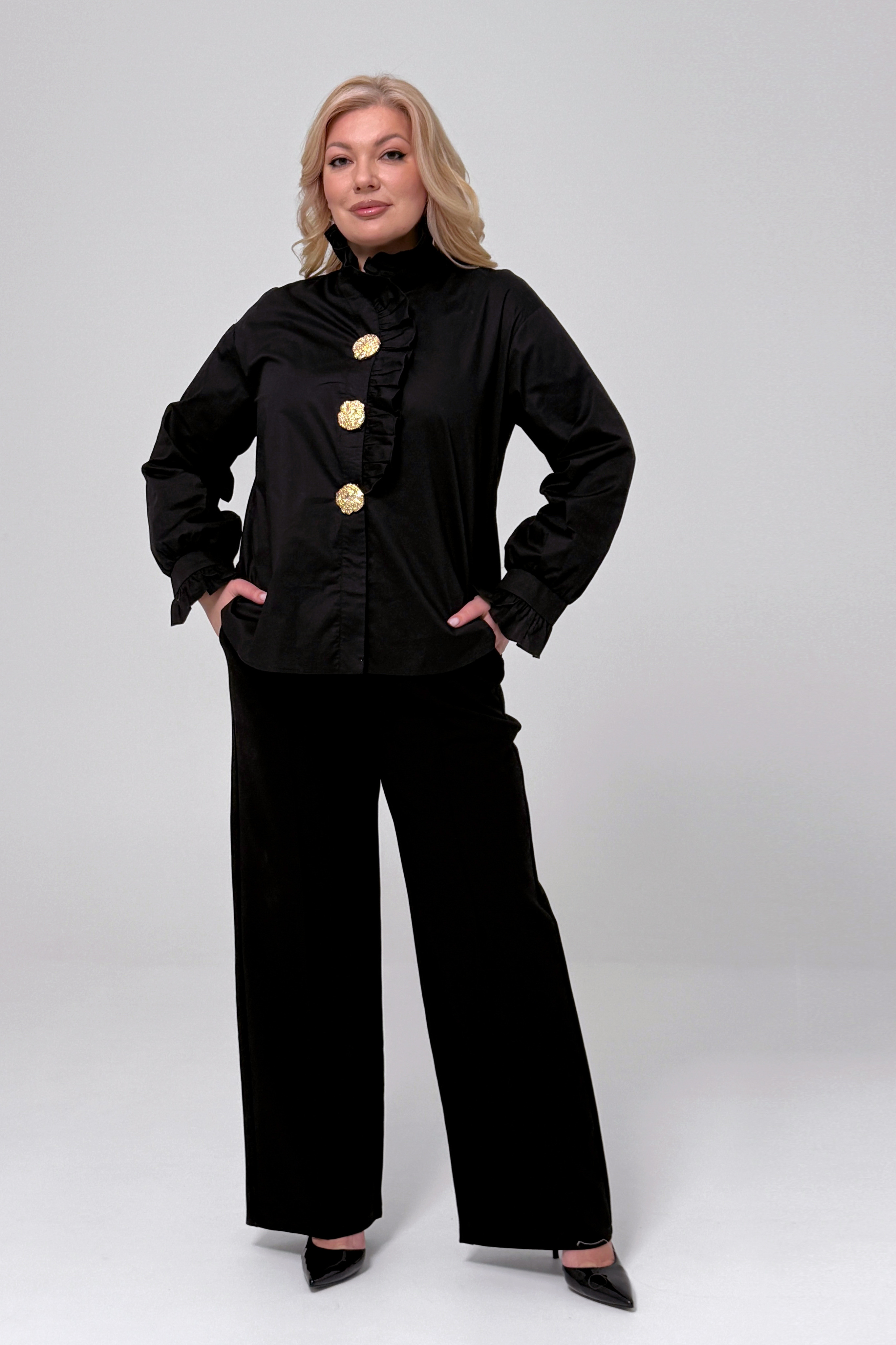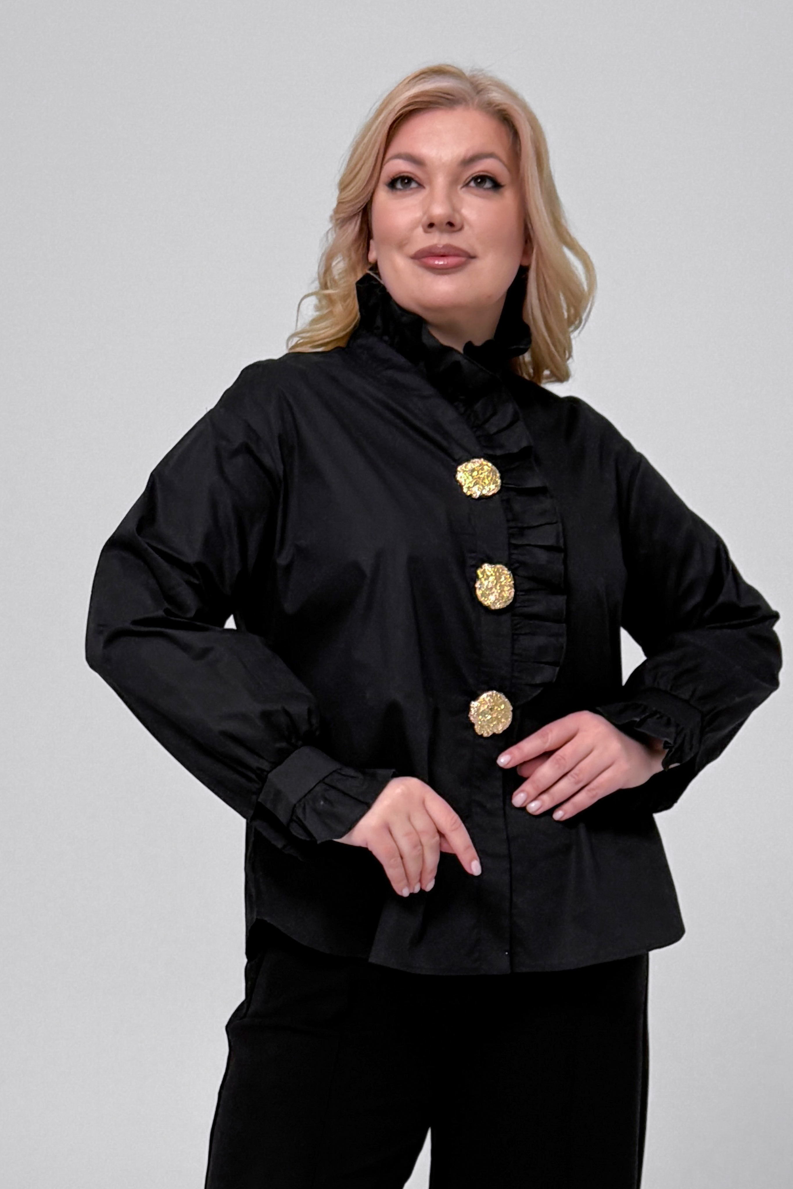 Оригинальная удлиненная рубашка прямого кроя из мягкого материала. круглый вырез кокетливым воротом - стойкой. рюши по краям и на рукавах добавляют женственности. рукава полной длины с приспущенной проймой по низу оформлены манжетами с пуговками. модель застёгивается на элегантные пуговицы под планку. закругленный нижний край по бокам не сковывает движений и искусно обыгрывает фигуру, маскируя мелкие недостатки. рубашка отлично сочетается как с брюками, так и с леггинсами.