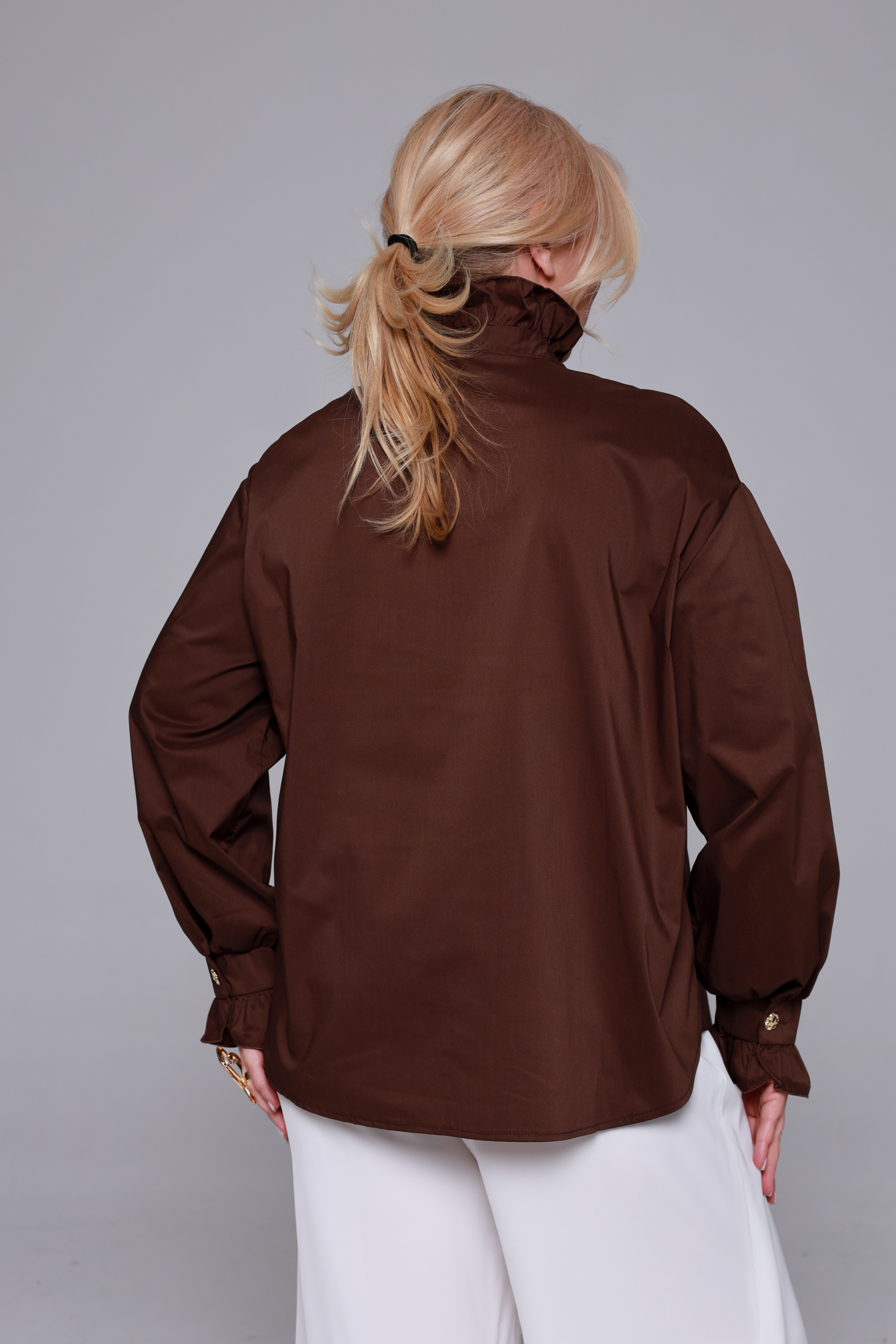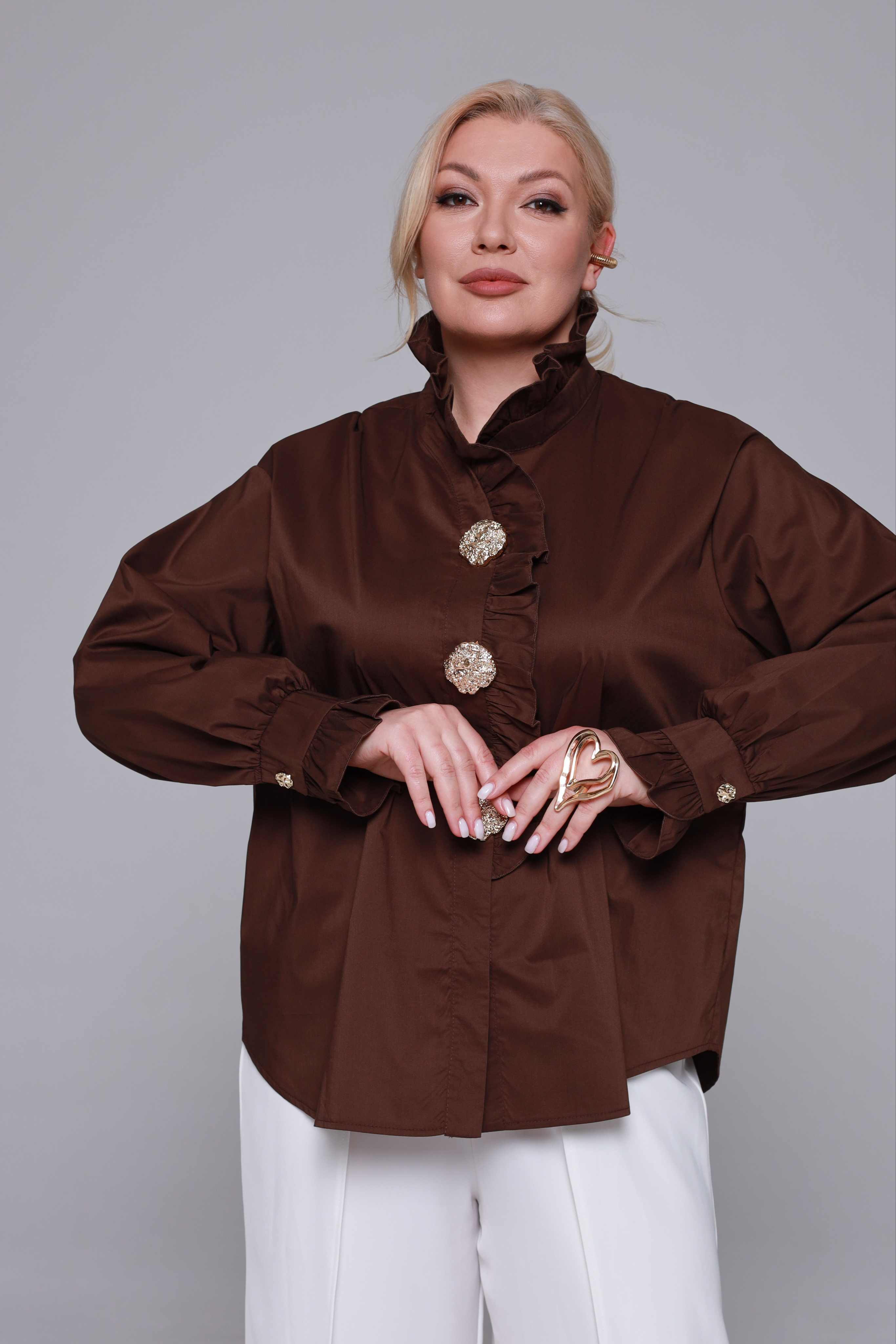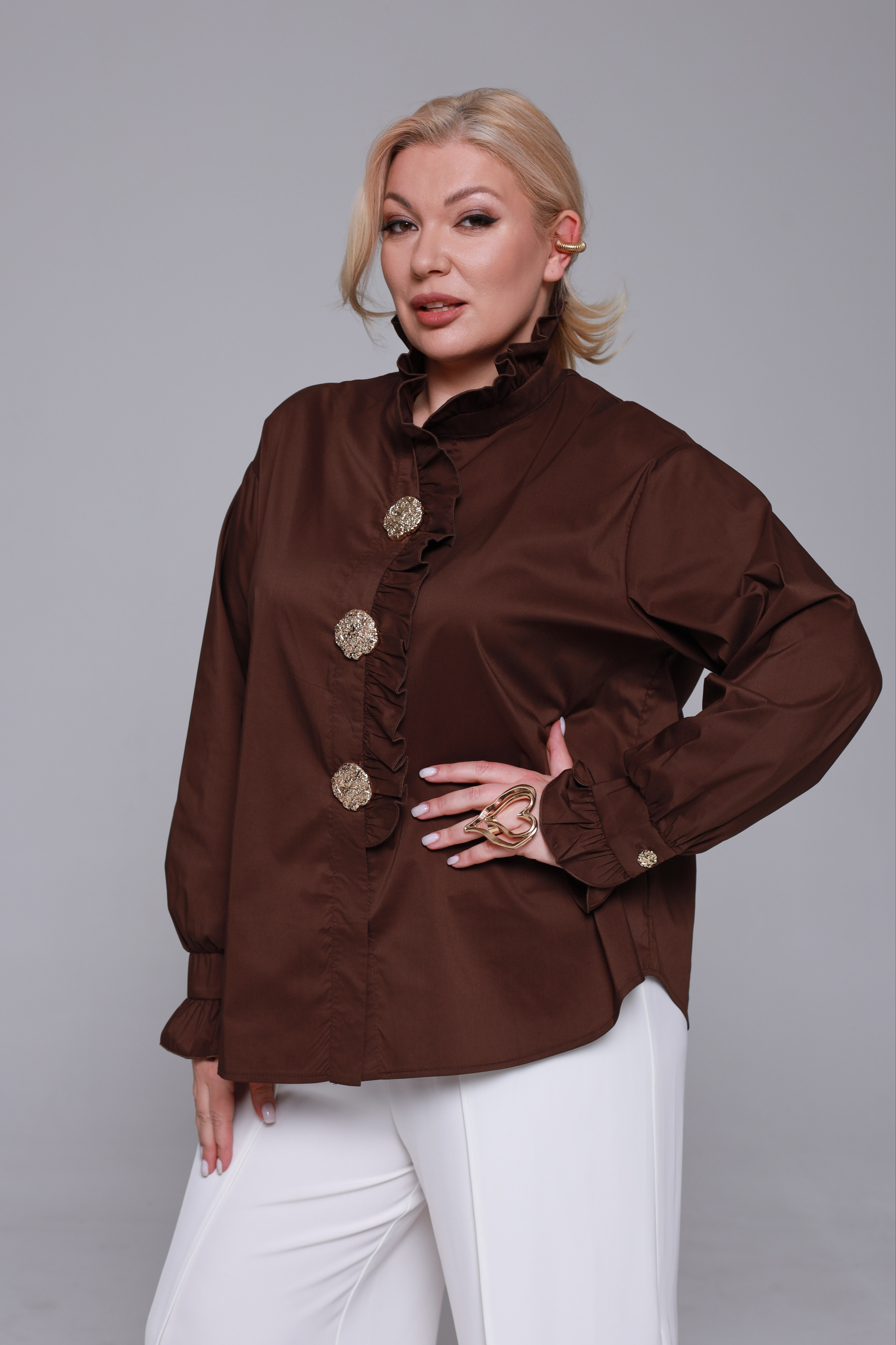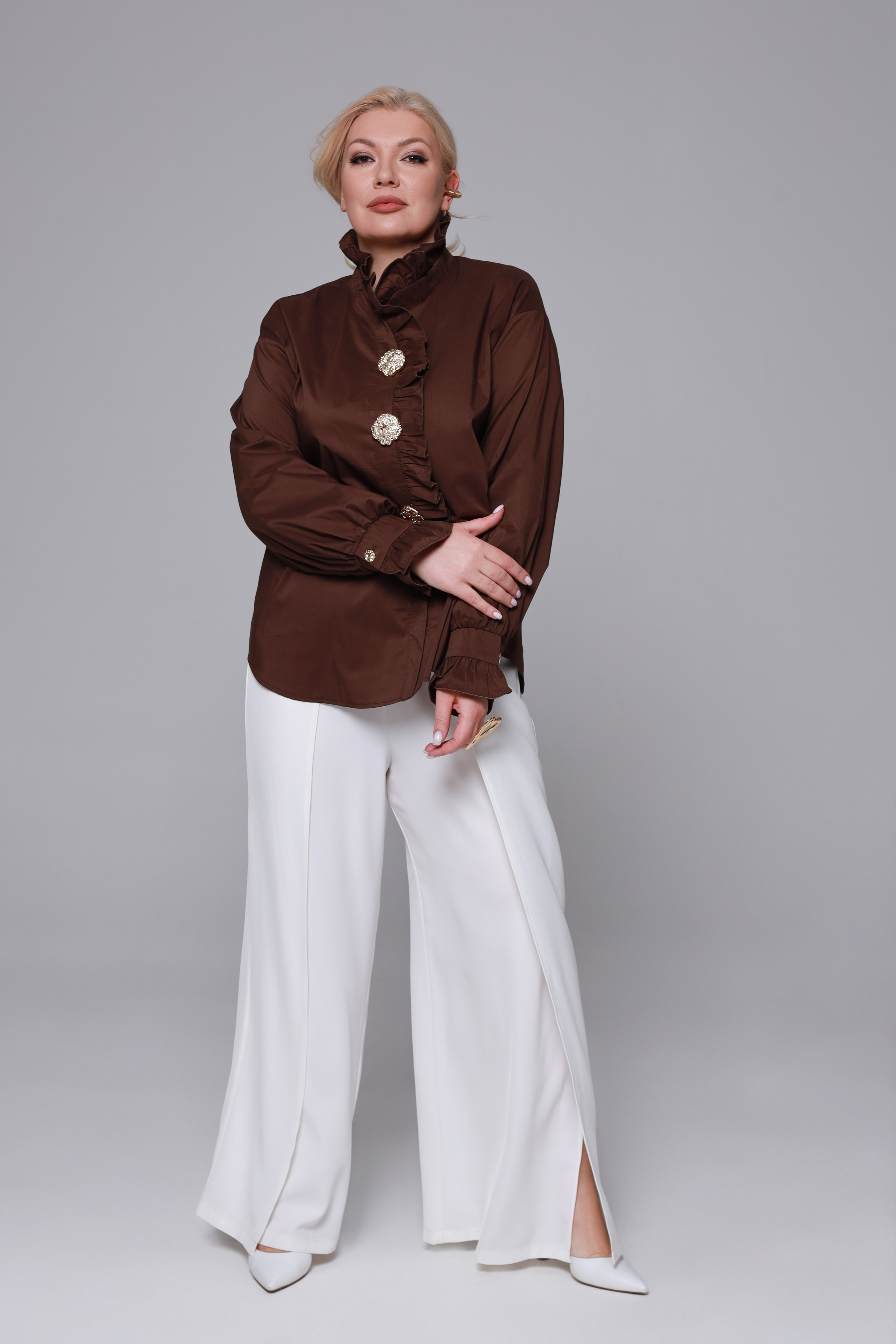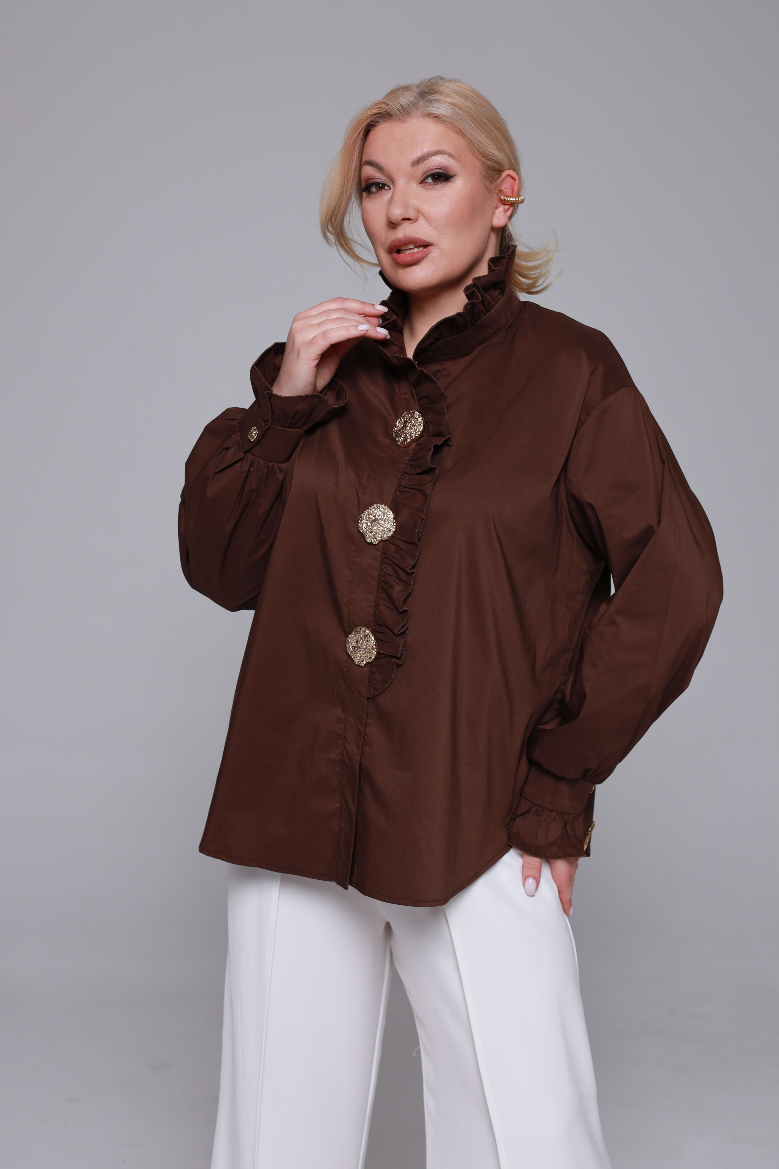 Оригинальная удлиненная рубашка прямого кроя из мягкого материала. круглый вырез кокетливым воротом - стойкой. рюши по краям и на рукавах добавляют женственности. рукава полной длины с приспущенной проймой по низу оформлены манжетами с пуговками. модель застёгивается на элегантные пуговицы под планку. закругленный нижний край по бокам не сковывает движений и искусно обыгрывает фигуру, маскируя мелкие недостатки. рубашка отлично сочетается как с брюками, так и с леггинсами.