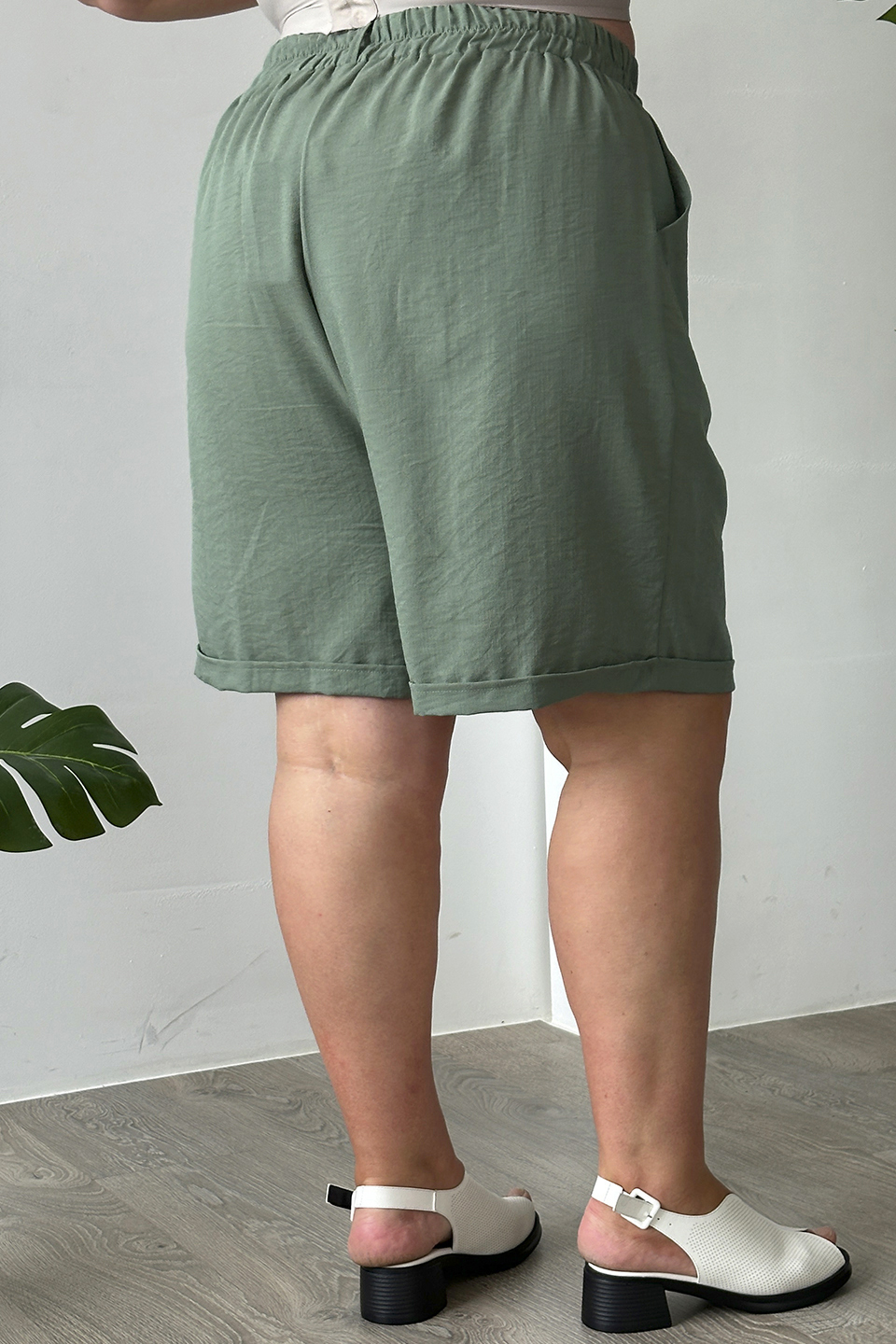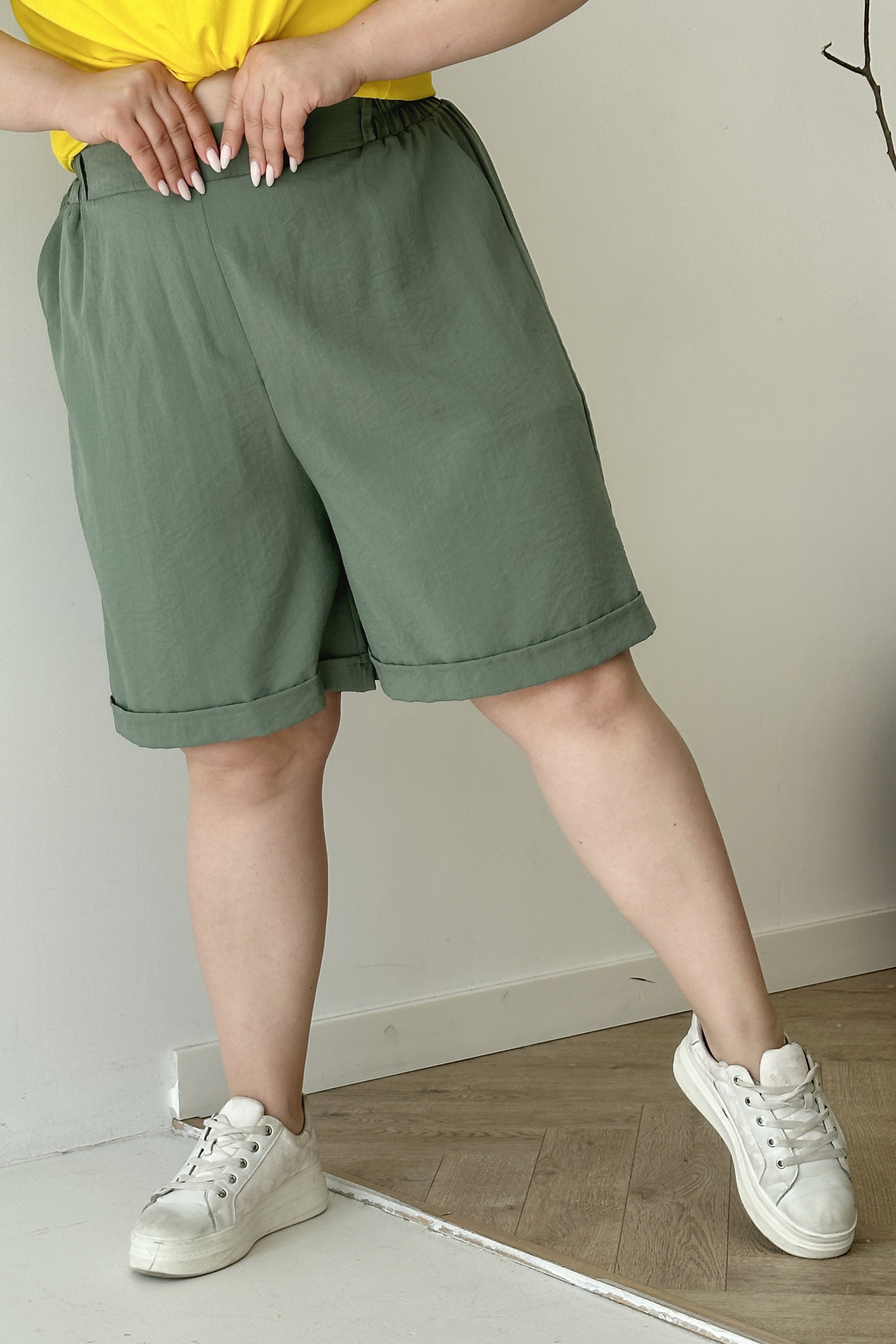 Шорты мокрый шелк с отворотом хаки