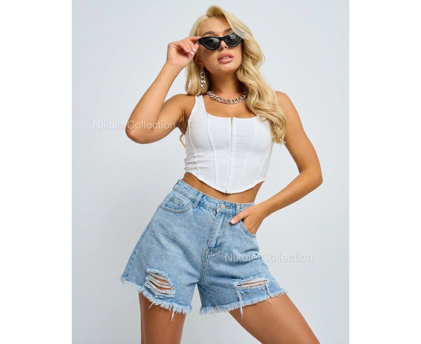 шорты классические с высокой посадкой Материал — плотный стрейч джинс