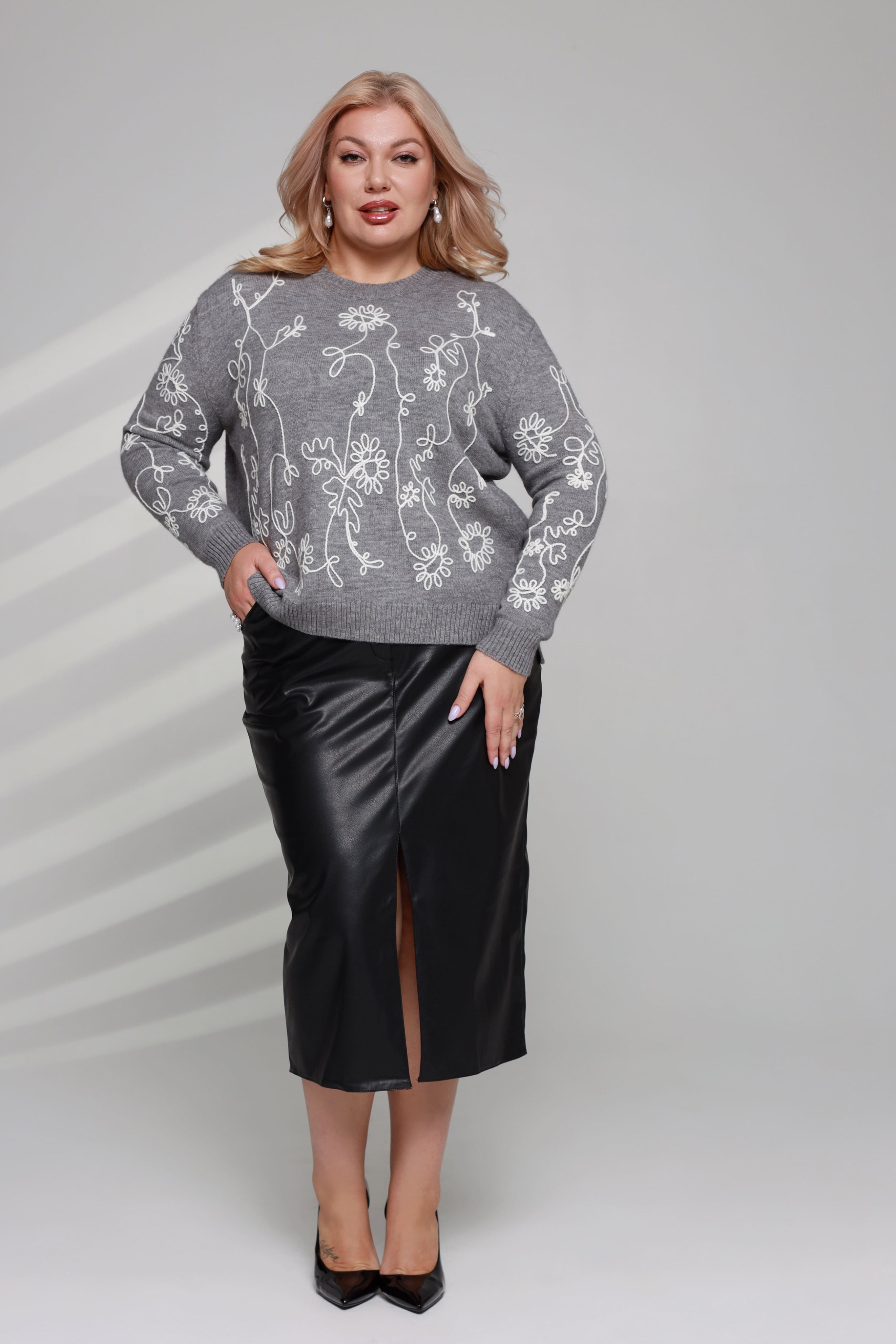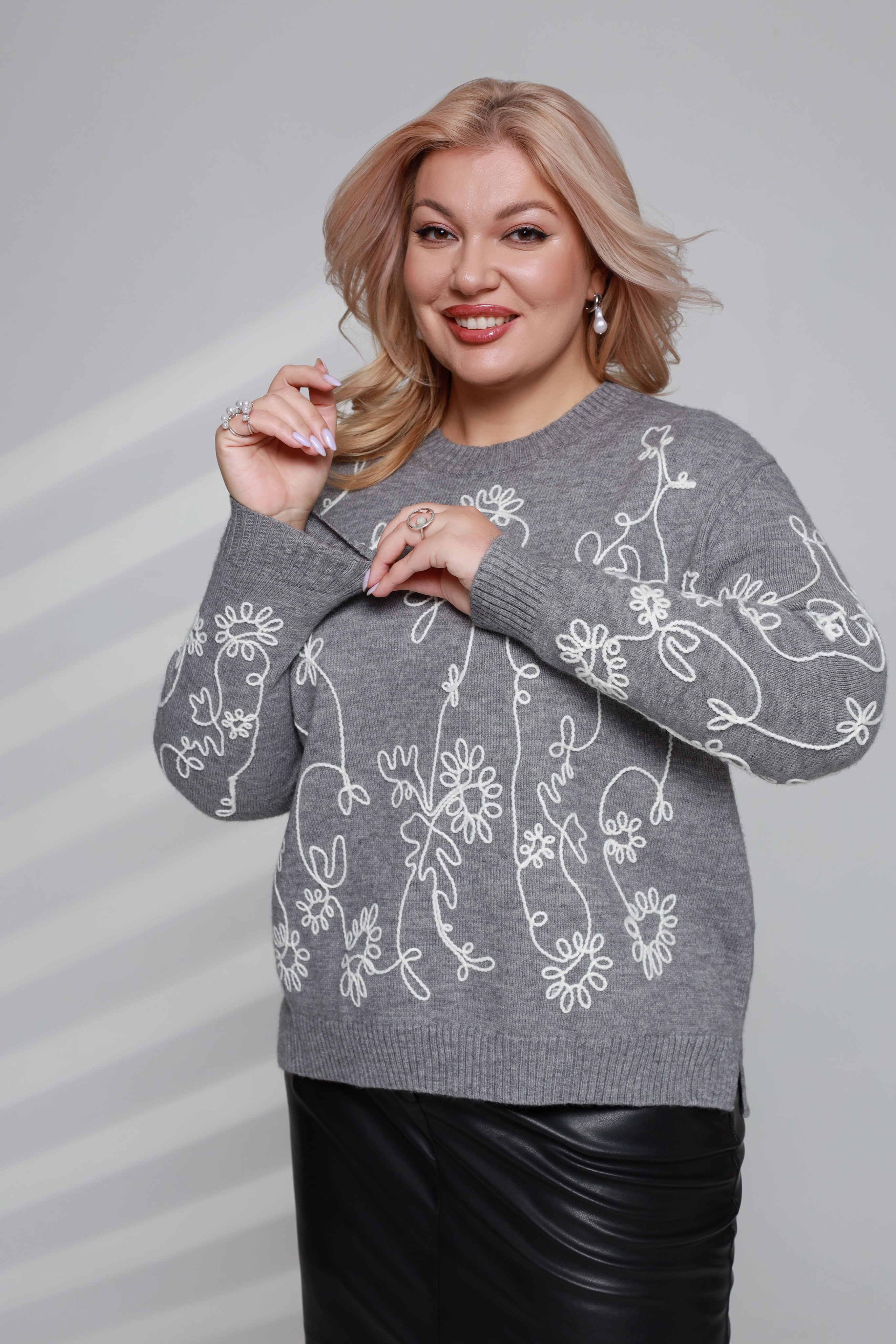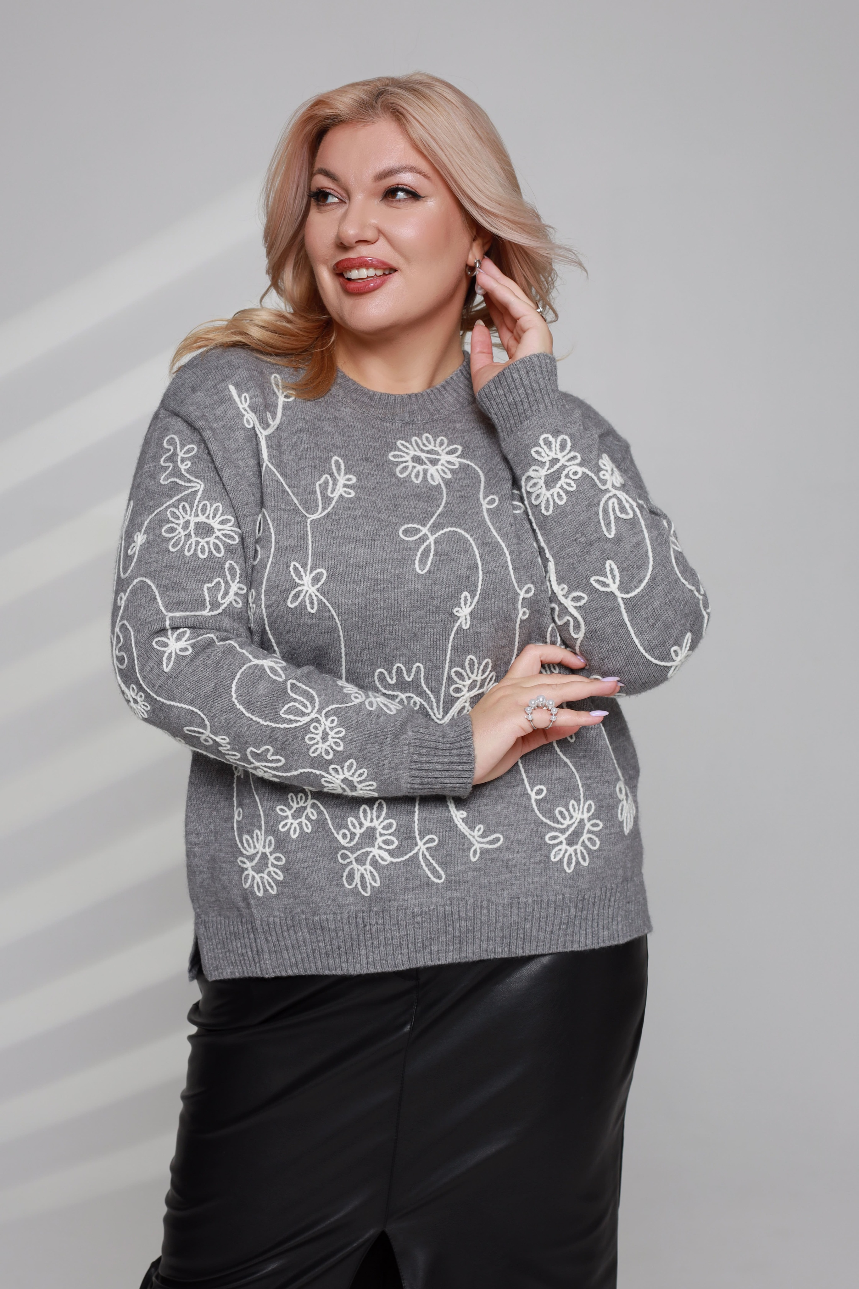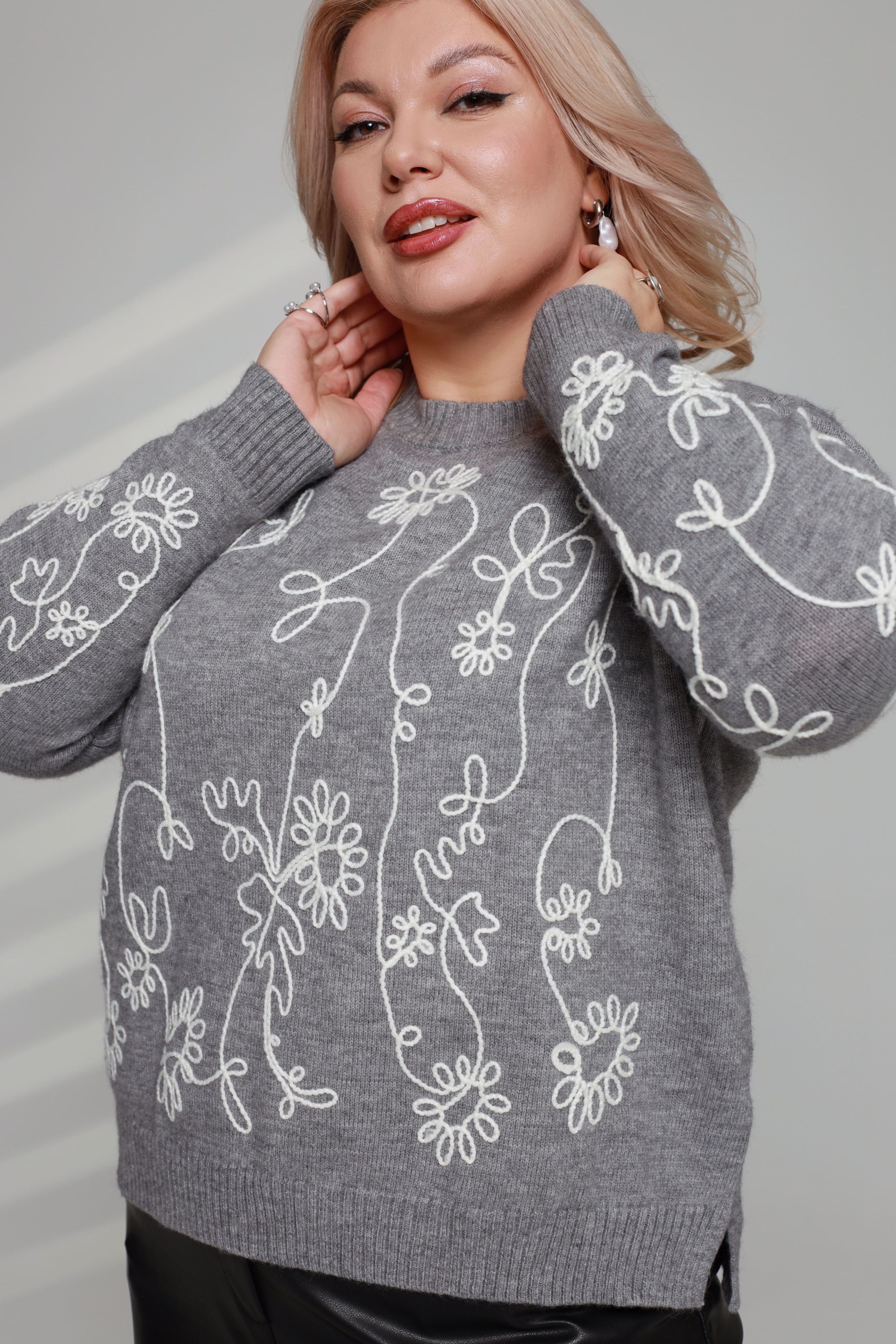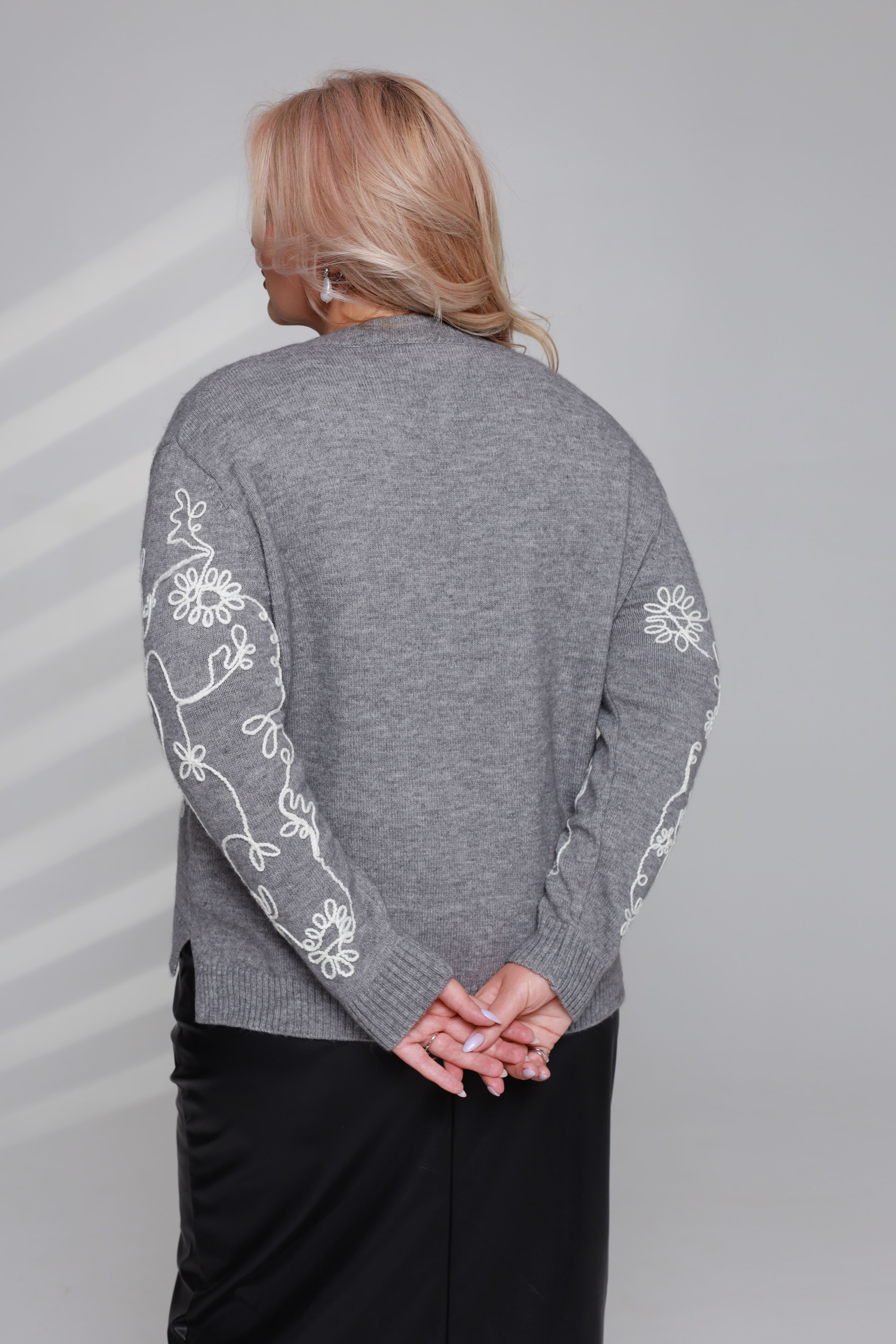 Свитер с вышивкой "цветы" серый