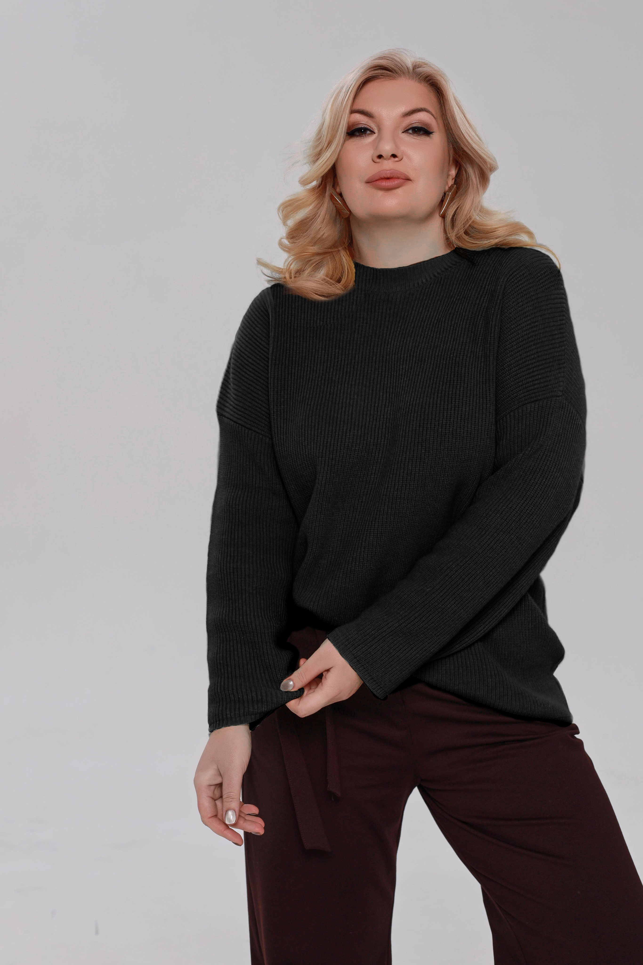 Стильный вязанный свитер свободного кроя выполнена из мягкого трикотажа. модель имеет круглый вырез и приспущенные рукава полной длины. фактурная вязка освежает образ и добавляет элегантности. свободный силуэт искусно обыгрывает фигуру, а мягкий материал обеспечивает максимальный комфорт в течение всего дня. однотонная классическая модель прослужит не один сезон, сохраняя свой первостепенный идеальный внешний вид. отлично сочетается с юбками и брюками.