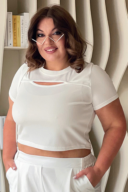 Укороченный топ облегающего кроя из мягкого трикотажа в рубчик имеет короткие втачные рукава. круглая горловина и женственный диагональный вырез на груди оформлены узким кантом. комбинировать топ такого плана можно с любимыми джинсами, брюками, юбками и шортами, создавая стильные аутфиты, в которых вам будет максимально комфортно.