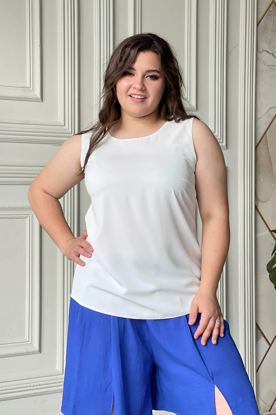 Классический однотонный топ свободного кроя из струящегося материала на широких бретелях. круглый вырез добавляет модели женственности и романтизма. модель можно комбинировать с юбками и брюками, так же будет хорошей базой под пиджаки и жакеты. топ позволяет выглядеть стильно при минимальных финансовых затратах.