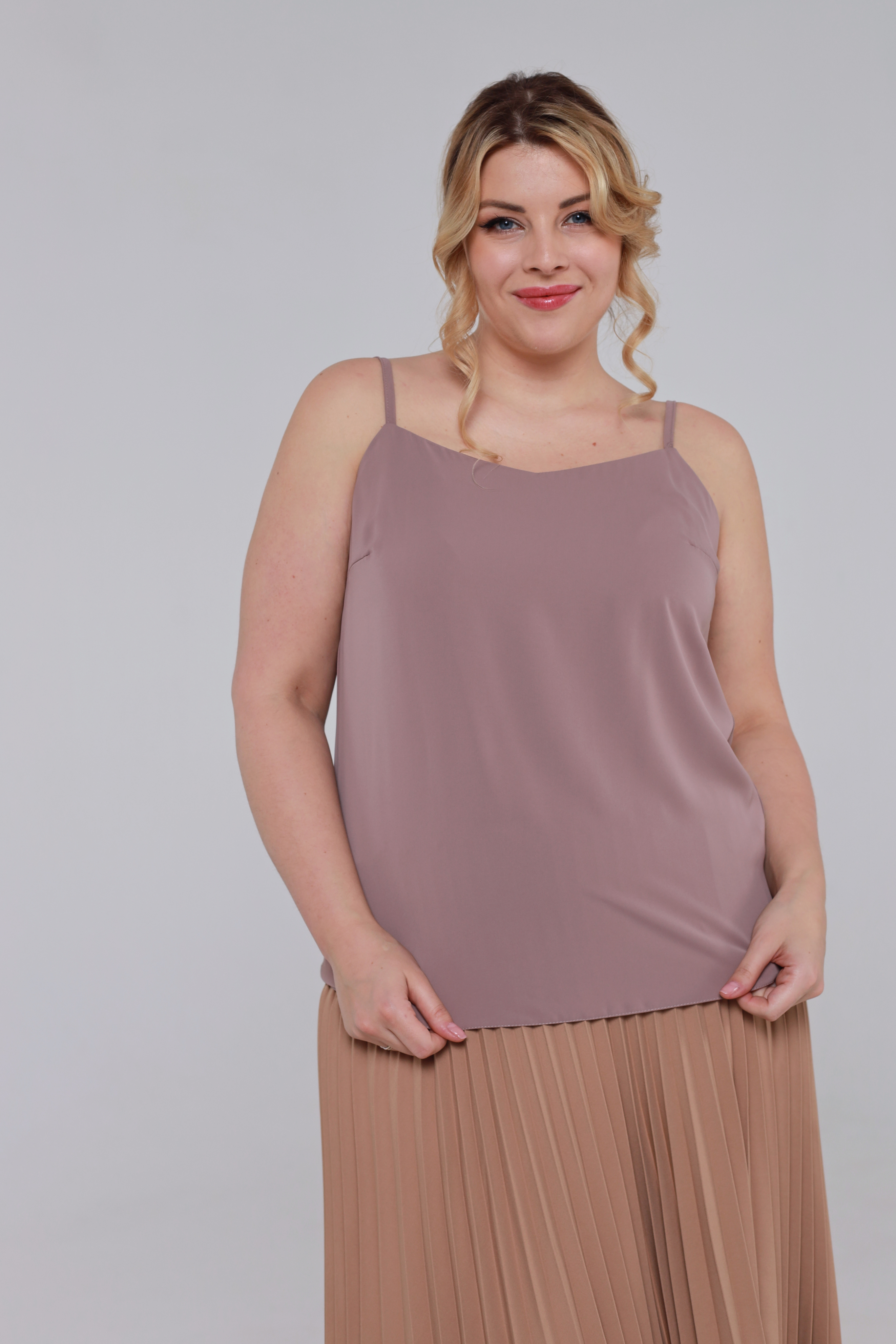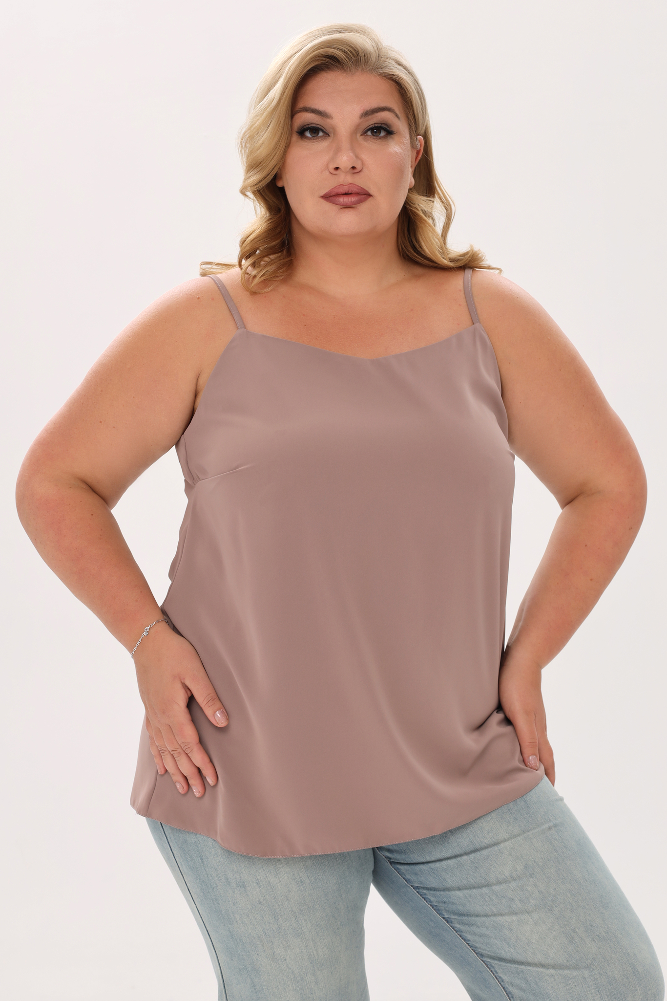 Классический однотонный топ свободного кроя из струящегося материала на регулируемых тонких бретелях. v-образный вырез добавляет модели женственности и романтизма. модель можно комбинировать с юбками и брюками, также будет хорошей базой под пиджаки и жакеты. топ позволяет выглядеть стильно при минимальных финансовых затратах.