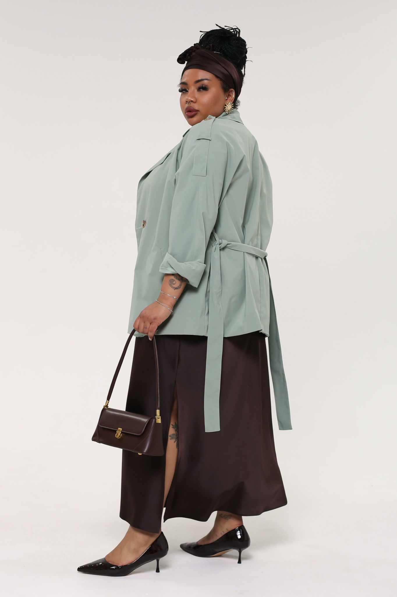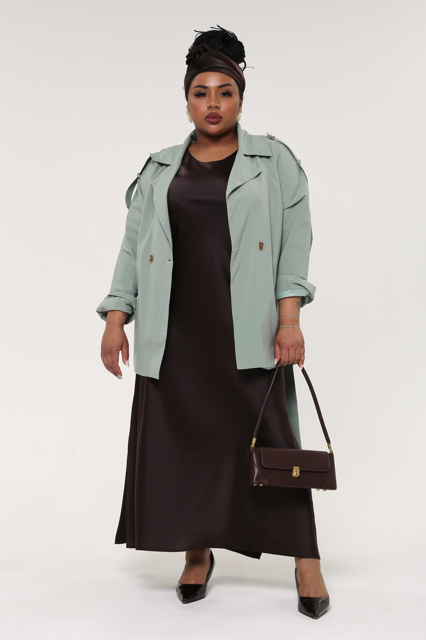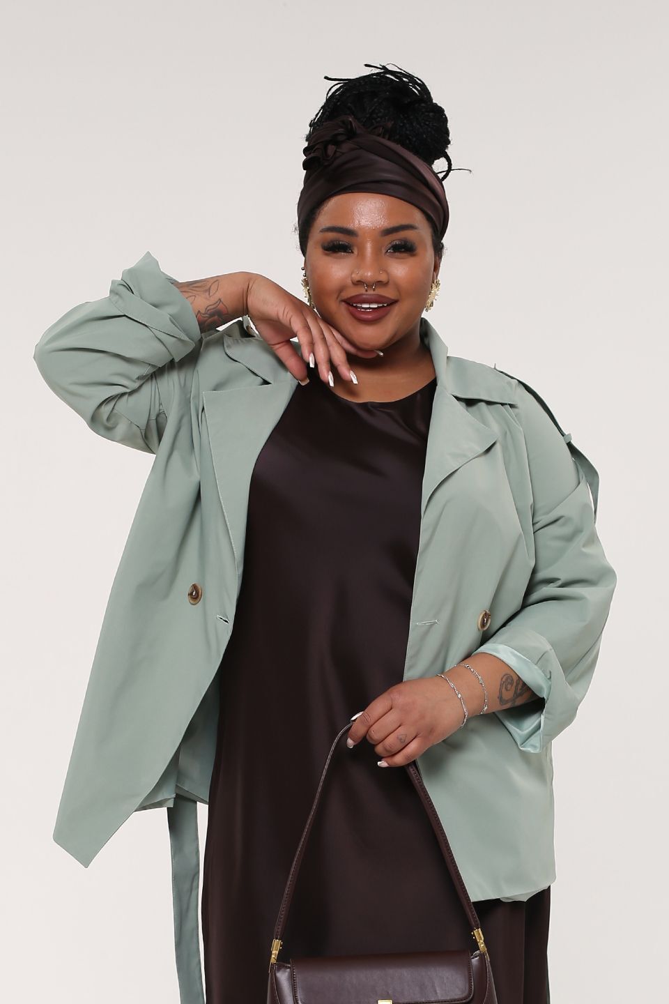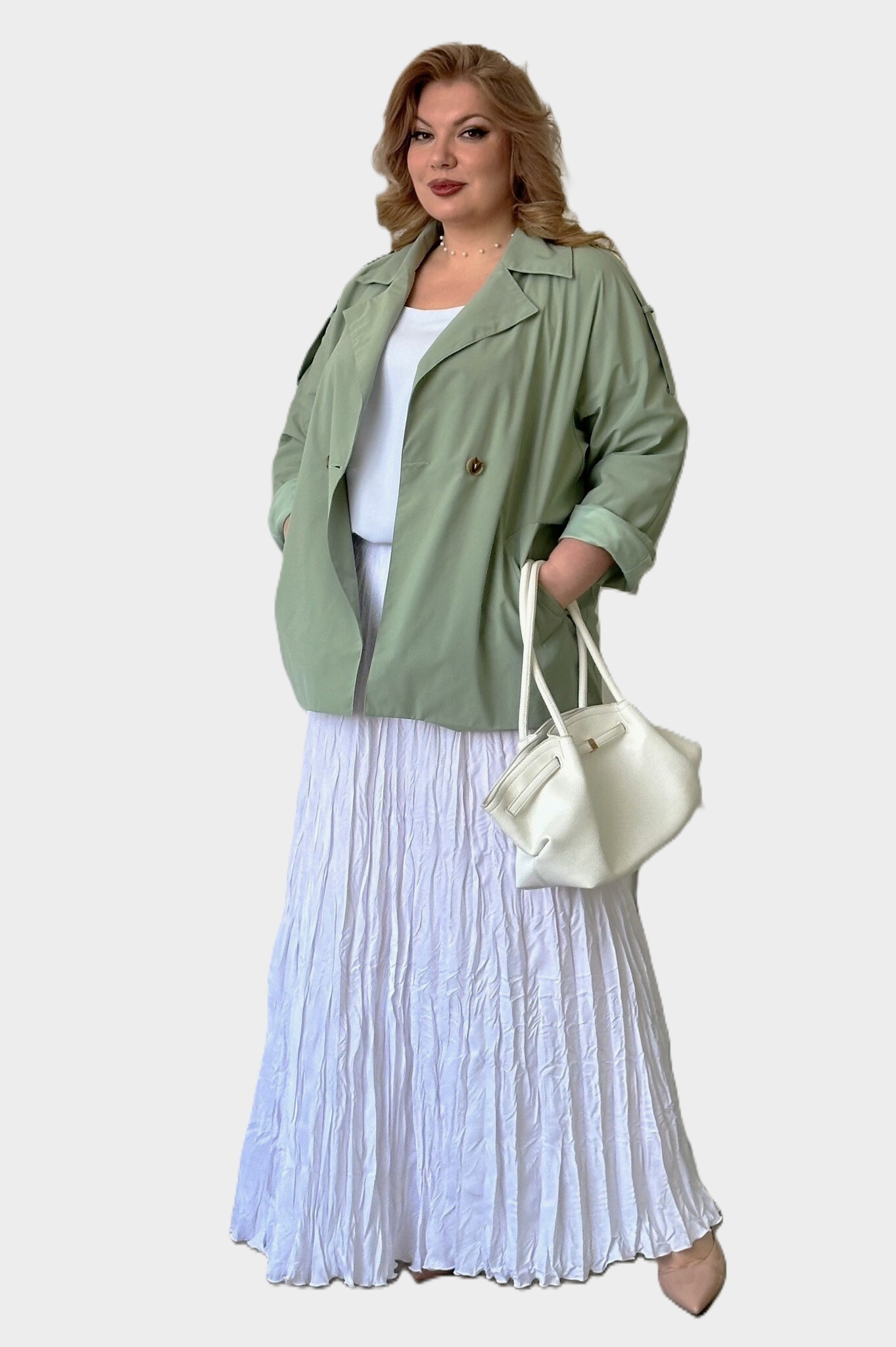 Тренч оверсайз из мягкой и водоотталкивающей плащевой ткани — идеальное решение для межсезонья, гармонично сочетающее функциональность с современным дизайном. глубокий v-образный вырез эффектно дополнен отложным воротником и лацканами, придающими изделию стильный и элегантный вид. длинные рукава с цельнокроенными деталями оснащены погонами и регулируемыми отворотами для максимального комфорта. прорезные карманы с листочками по бокам добавляют практичности, а контрастные пуговицы и пояс того же цвета подчеркивают талию, создавая завершенный образ. центральный шов на спинке обеспечивает идеальную посадку, а общая конструкция делает тренч универсальным элементом гардероба, который легко сочетается с платьями, юбками разной длины, брюками и джинсами.