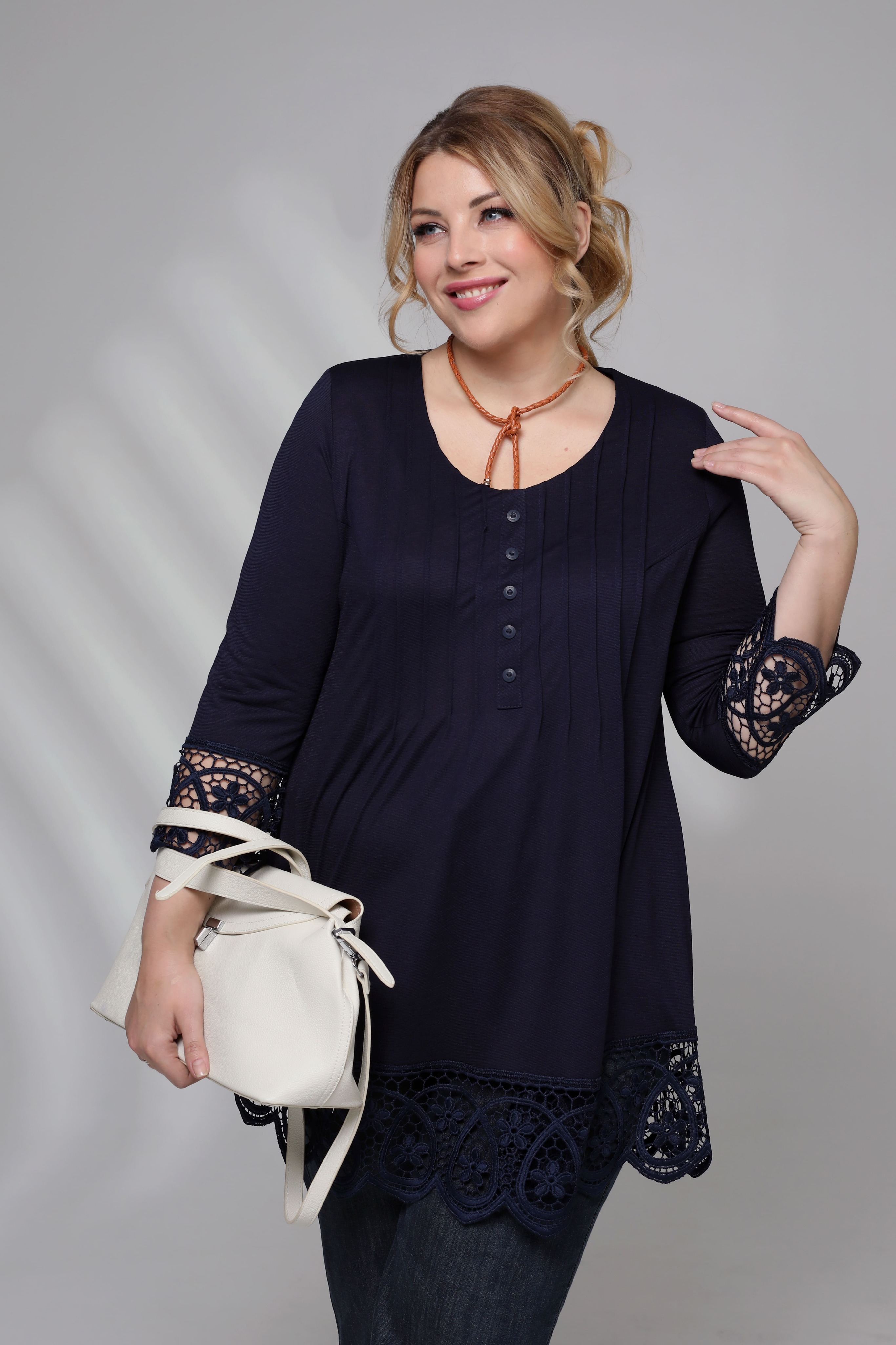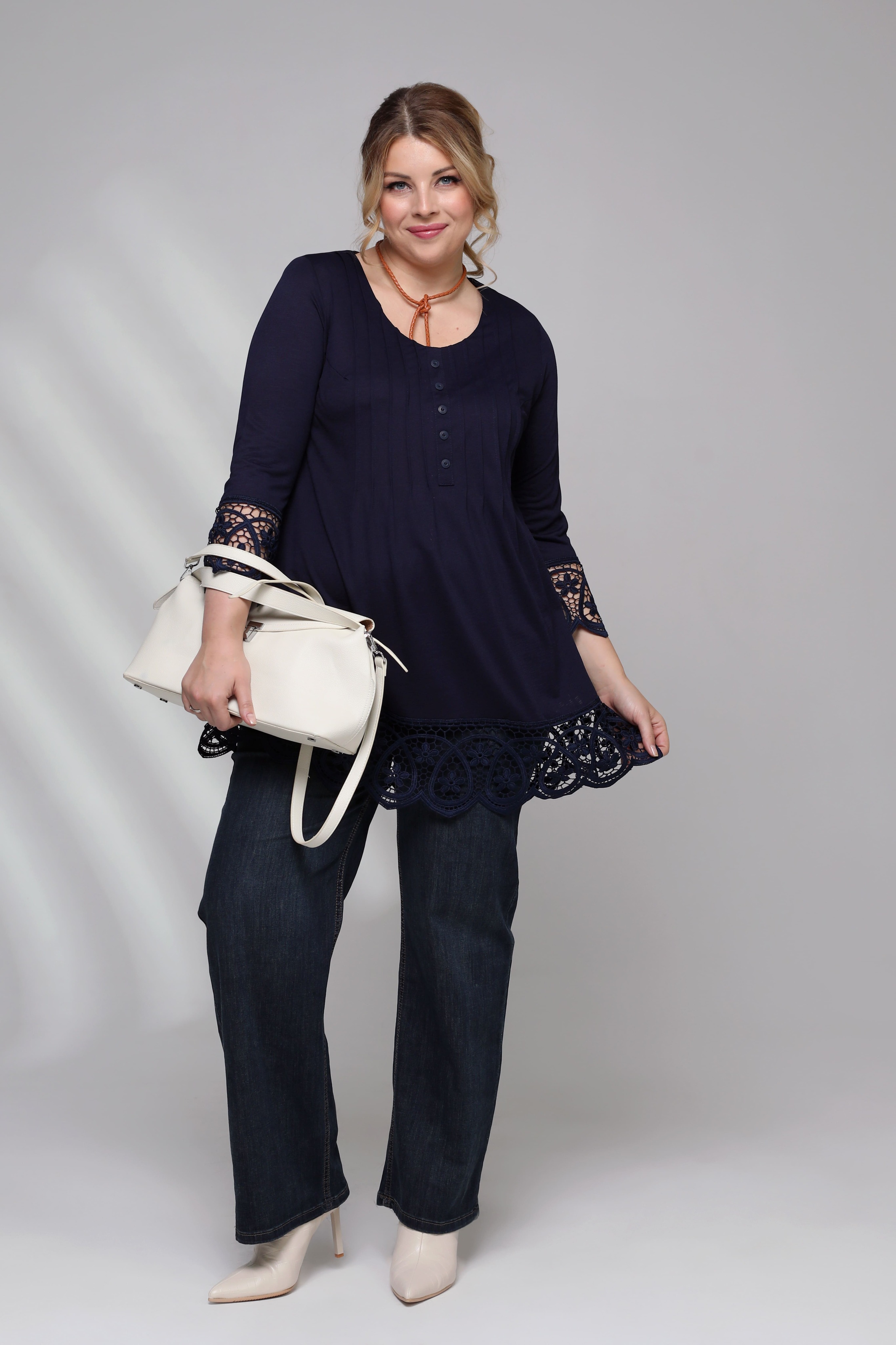 Туника выполнена из струящегося мягкого трикотажа. круглый вырез переходит в декоративную планку с маленькими пуговицами. длинные рукава и низ изделия декорированы ажурным кружевом. декоративные складки на груди добавляют оригинальности. свободный крой искусно обыгрывает фигуру, а нагрудные вытачки способствуют оптимальной посадке по фигуре. небольшие подплечники визуально стройнят. модель является прекрасным вариантом, чтобы разнообразить гардероб чем-то красивым. туника отлично сочетается с узкими брюками и легинсами.