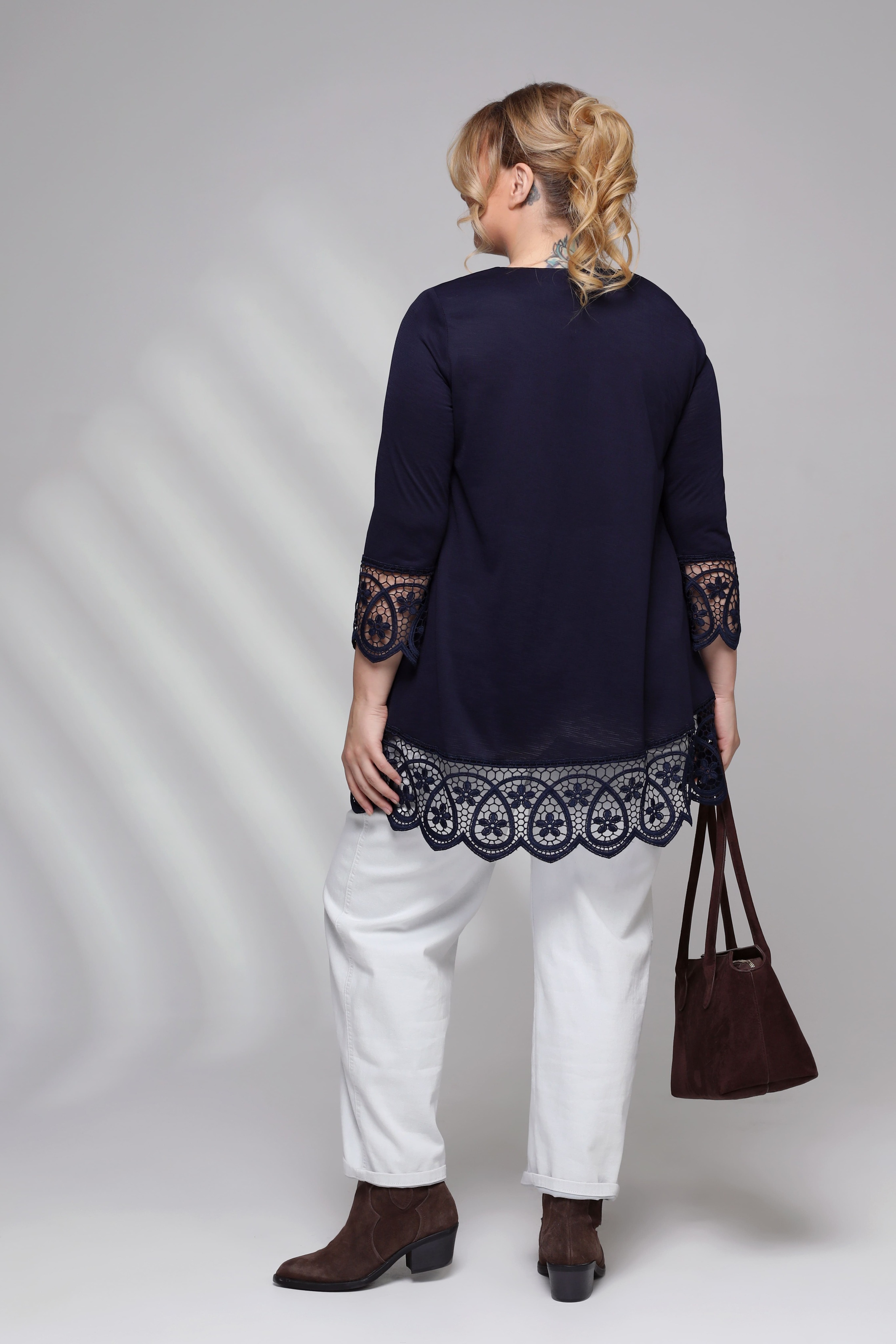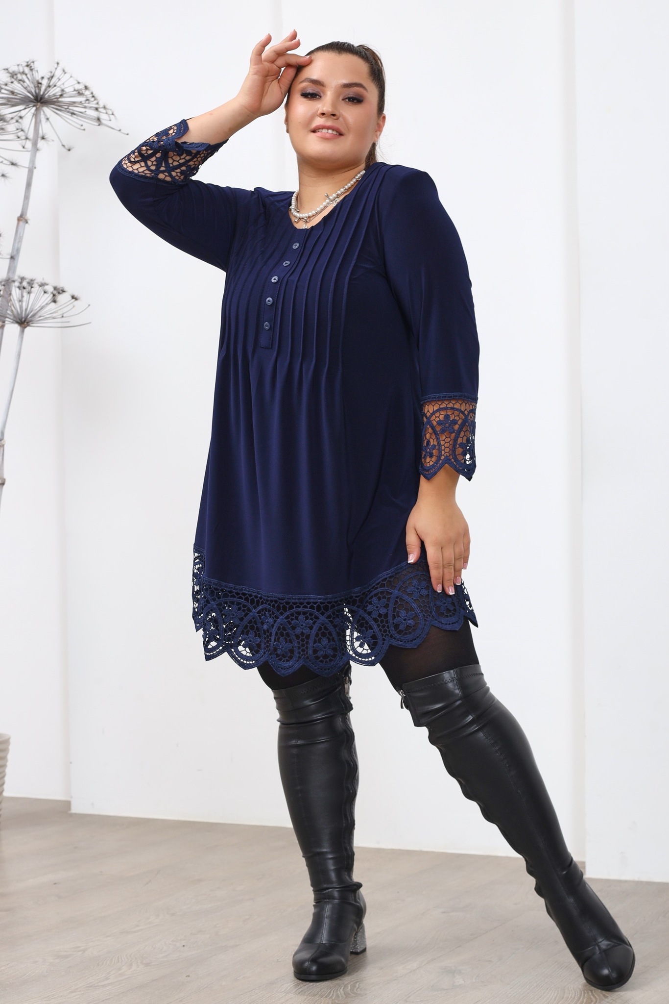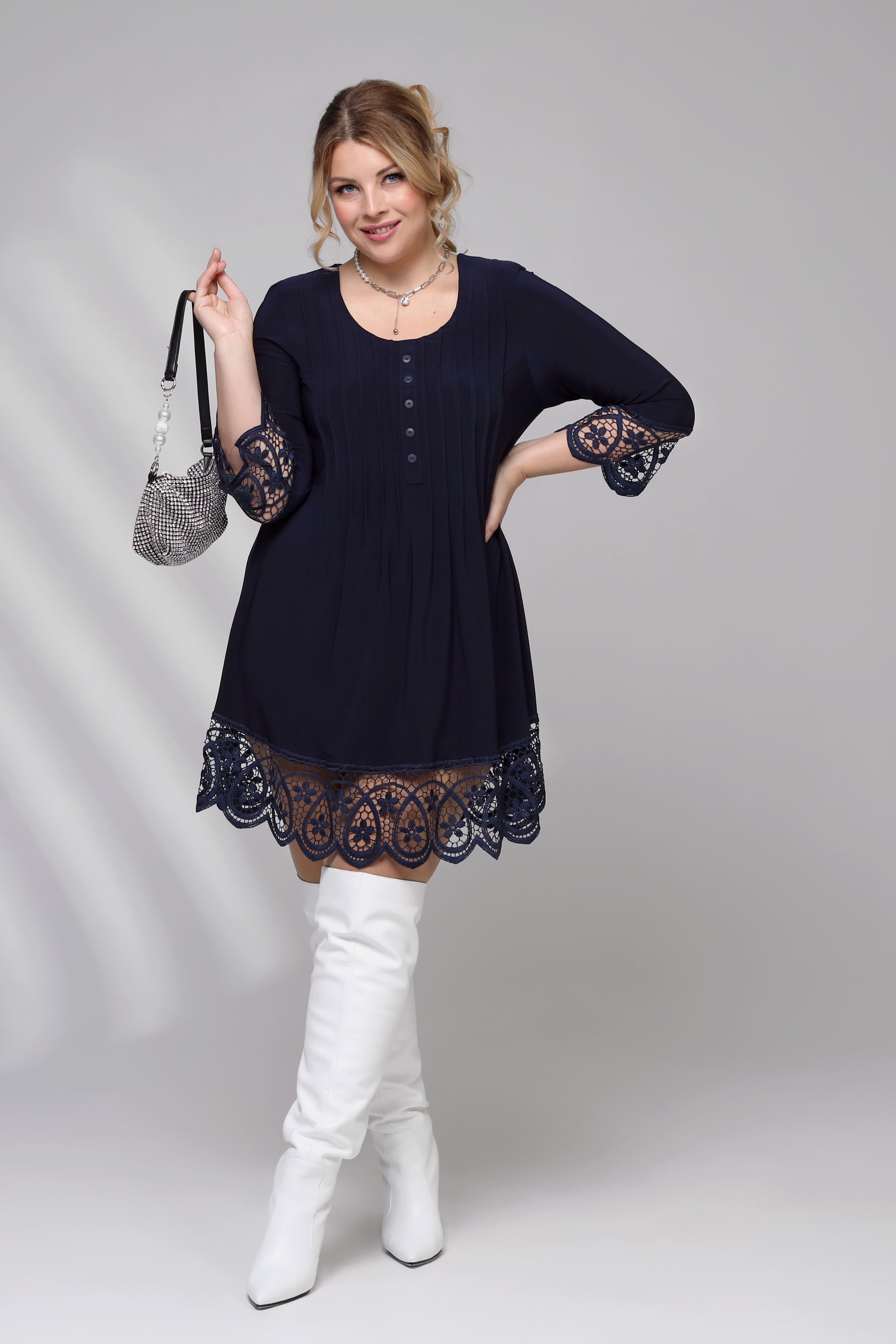 Туника с кружевом со складками на груди темно-синяя