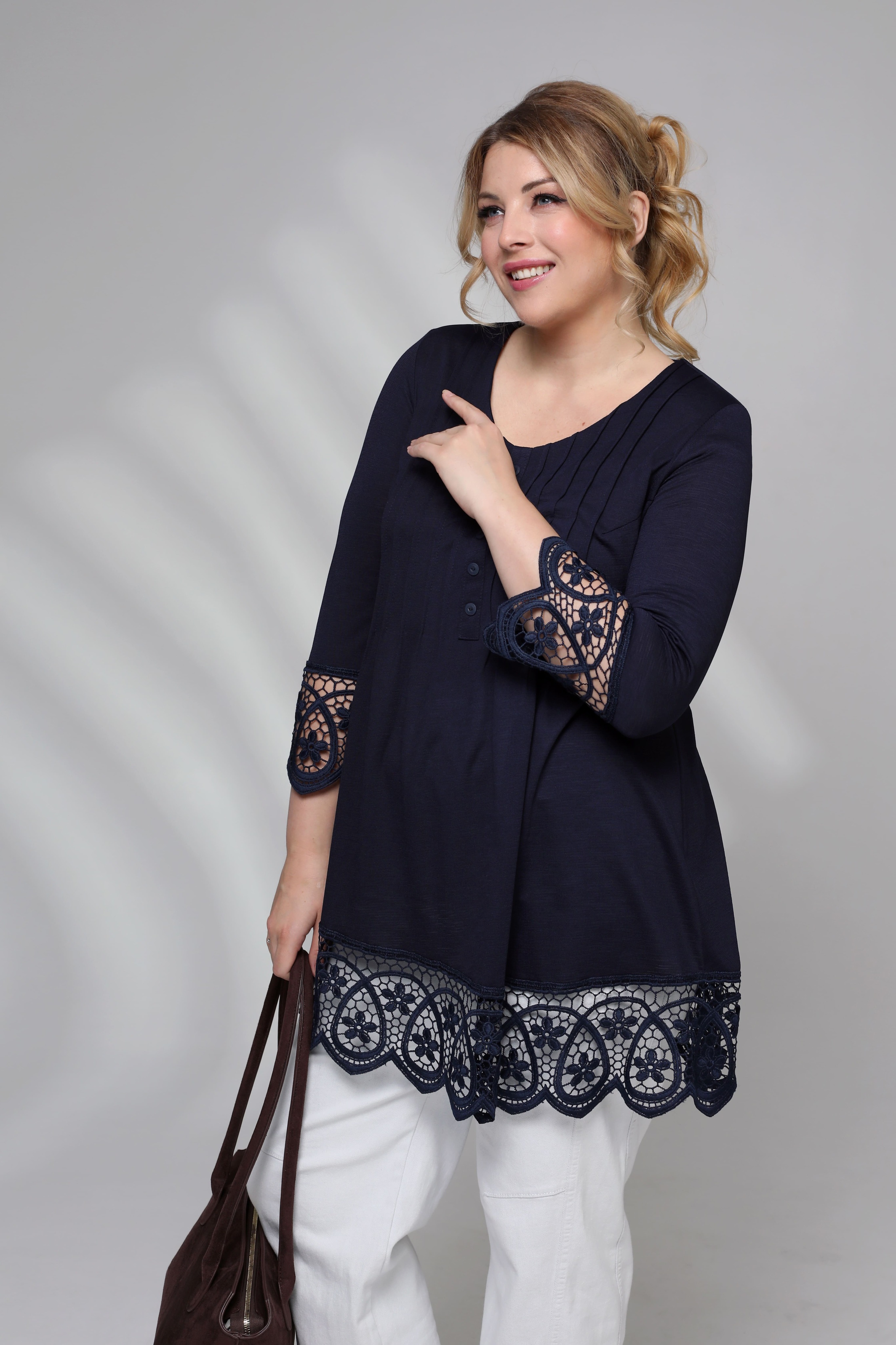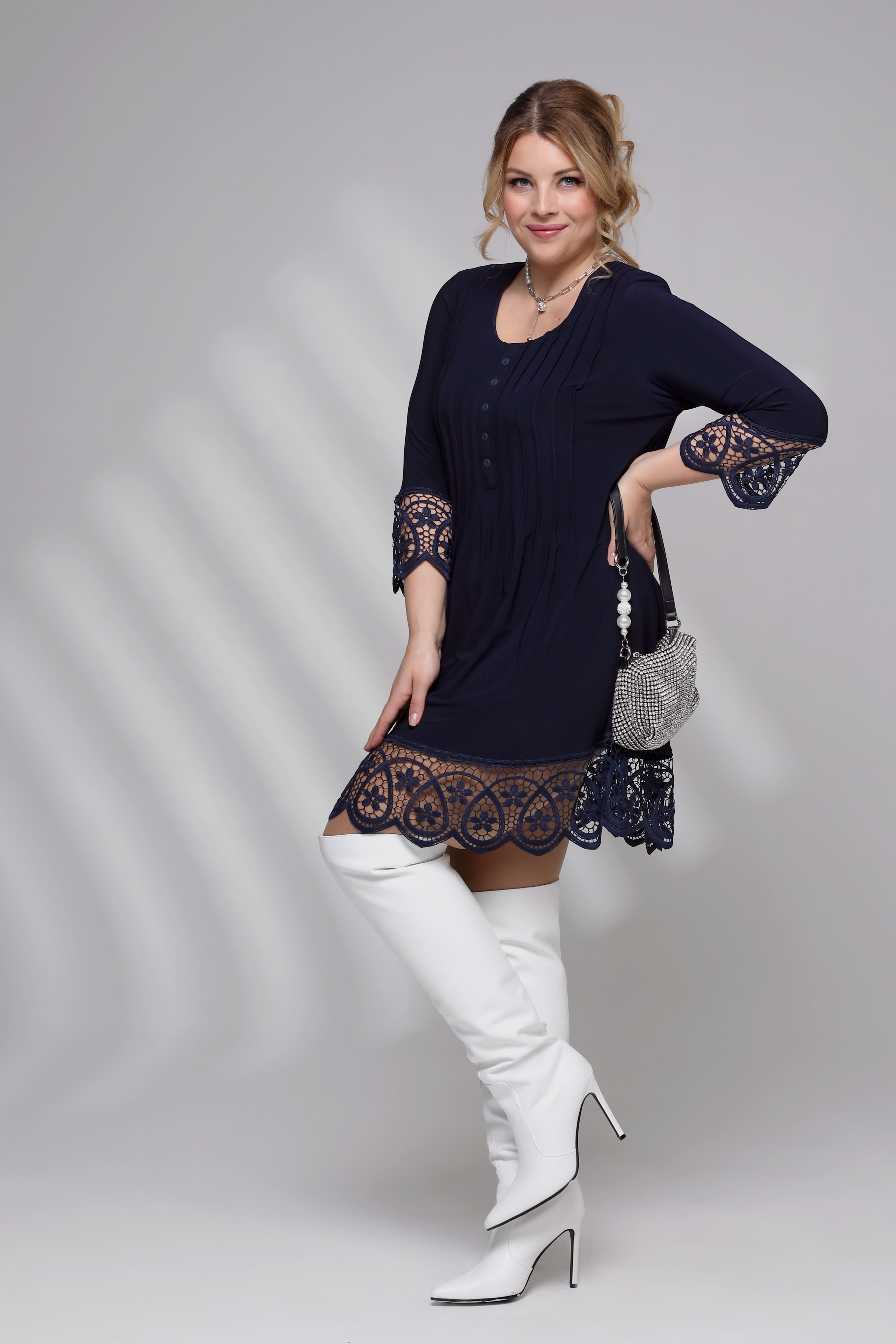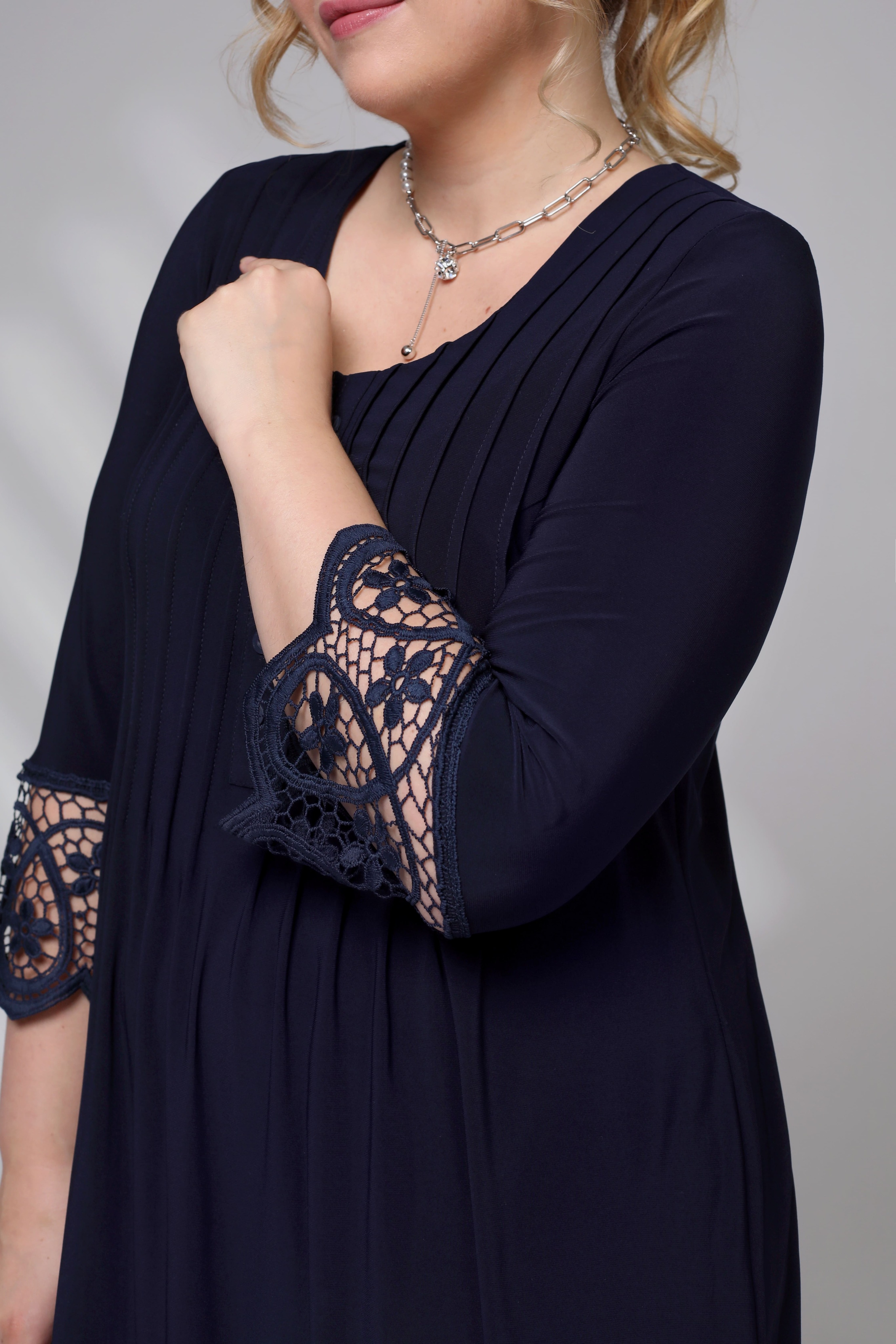 Туника с кружевом со складками на груди темно-синяя