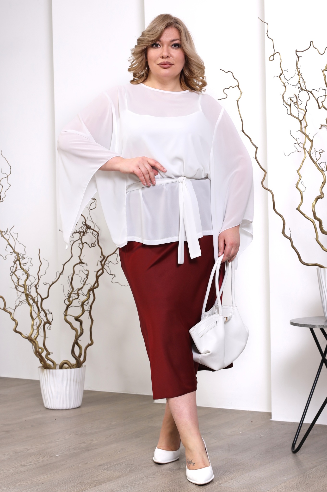 Туника шифоновая летучая мышь с поясом белая