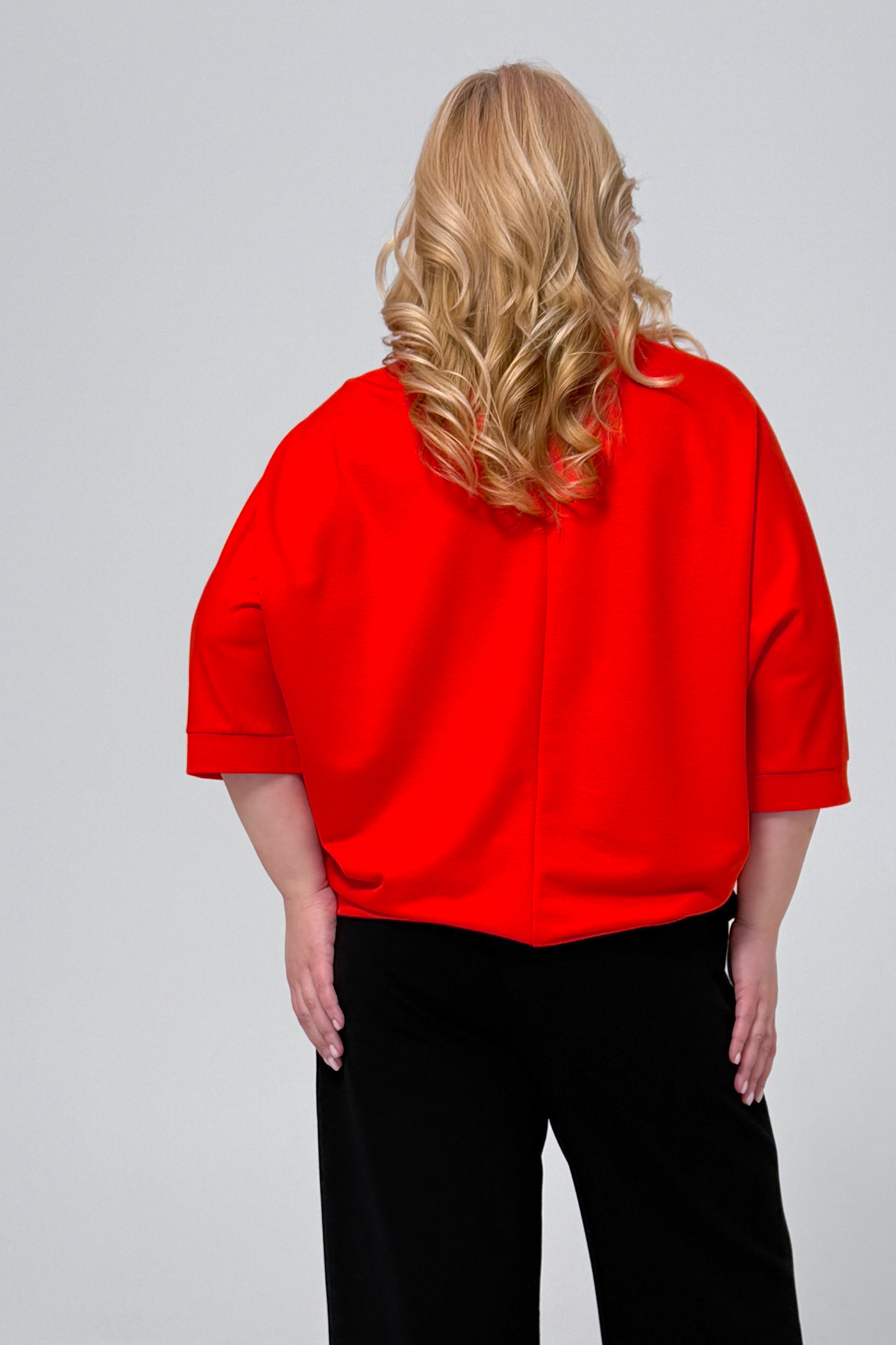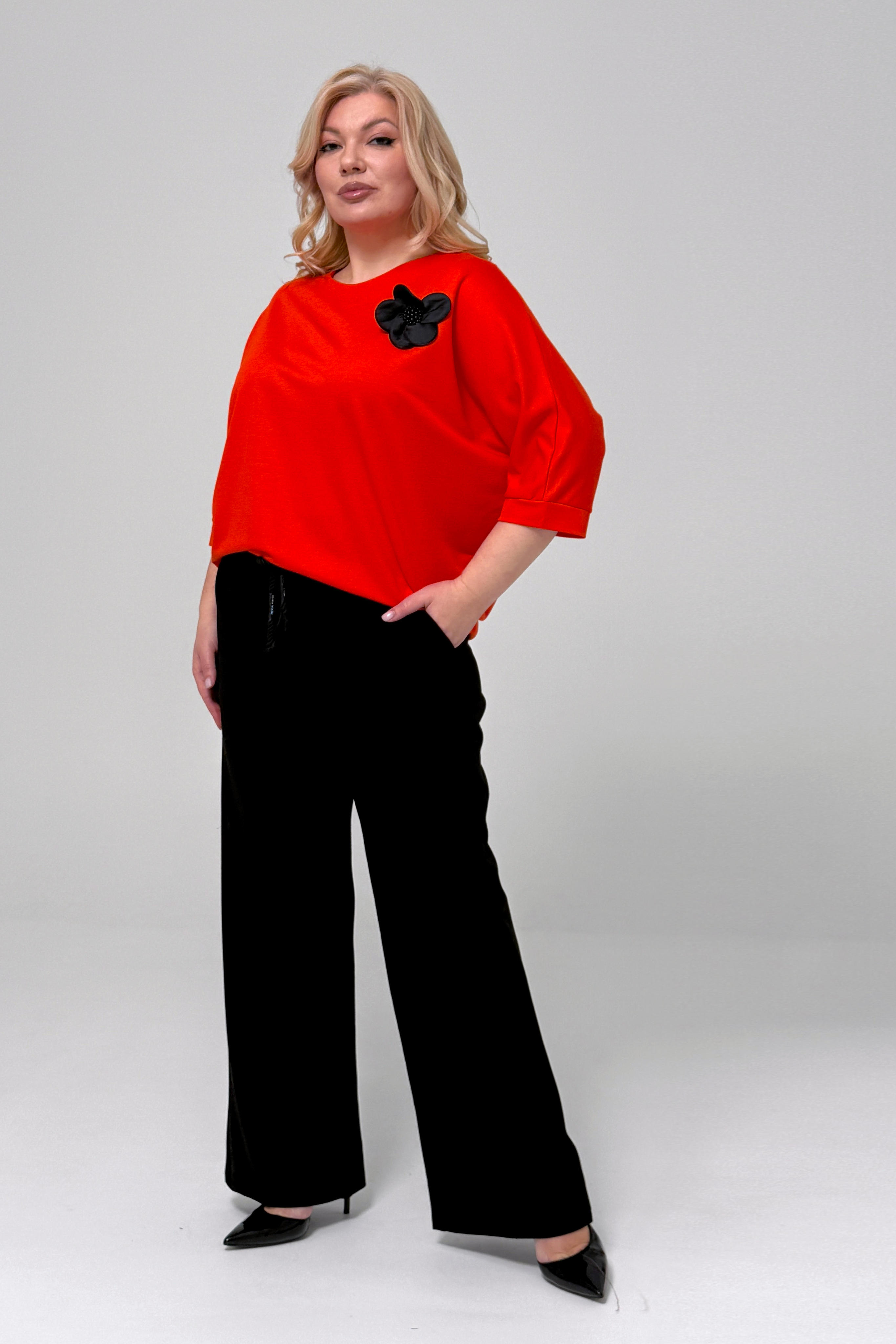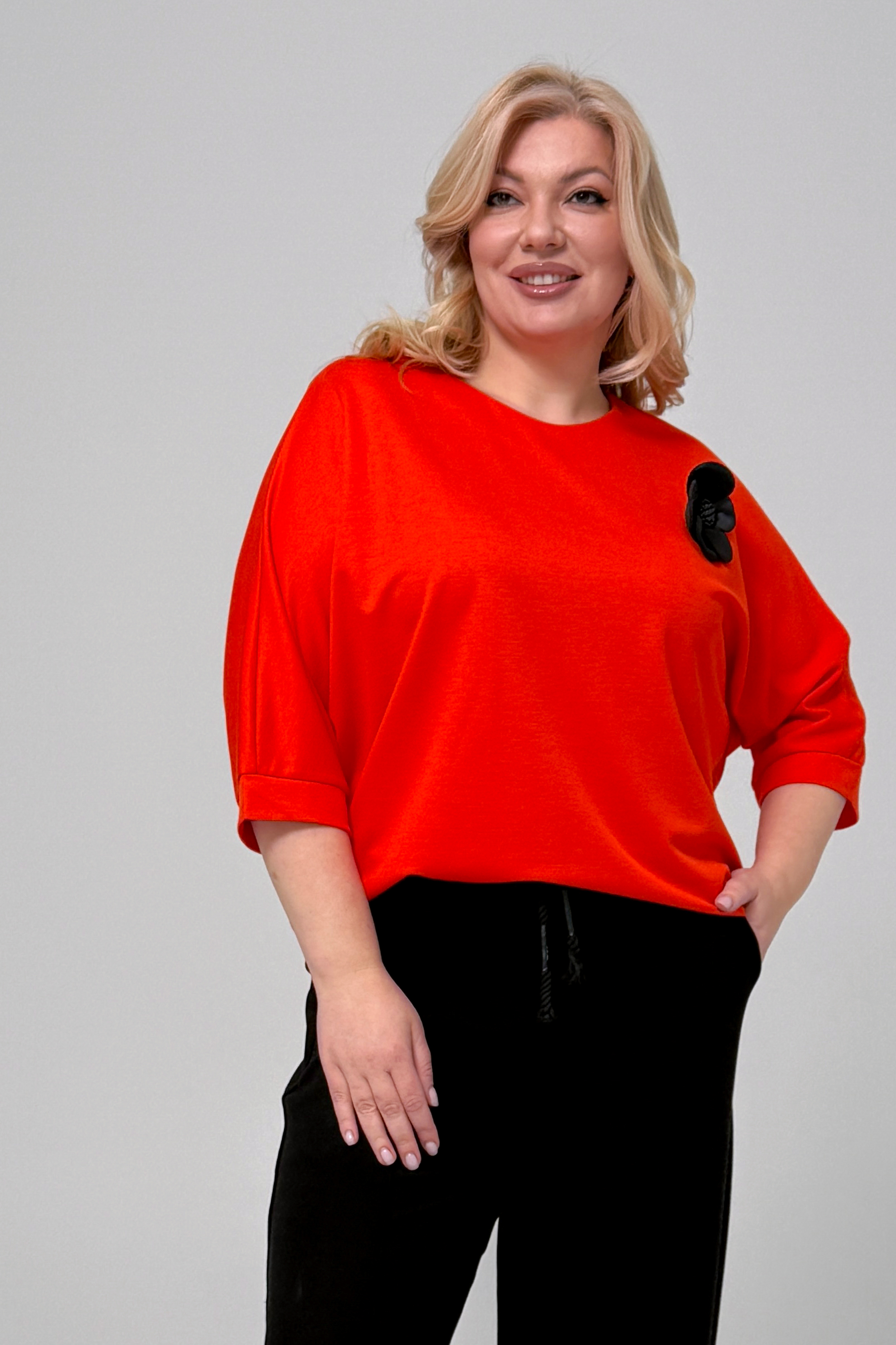 Туника однотонная со спущенным рукавом с цветком на груди оранжевая