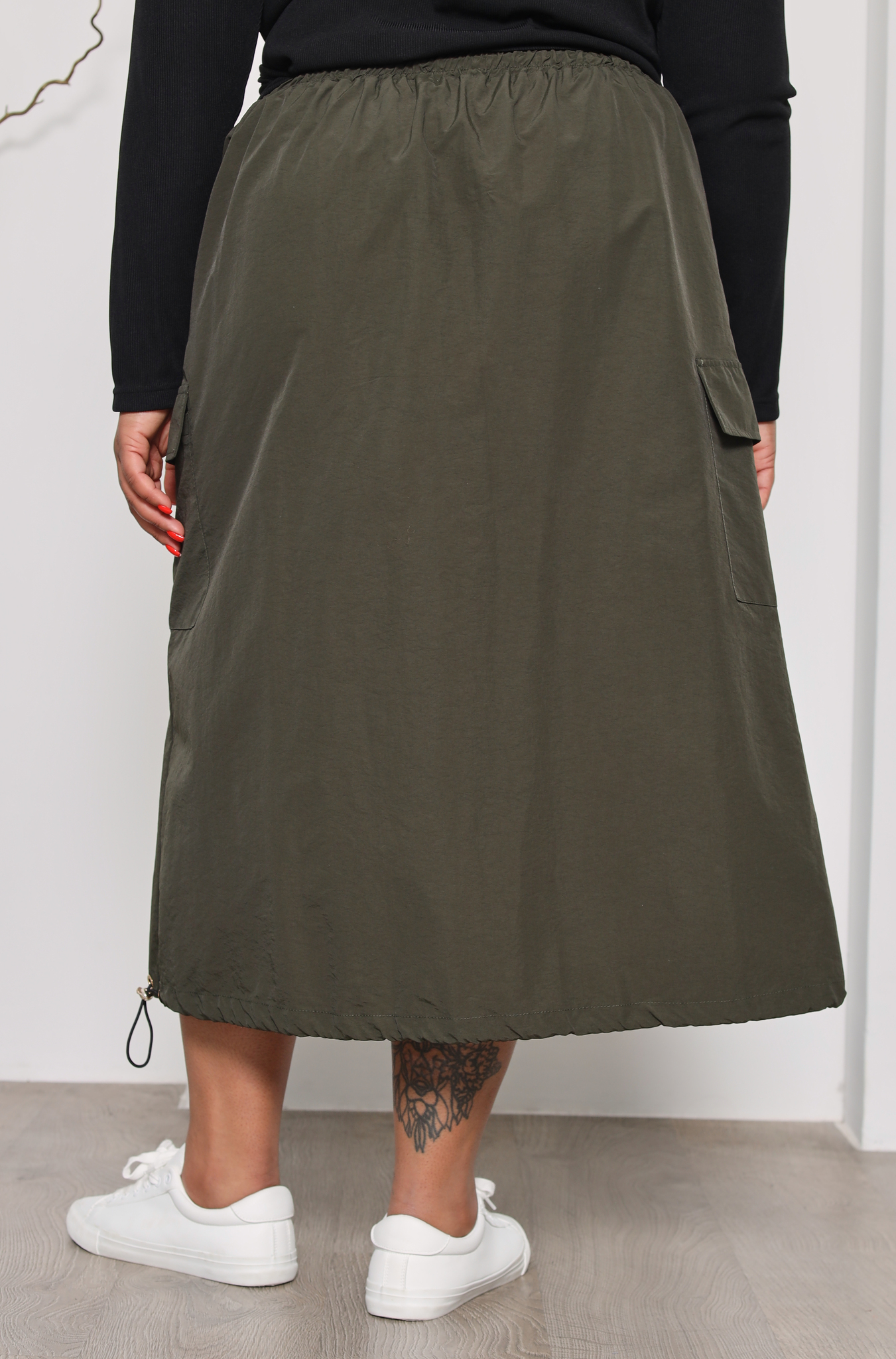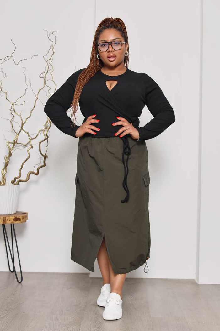 Юбка с нашивными карманами с кулисками по бокам темный хаки