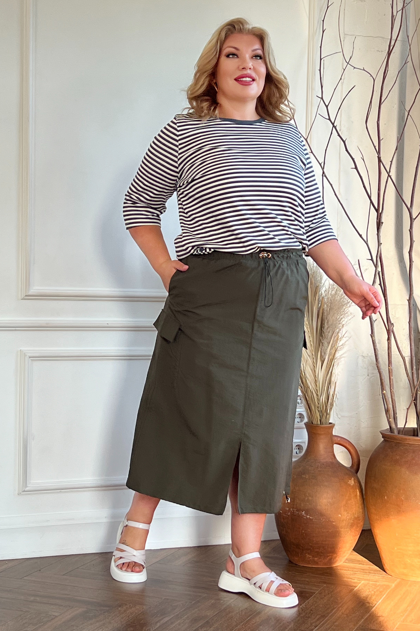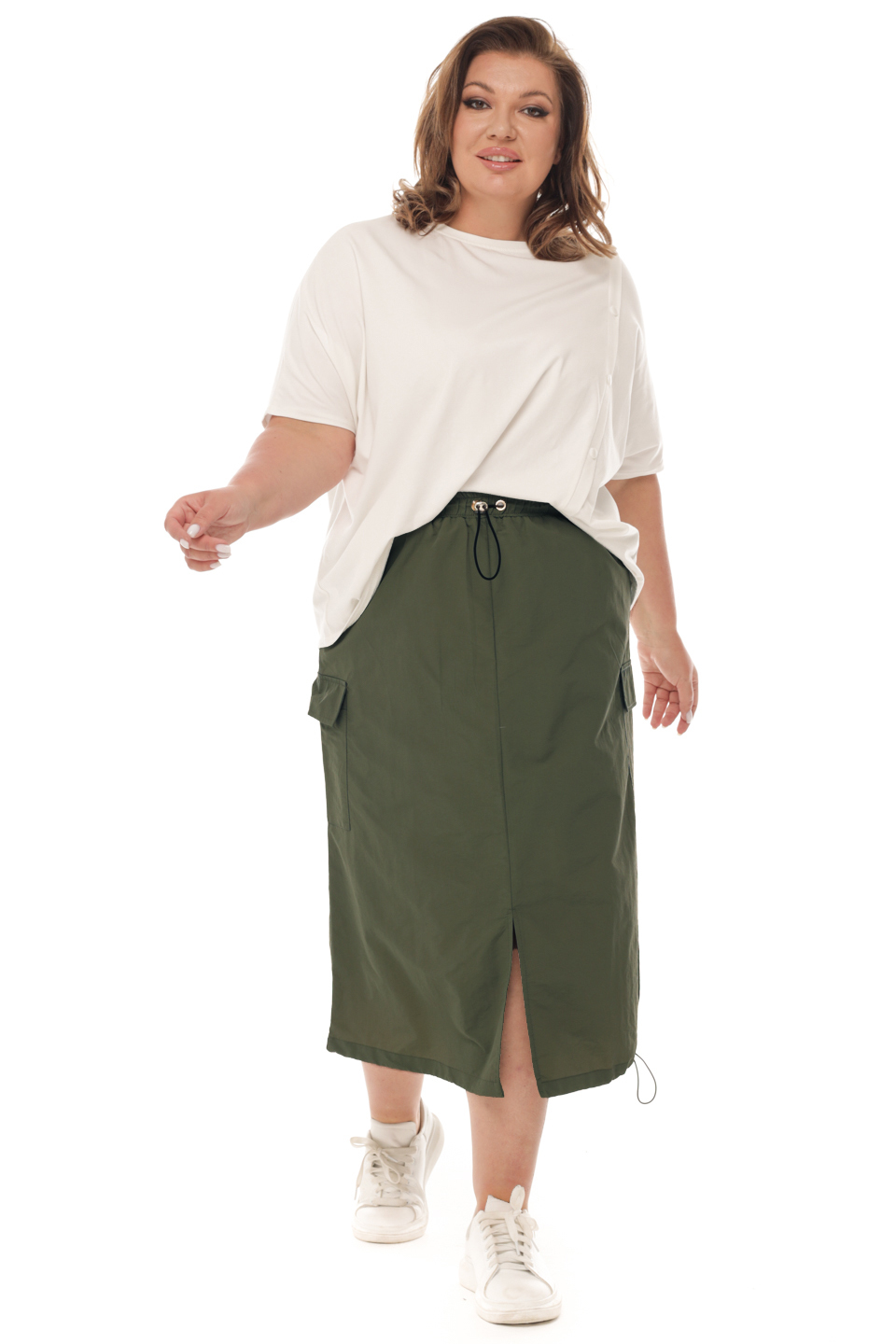 Стильная юбка из мягкой ткани подчеркнет достоинства женской фигуры. широкая притачная резинка по поясу дополнена кулиской, что способствует оптимальной посадке. полуприлегающие клинья искусно обыгрывают бедра и добавляют образу женственности и романтизма. практичные карманы по бокам оформлены клапанами. также для удобства присутствуют вшивные карманы. центральный шов по переду переходит в небольшой кокетливый разрез. кулиской с люверсами можно регулировать длину юбки по бокам. носить юбку такого плана можно с любимыми футболками, блузами и рубашками.