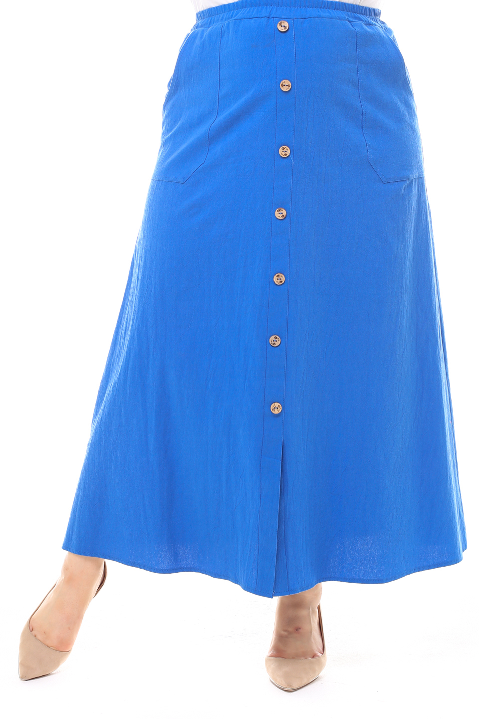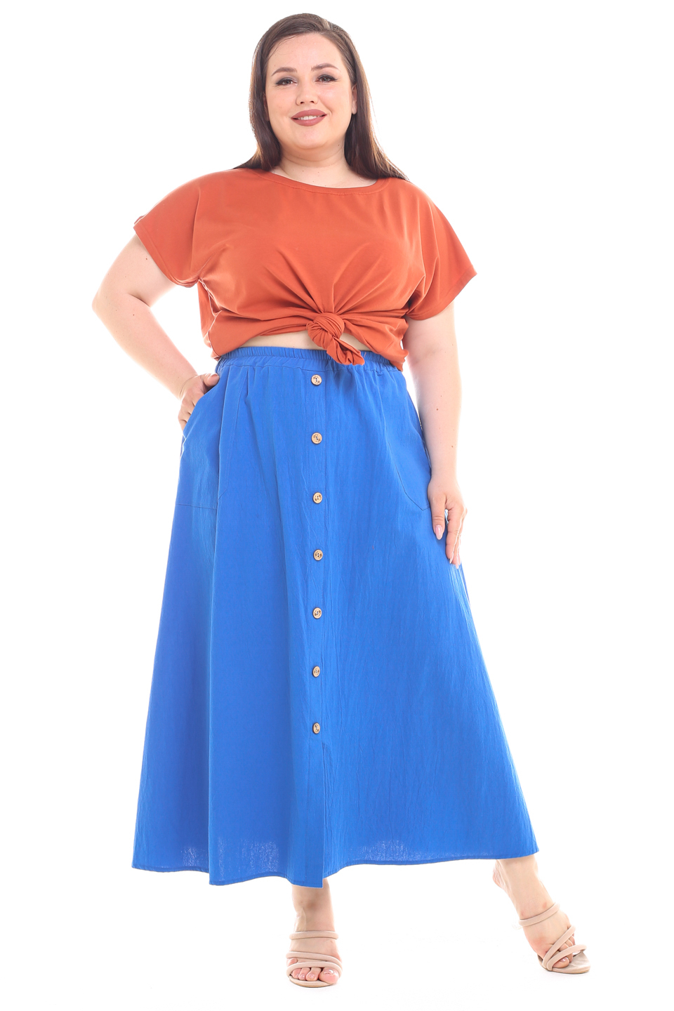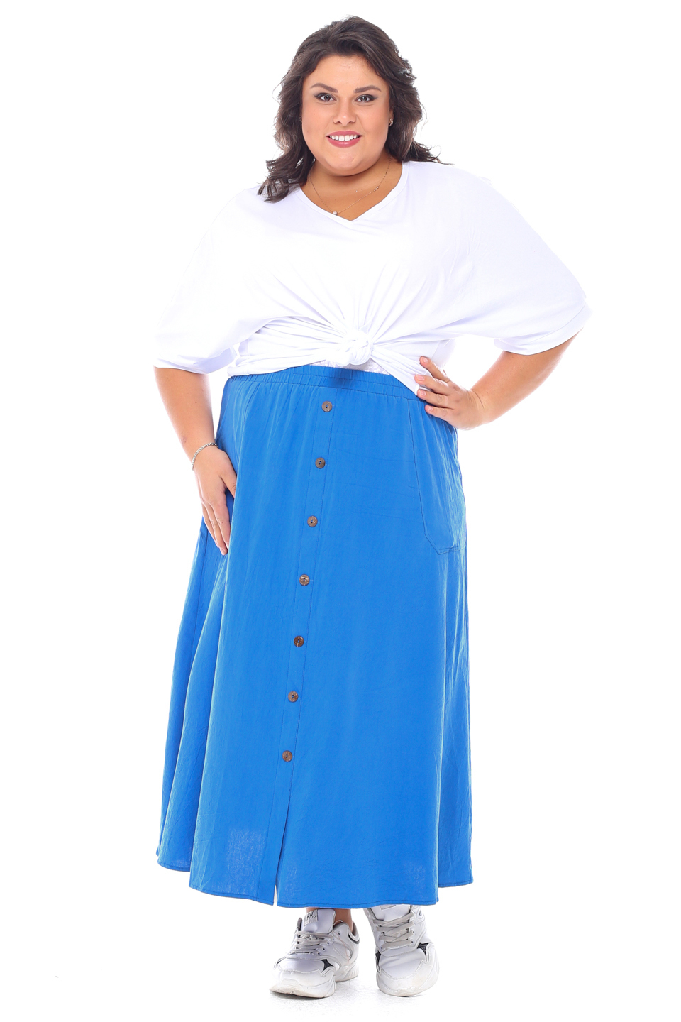 Стильная юбка из мягкой ткани подчеркнет достоинства женской фигуры. широкий притачная резинка по поясу способствует оптимальной посадке по фигуре. расклешенные клинья модели искусно обыгрывают бедра и добавляют образу женственности и романтизма. по бокам практичные карманы. декоративные пуговки по переду добавляют модели нарядности и освежают образ. носить юбку такого плана можно с любимыми футболками, обтягивающими водолазками, блузами и рубашками.