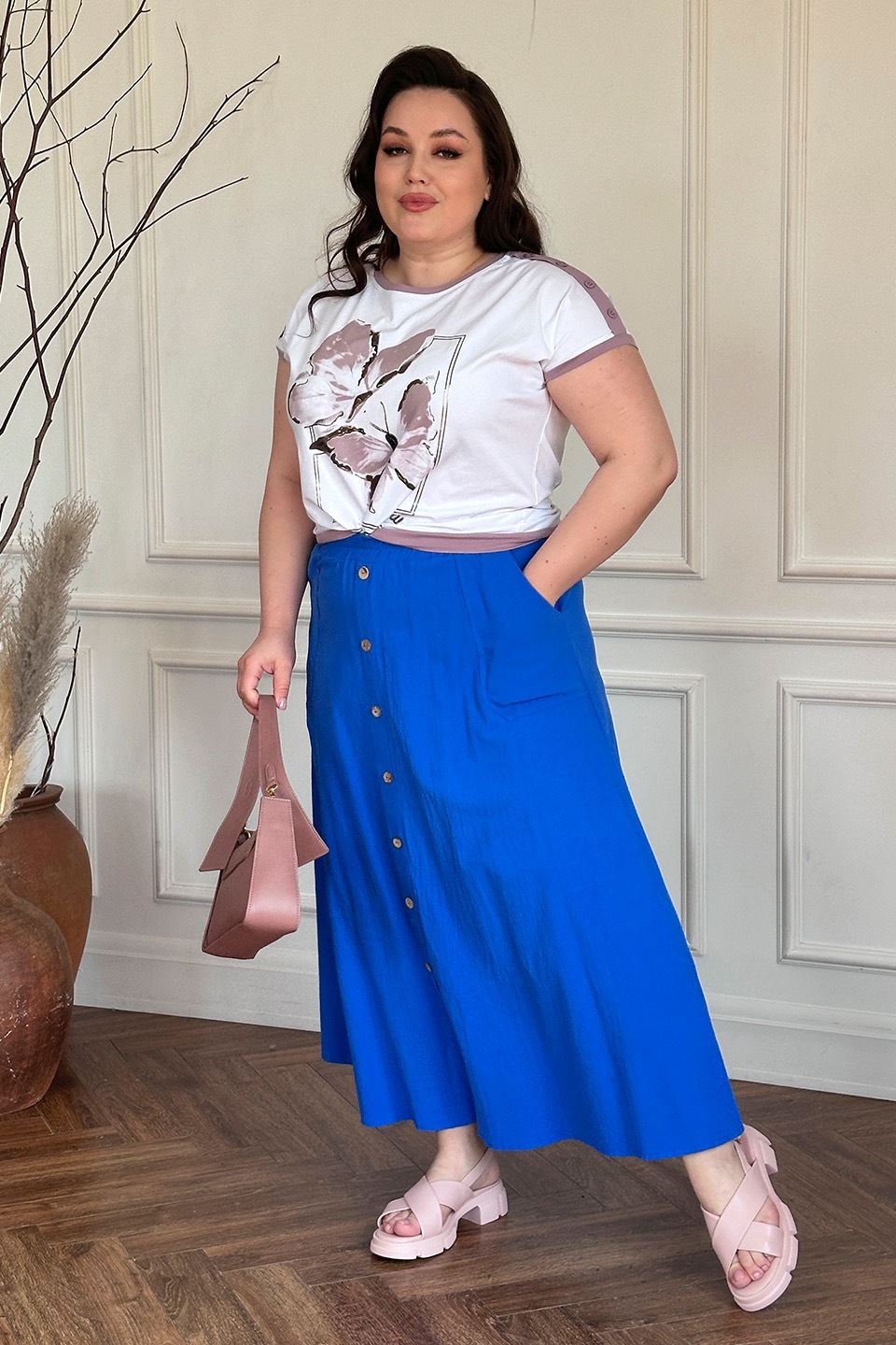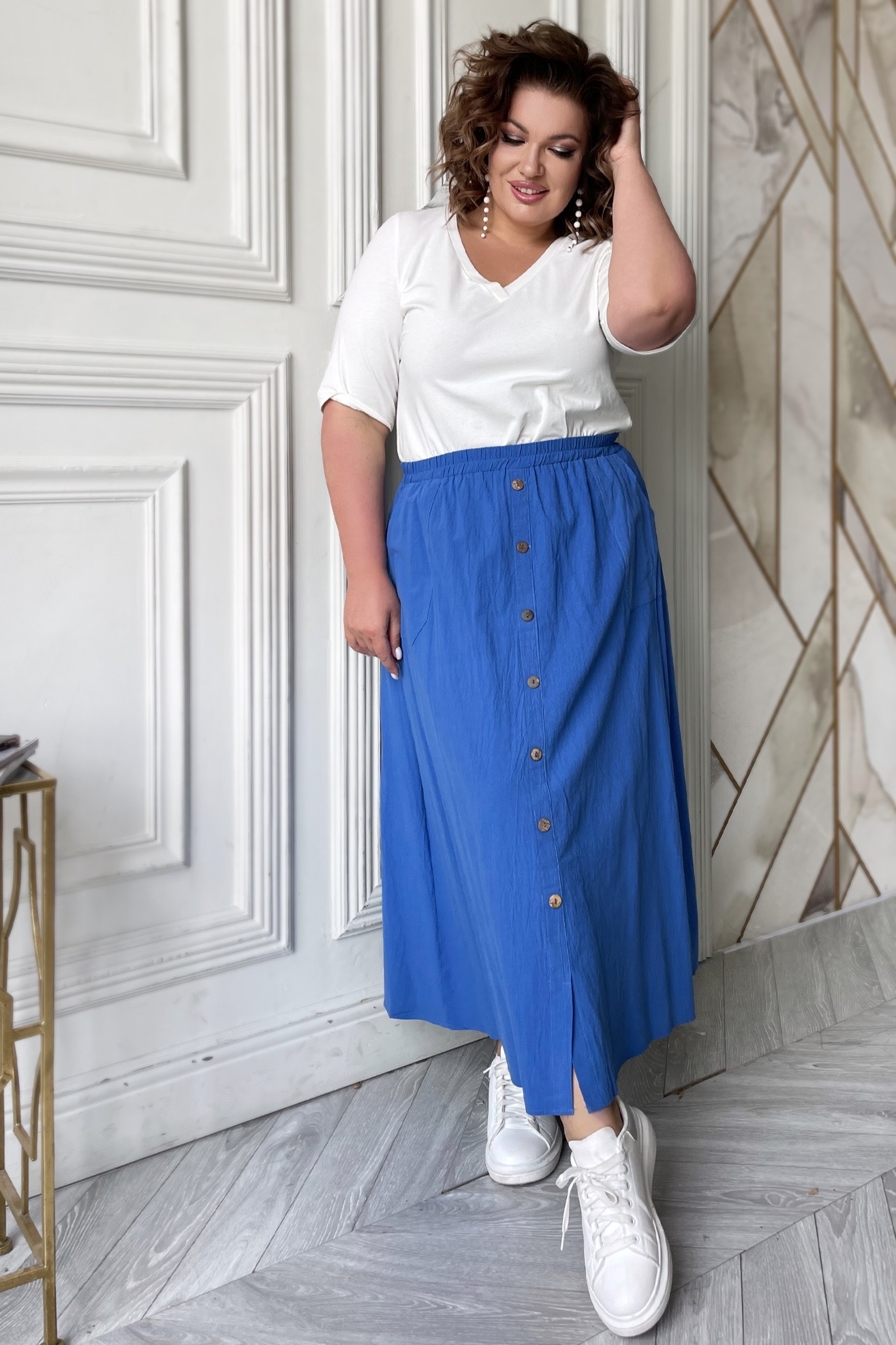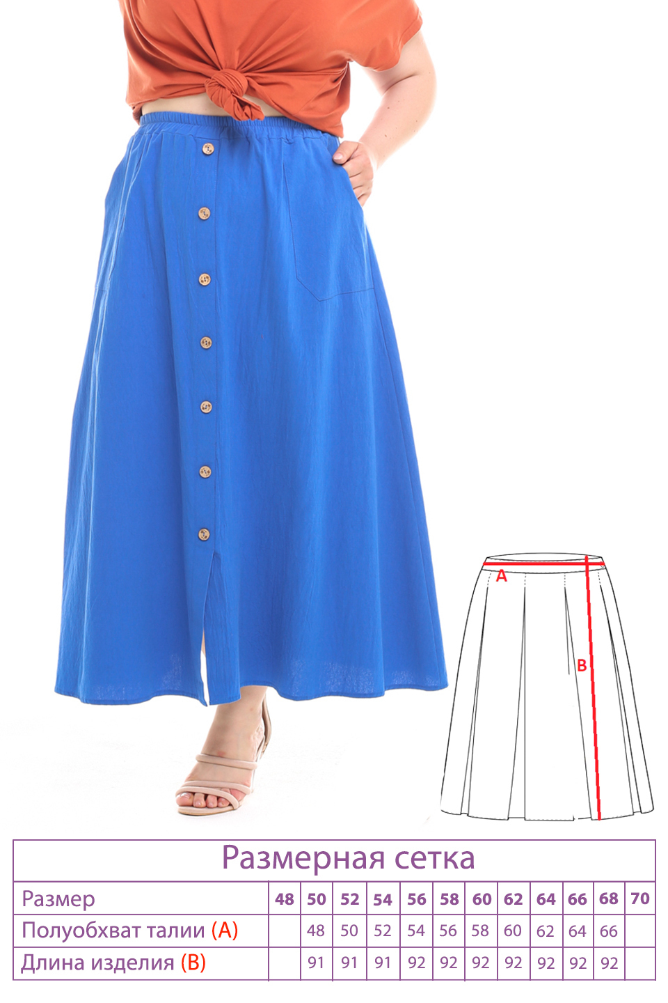 Стильная юбка из мягкой ткани подчеркнет достоинства женской фигуры. широкий притачная резинка по поясу способствует оптимальной посадке по фигуре. расклешенные клинья модели искусно обыгрывают бедра и добавляют образу женственности и романтизма. по бокам практичные карманы. декоративные пуговки по переду добавляют модели нарядности и освежают образ. носить юбку такого плана можно с любимыми футболками, обтягивающими водолазками, блузами и рубашками.