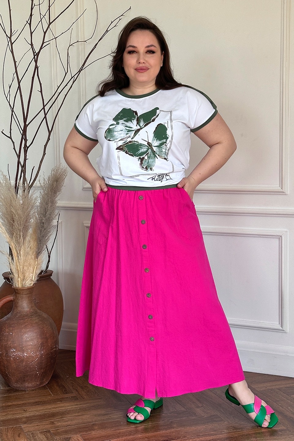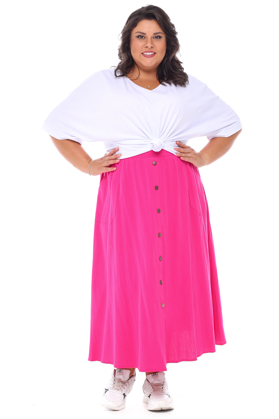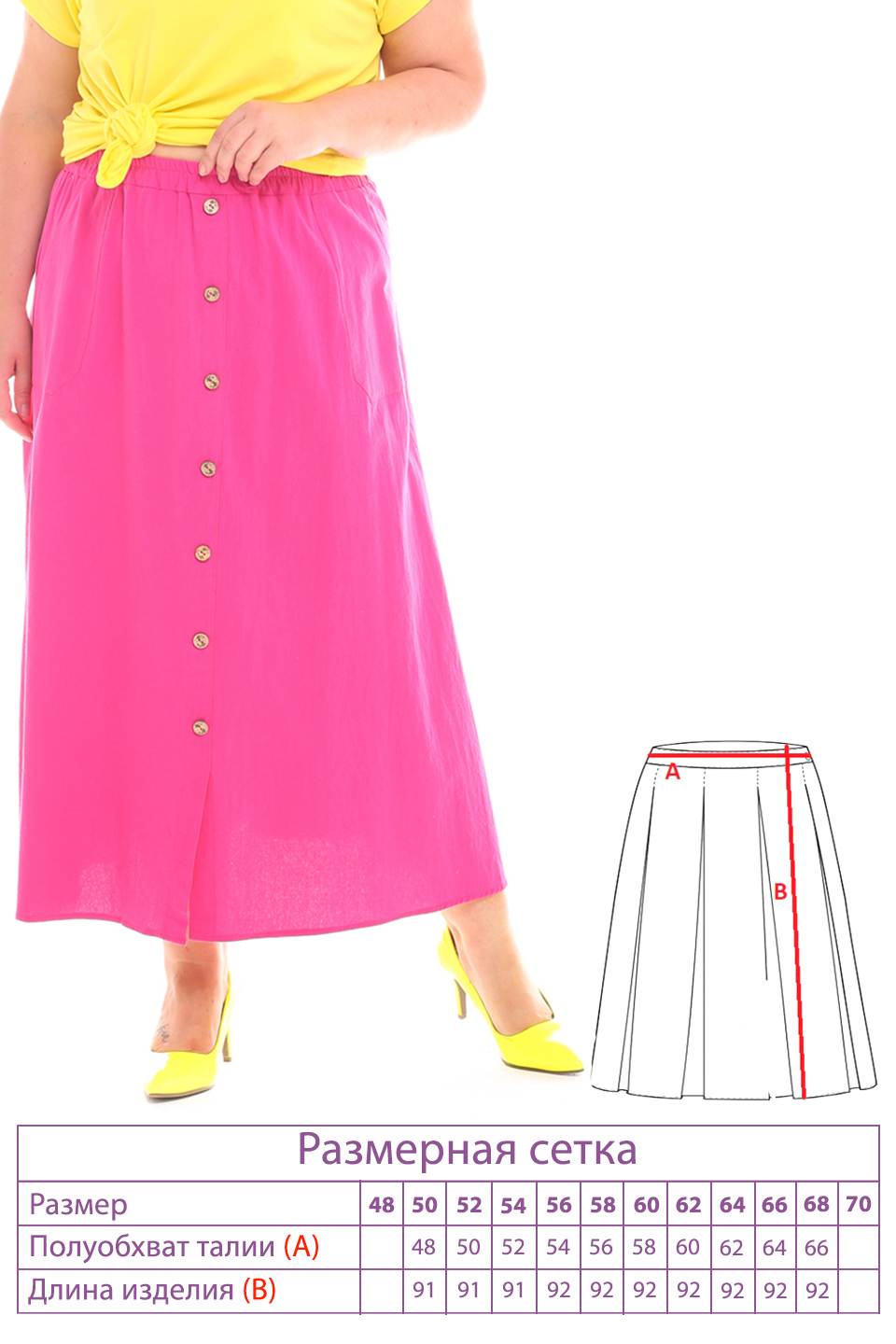 Стильная юбка из мягкой ткани подчеркнет достоинства женской фигуры. широкий притачная резинка по поясу способствует оптимальной посадке по фигуре. расклешенные клинья модели искусно обыгрывают бедра и добавляют образу женственности и романтизма. по бокам практичные карманы. декоративные пуговки по переду добавляют модели нарядности и освежают образ. носить юбку такого плана можно с любимыми футболками, обтягивающими водолазками, блузами и рубашками.
