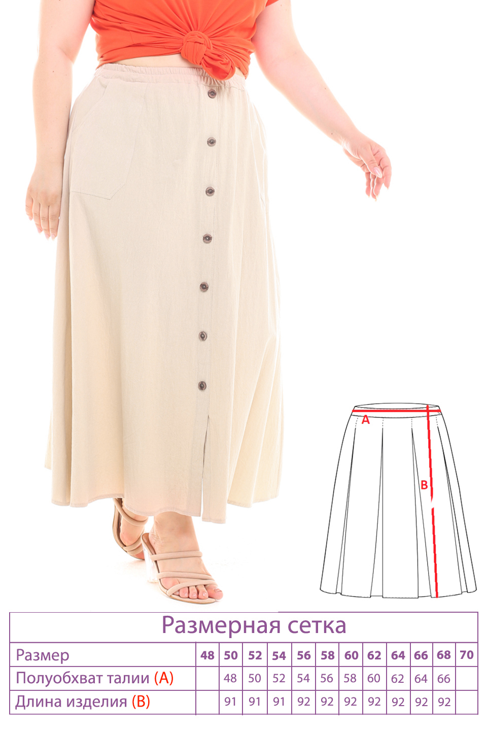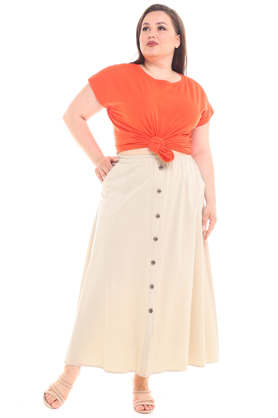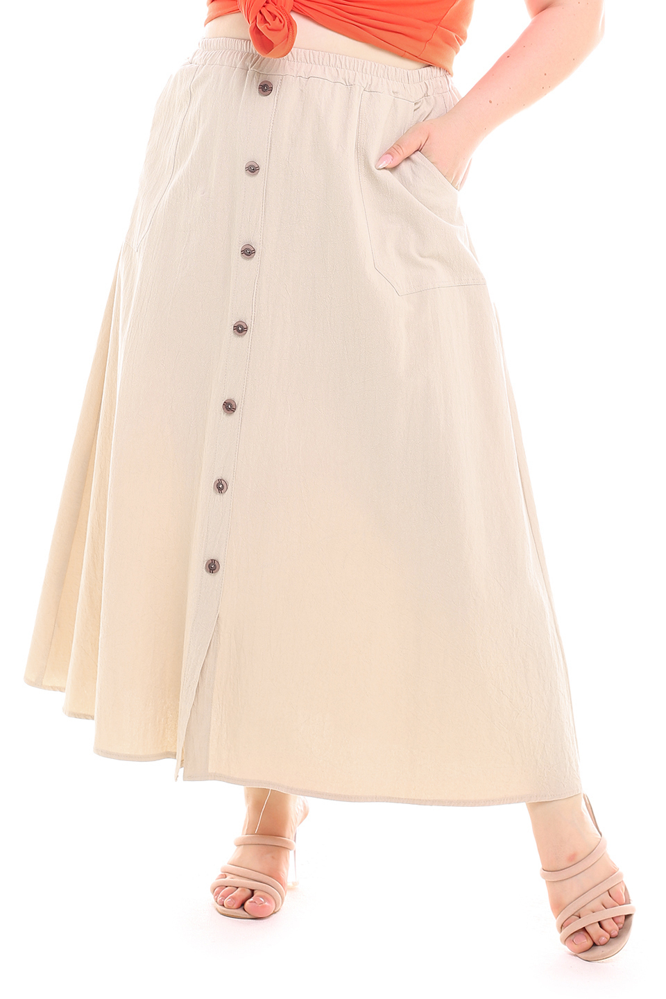 Стильная юбка из мягкой ткани подчеркнет достоинства женской фигуры. широкий притачная резинка по поясу способствует оптимальной посадке по фигуре. расклешенные клинья модели искусно обыгрывают бедра и добавляют образу женственности и романтизма. по бокам практичные карманы. декоративные пуговки по переду добавляют модели нарядности и освежают образ. носить юбку такого плана можно с любимыми футболками, обтягивающими водолазками, блузами и рубашками.